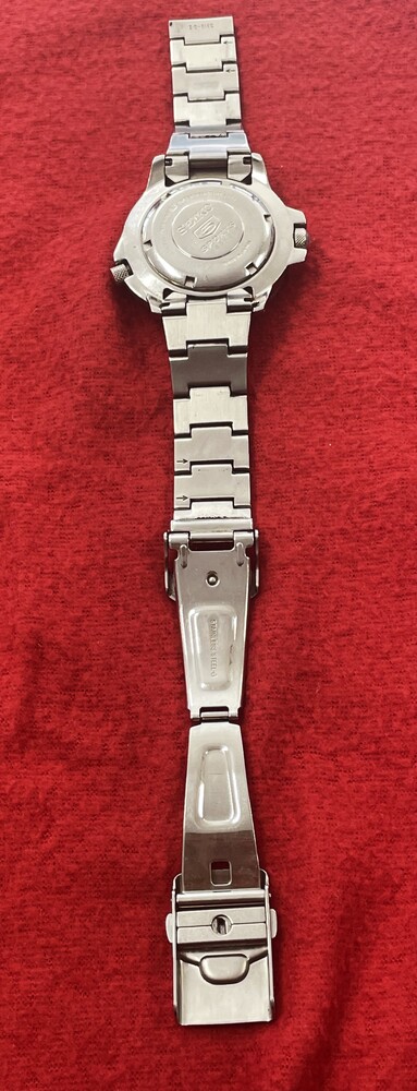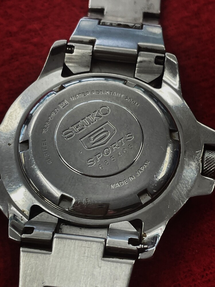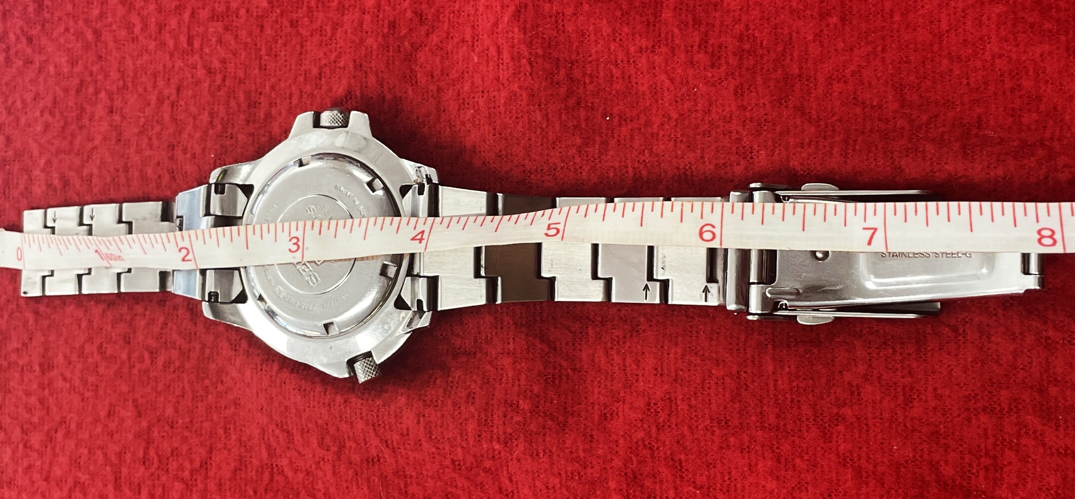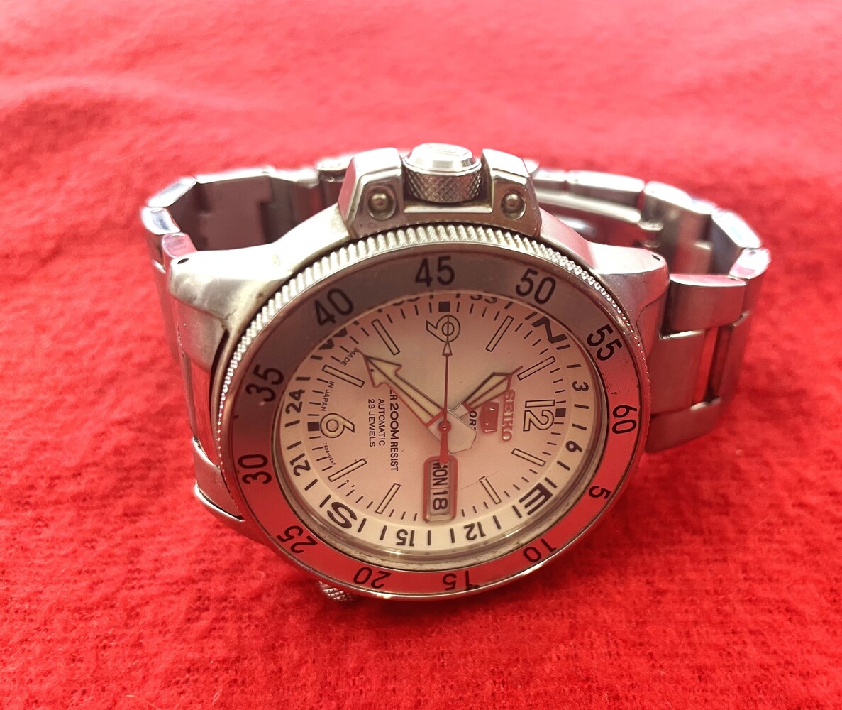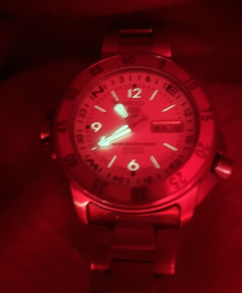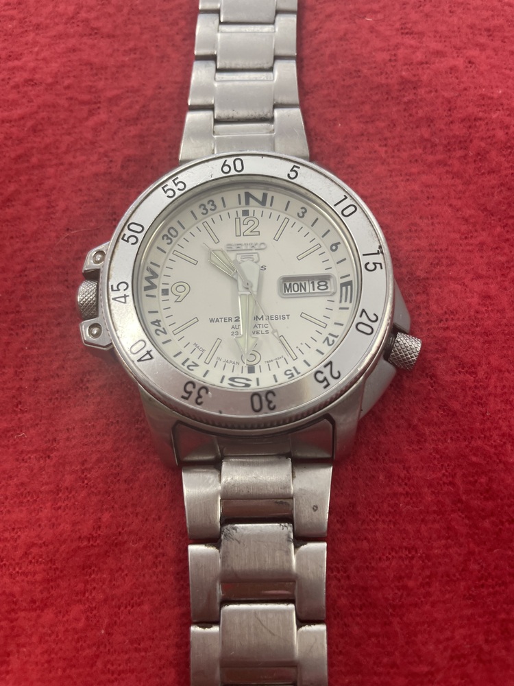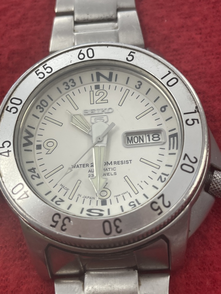 This is a preowned SEIKO 5 Sports 7S36-01E0 Automatic White Dial Band: Fits wrists up to 7 Inches tiny and is tight on a 7 inch wrist -scuffs from normal use. It shows signs of use.. Has Glow in the Dark Hands.