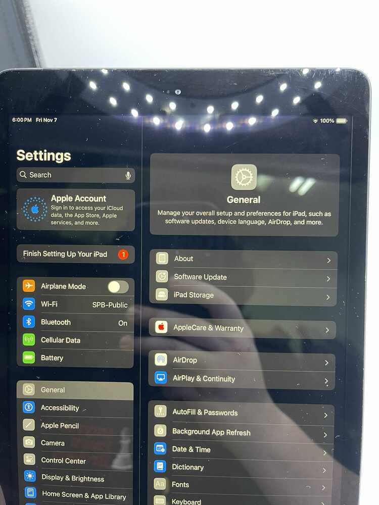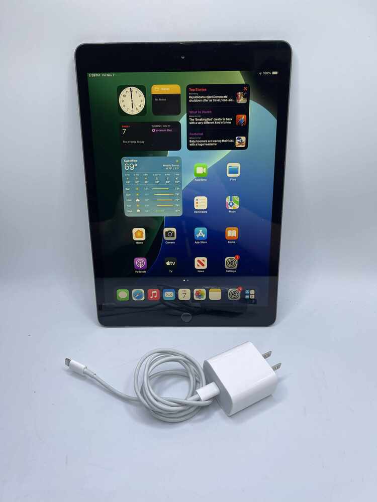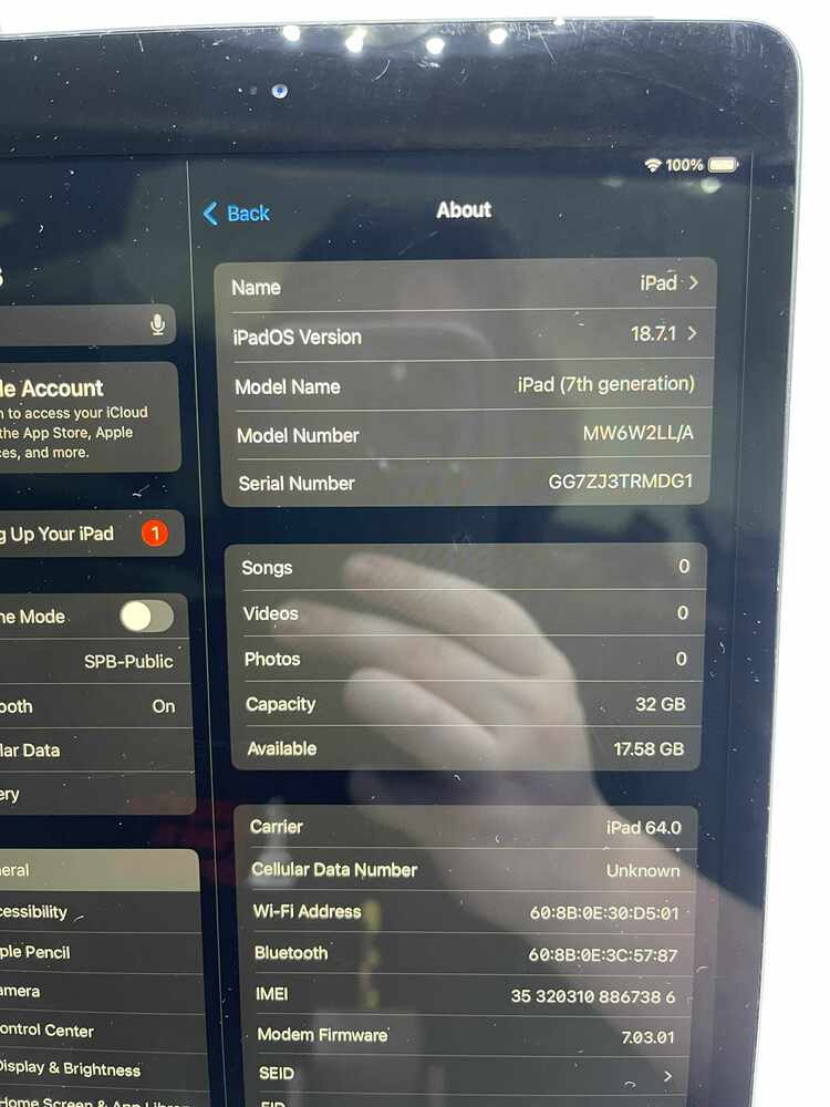 The Apple iPad 7th Gen 32GB Gray is in used condition. The screen has small scratches all over the screen that are hard to picture. The back of the ipad has a small dent under the camera. The iPad comes with charging cord and wall block. The iPad is fully functional and factory reset.