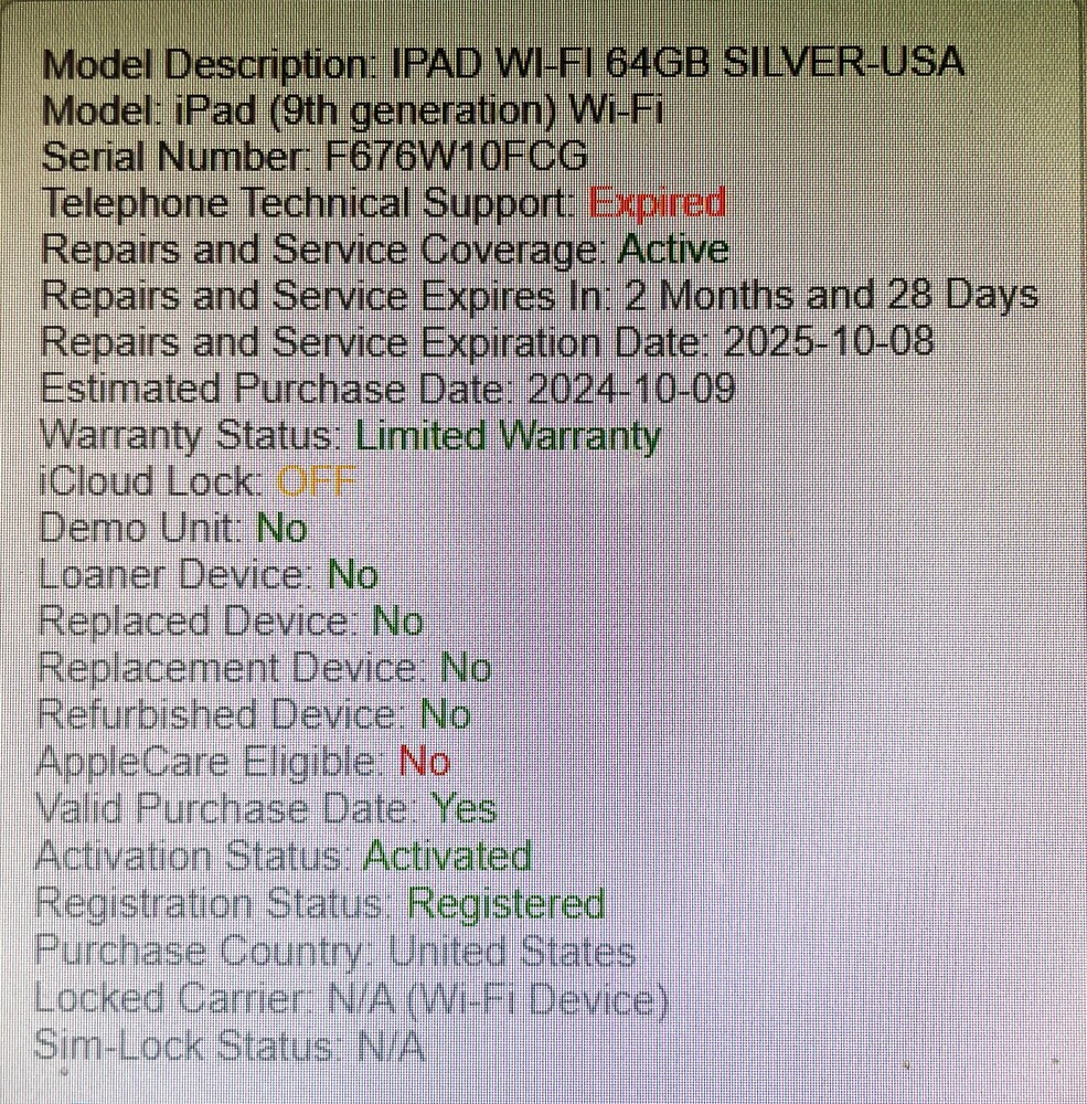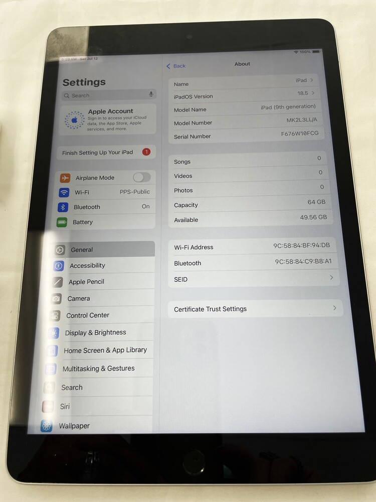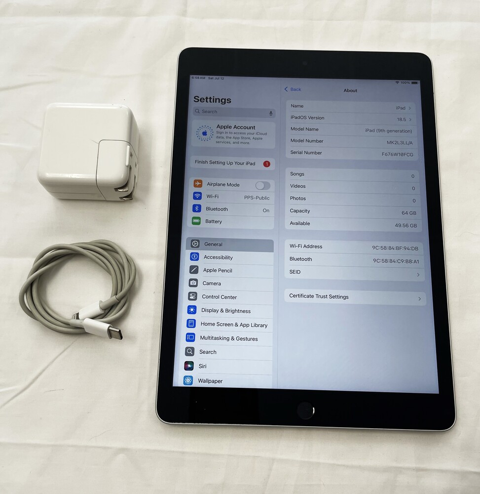 This is a preowned Apple iPad 9th Gen 10.2" (A2602) Wi-Fi, 64GB with Charge Cable and Brick . Ipad has been Factory Reset and Tested - Space Gray in Color and in very nice condition. This Apple IPad is in good condition. It will show moderate signs of use including scratching and/or scuffs/dings/dents.