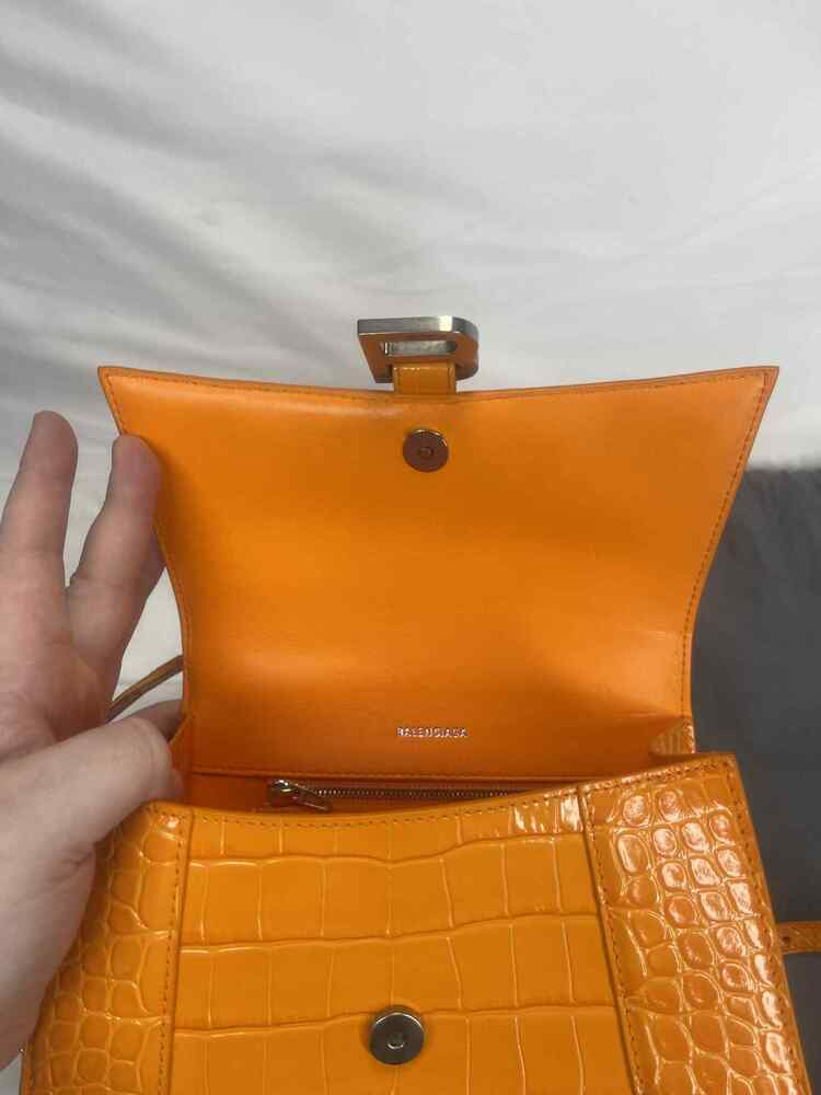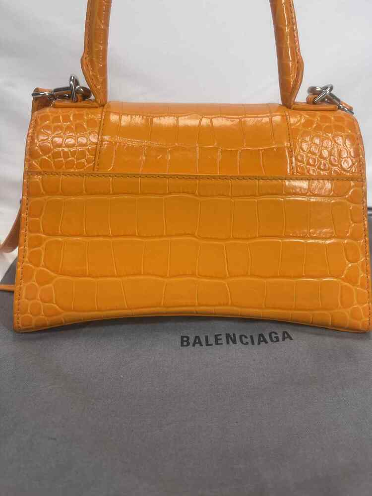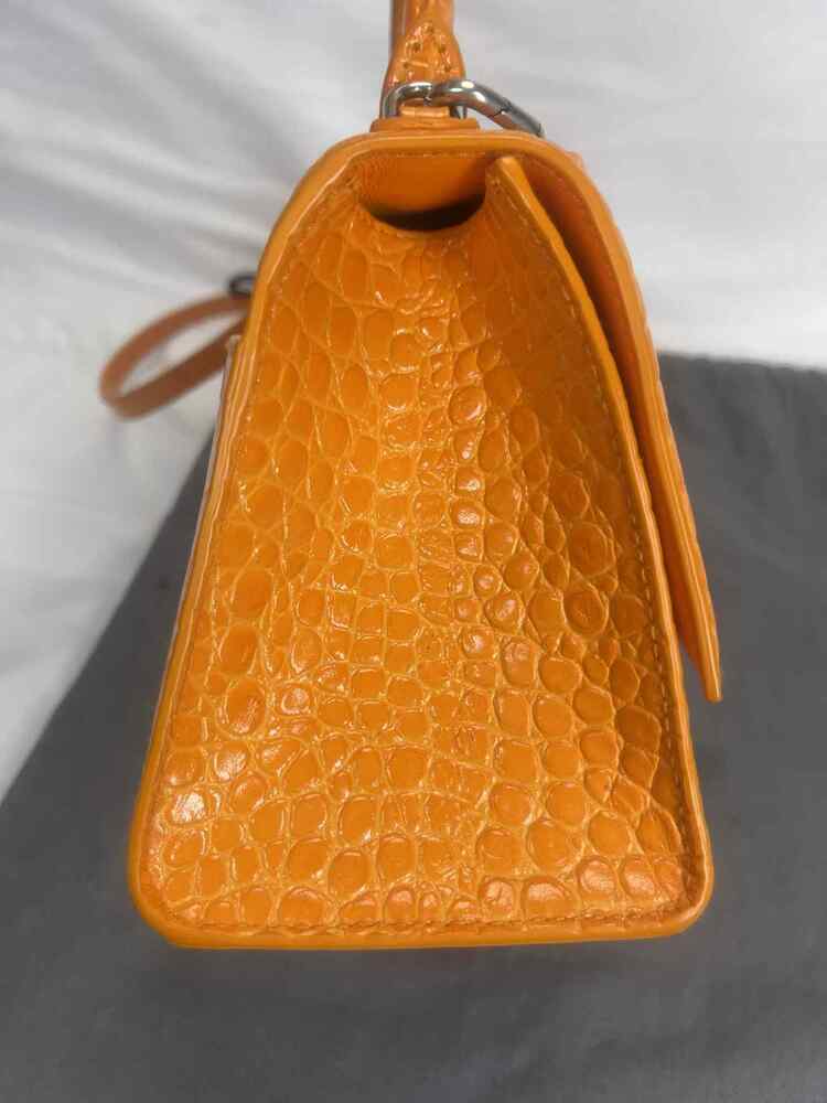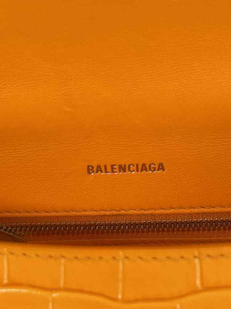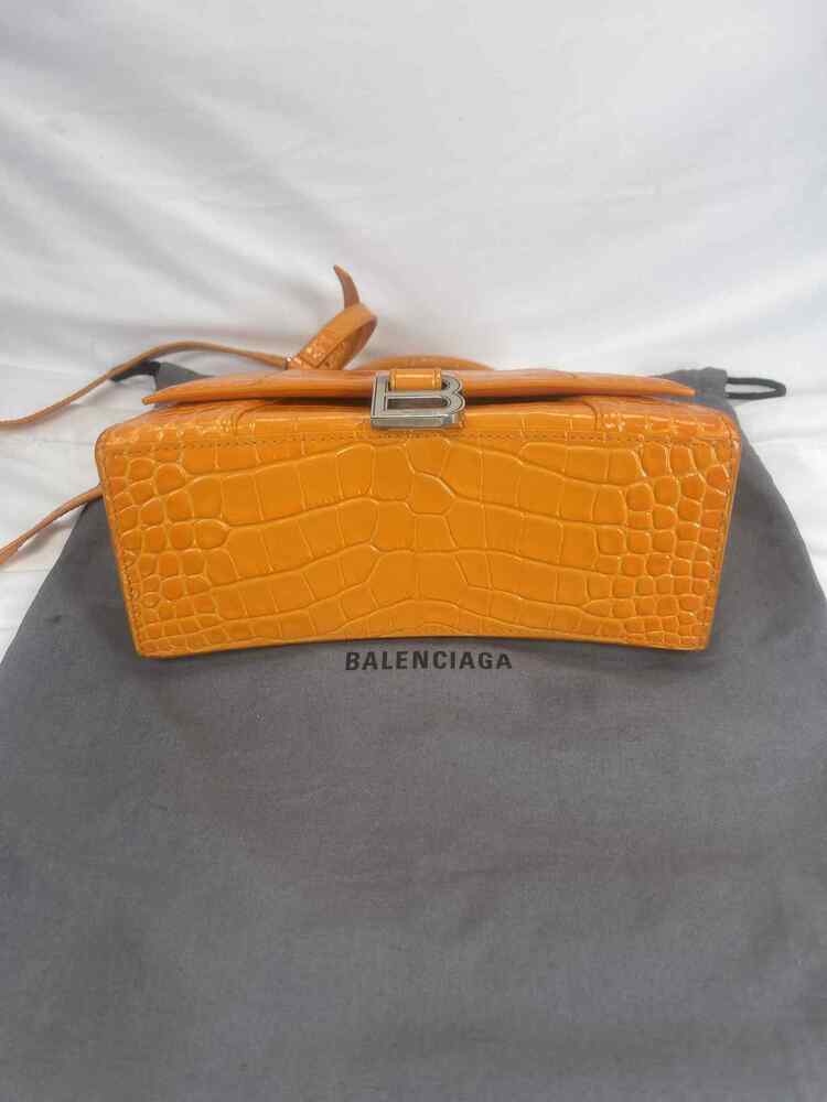 The Balenciaga Hourglass Top Handle Bag Crocodile Embossed Small is in used condition. The exterior of the bag has wear on the bottom left side. The handle and strap are in good condition. The interior of the bag has sratches and scuffs. The bag comes with dustbag and a COA from Entrupy. The overall condition of the bag is a (B+).