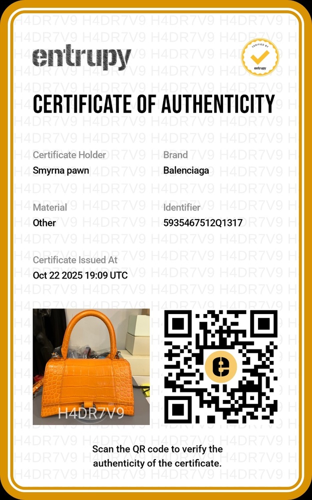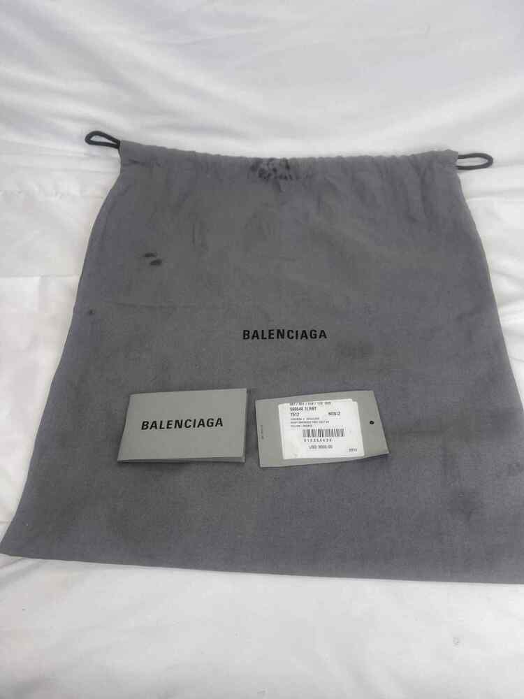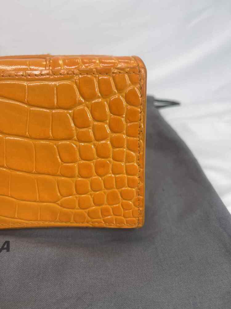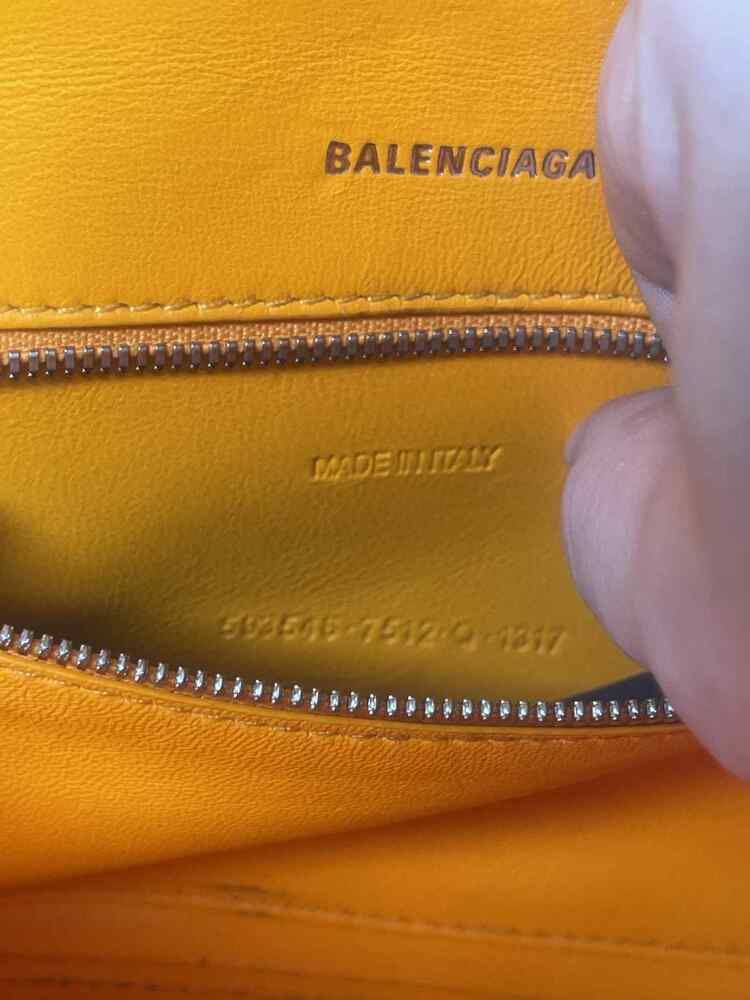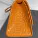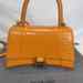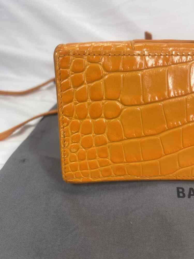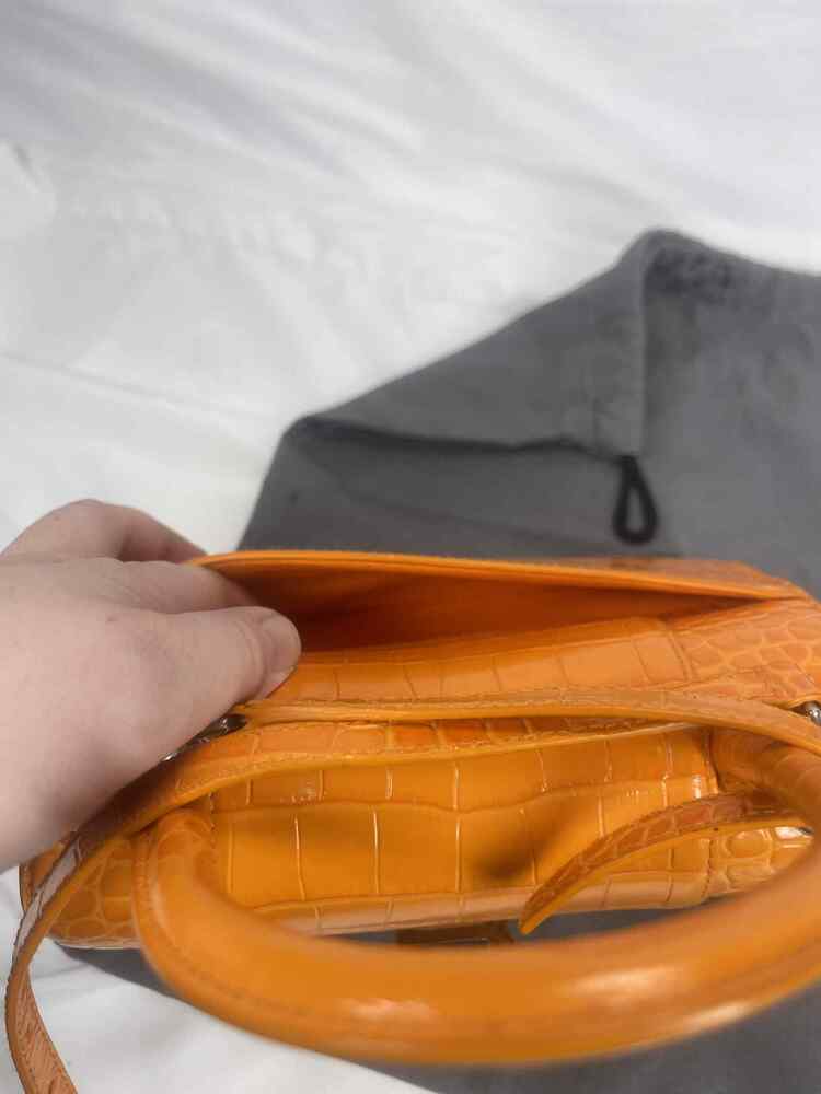 The Balenciaga Hourglass Top Handle Bag Crocodile Embossed Small is in used condition. The exterior of the bag has wear on the bottom left side. The handle and strap are in good condition. The interior of the bag has sratches and scuffs. The bag comes with dustbag and a COA from Entrupy. The overall condition of the bag is a (B+).