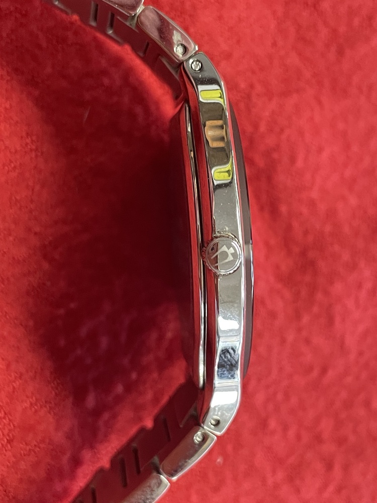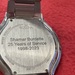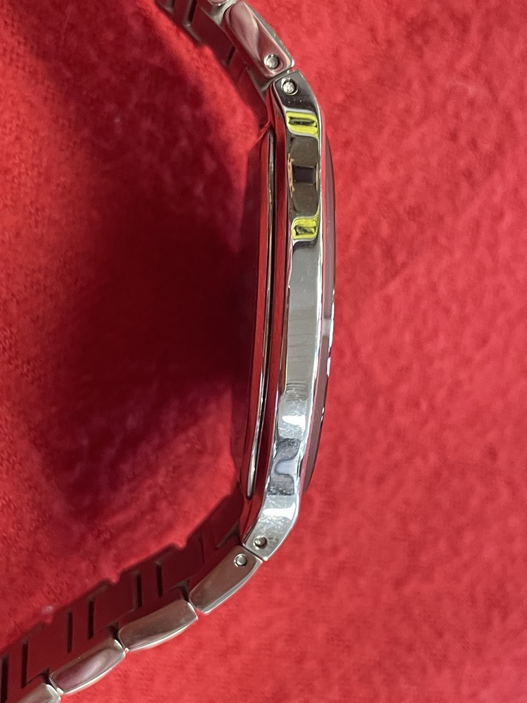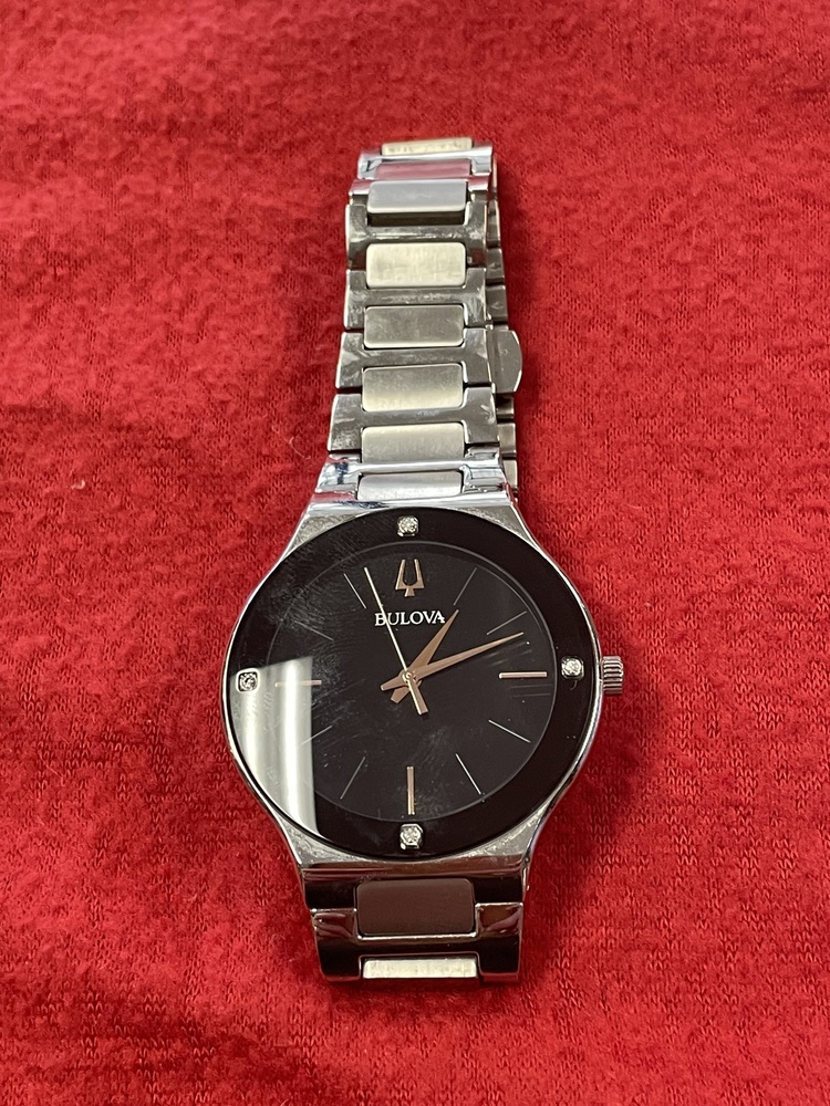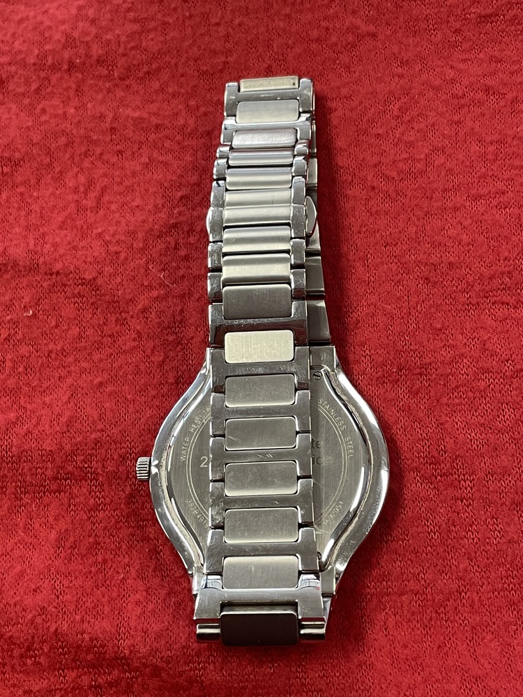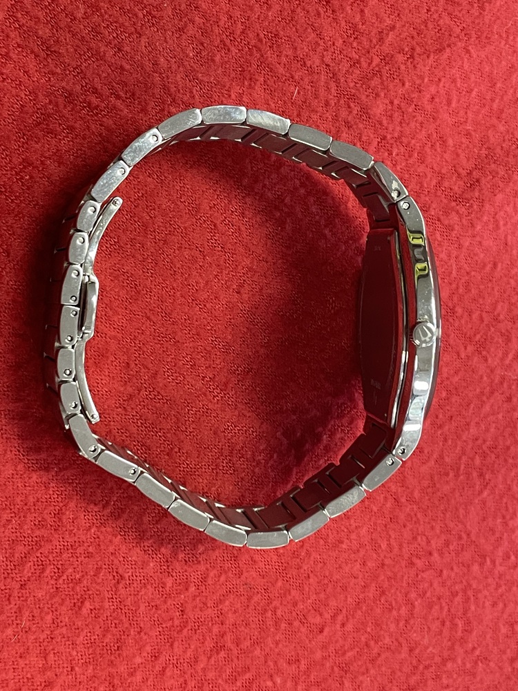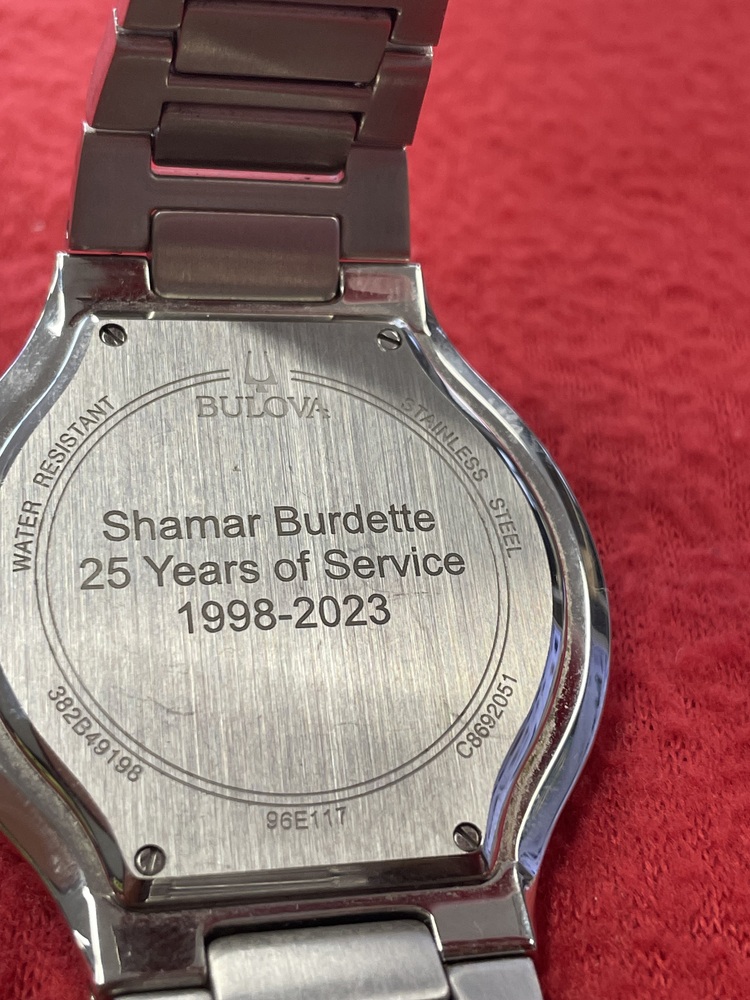 This is a very nice preowned watch does show some very lite signs of usage . ( Please See Pictures ) Will fit up to an 8 inch wrist . Does have engraving on the back of the watch case.