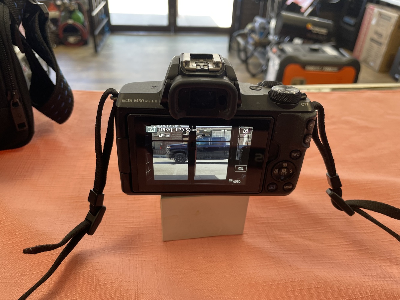 This is a Preowned Canon EOS M50 Camera with 15-45mm Lens in Samsonite Bag comes with Battery and Charger also. Camera has been Factory Reset. NOTE! Camera does have a spot on the right hand upper corner as shown in the pictures. Otherwise camera is in good condition.