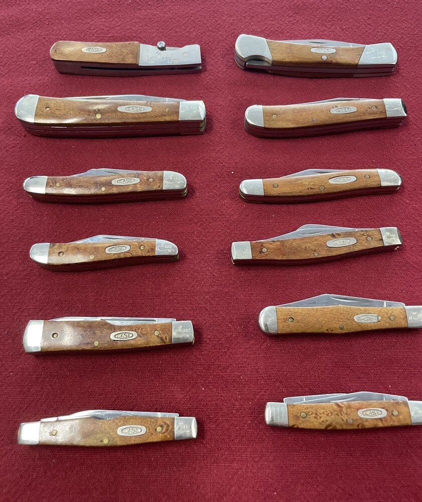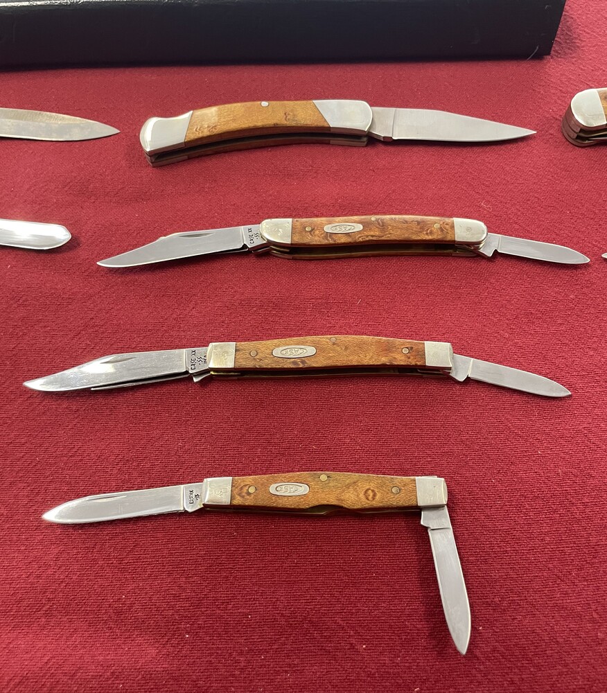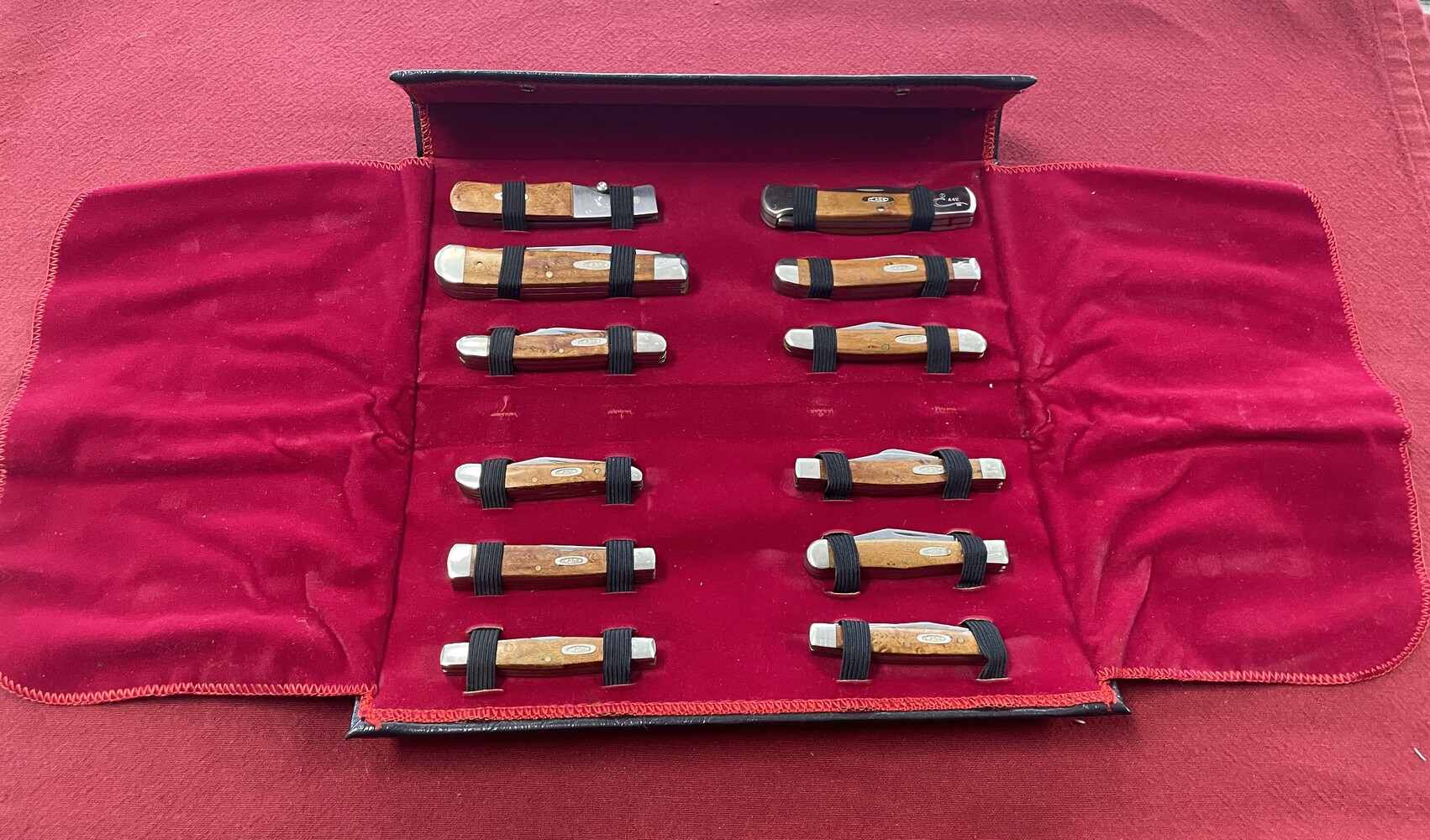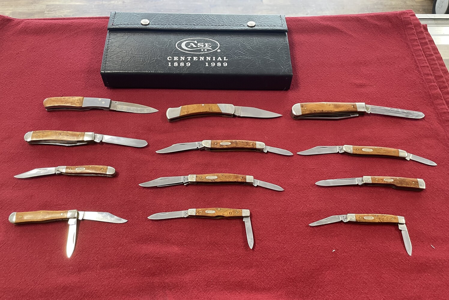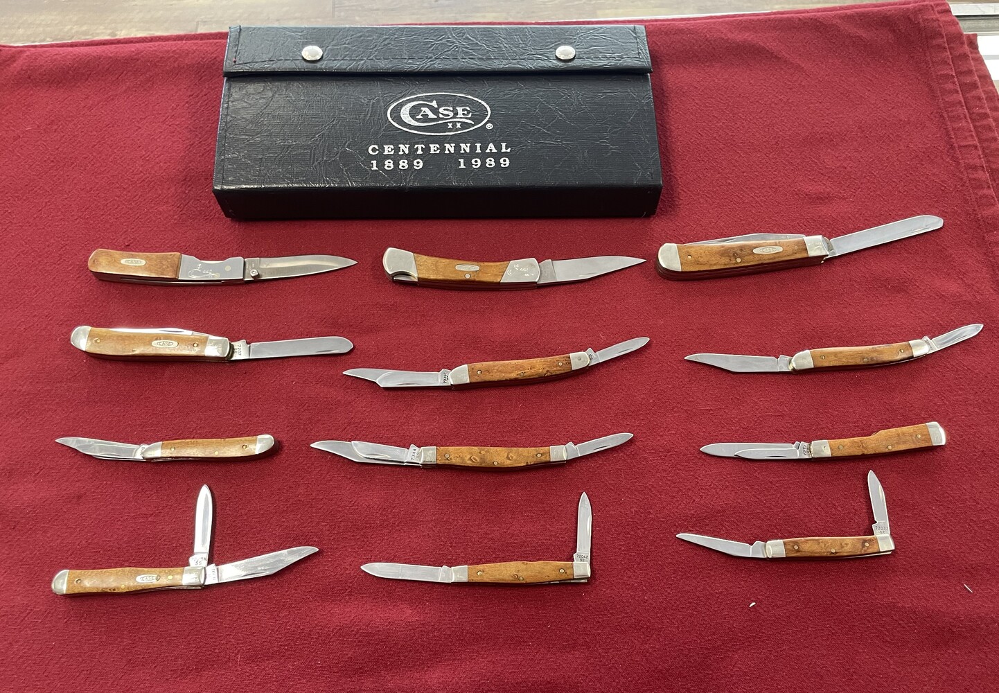 This is a preowned New Old Stock Set. This is a beautiful Vintage 1989 100 Year Centennial Case XX Curly Maple Wood Handle Knife Set. This Centennial Set of 12 knives is set #442/750, and the serial number of each knife is surrounded by a long tail C design which is a registered trade mark for W.R. Case. This set includes models 7110L SS, 71405L SS, 7254 SS, 7207 SS, 73087 SS, 72087 SS, 7220 SS, 7344 SS, 7215 SS, 7225 1/2 SS, 72042 SS and 72033 SS. These knives are in mint condition, and in their original collectible case. These Knives didn't come with individual boxes. This is a 12 knife set that was produced in 1989 to commemorate 100 years of the Case XX Brand. Only 750 of these sets were produced. Don't wait on this opportunity to own this classic collectible.