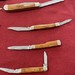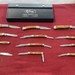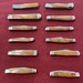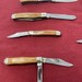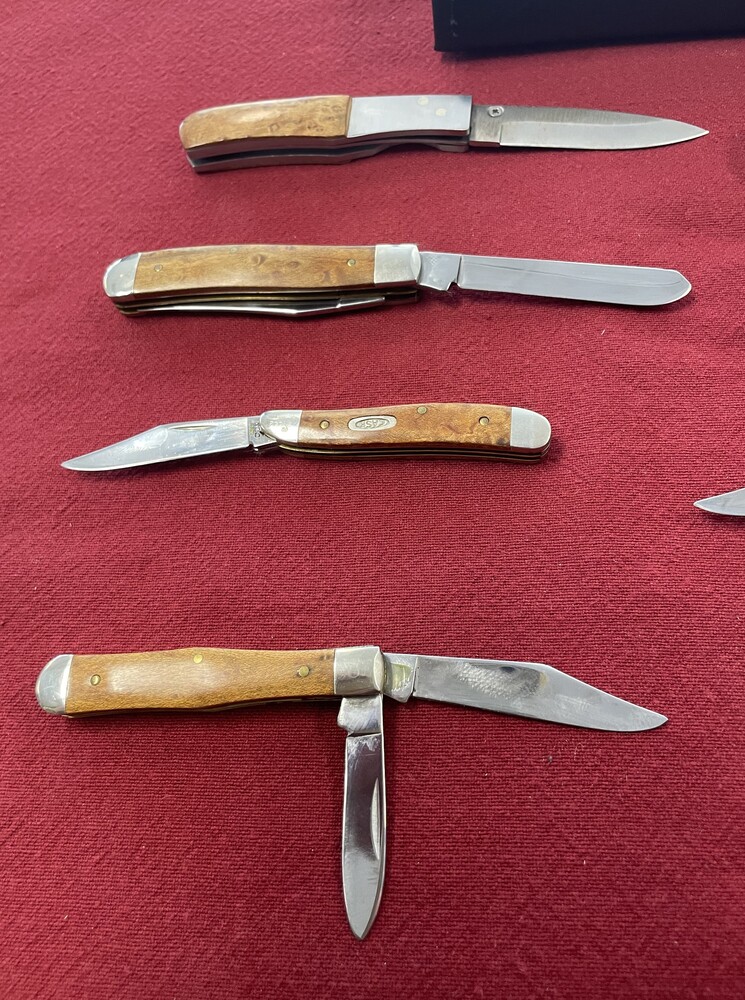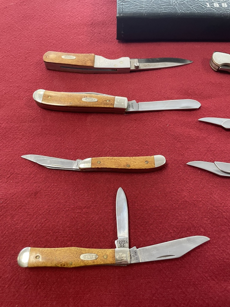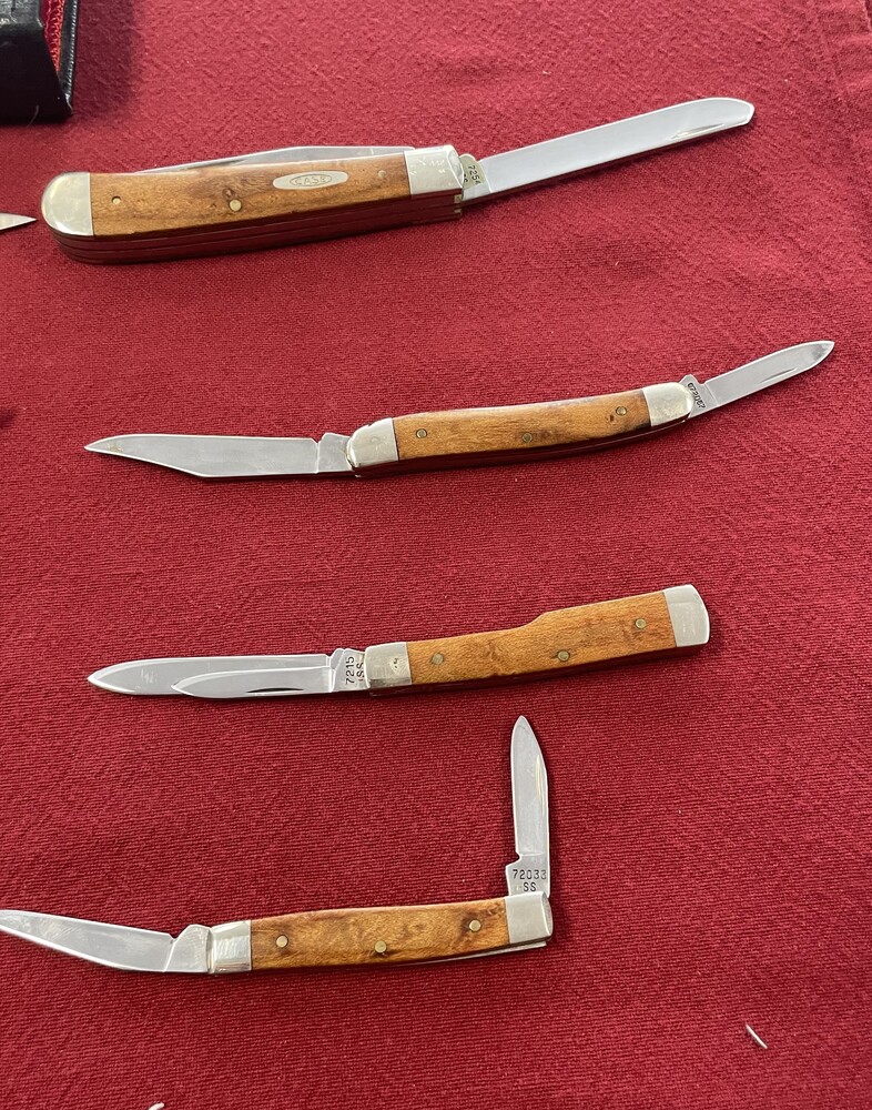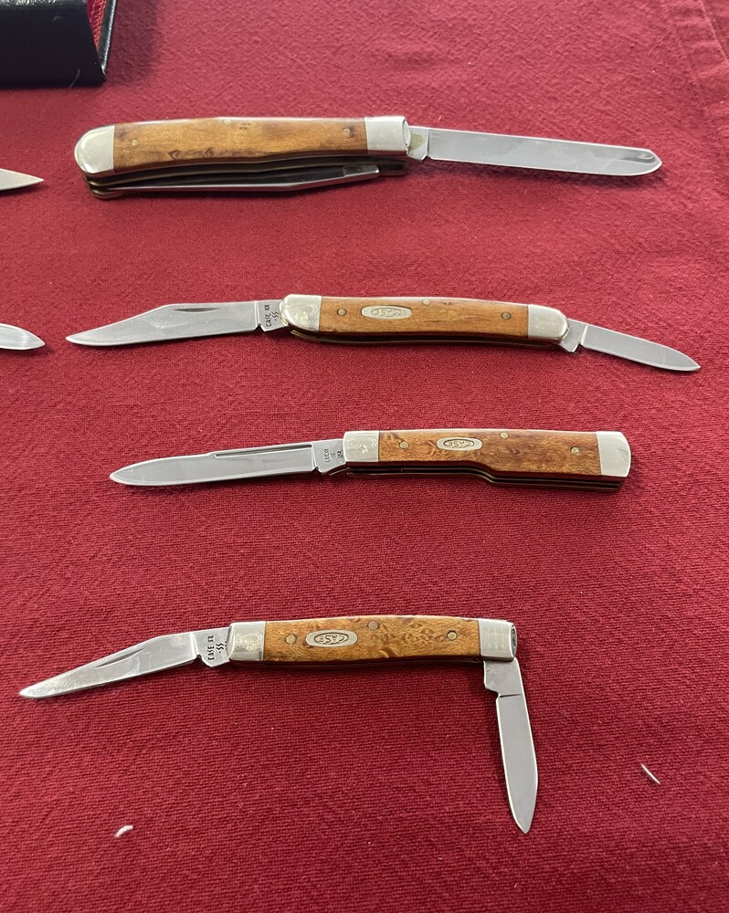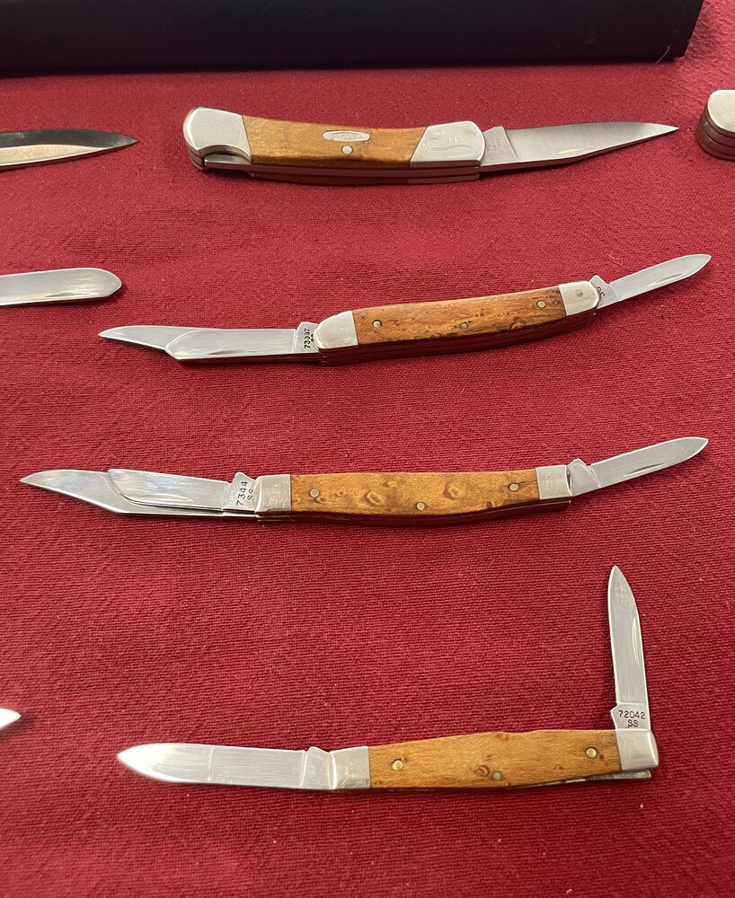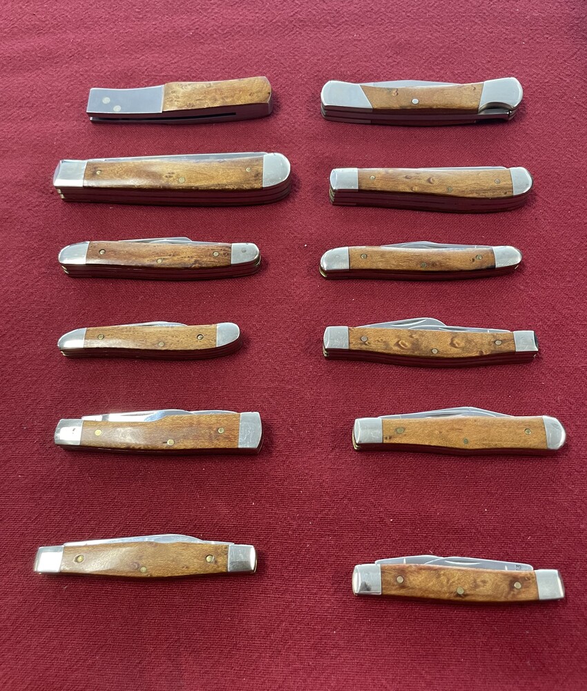 This is a preowned New Old Stock Set. This is a beautiful Vintage 1989 100 Year Centennial Case XX Curly Maple Wood Handle Knife Set. This Centennial Set of 12 knives is set #442/750, and the serial number of each knife is surrounded by a long tail C design which is a registered trade mark for W.R. Case. This set includes models 7110L SS, 71405L SS, 7254 SS, 7207 SS, 73087 SS, 72087 SS, 7220 SS, 7344 SS, 7215 SS, 7225 1/2 SS, 72042 SS and 72033 SS. These knives are in mint condition, and in their original collectible case. These Knives didn't come with individual boxes. This is a 12 knife set that was produced in 1989 to commemorate 100 years of the Case XX Brand. Only 750 of these sets were produced. Don't wait on this opportunity to own this classic collectible.