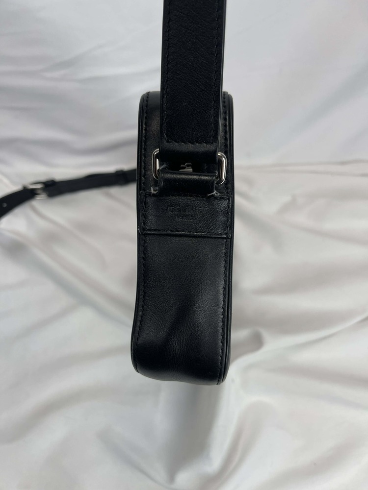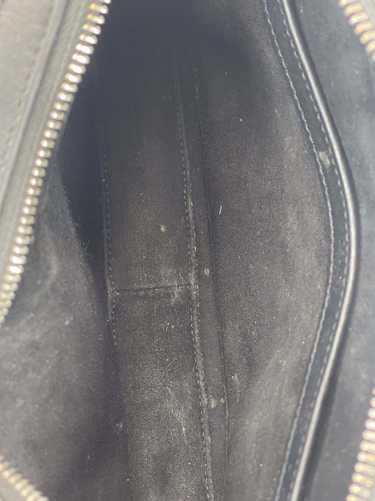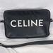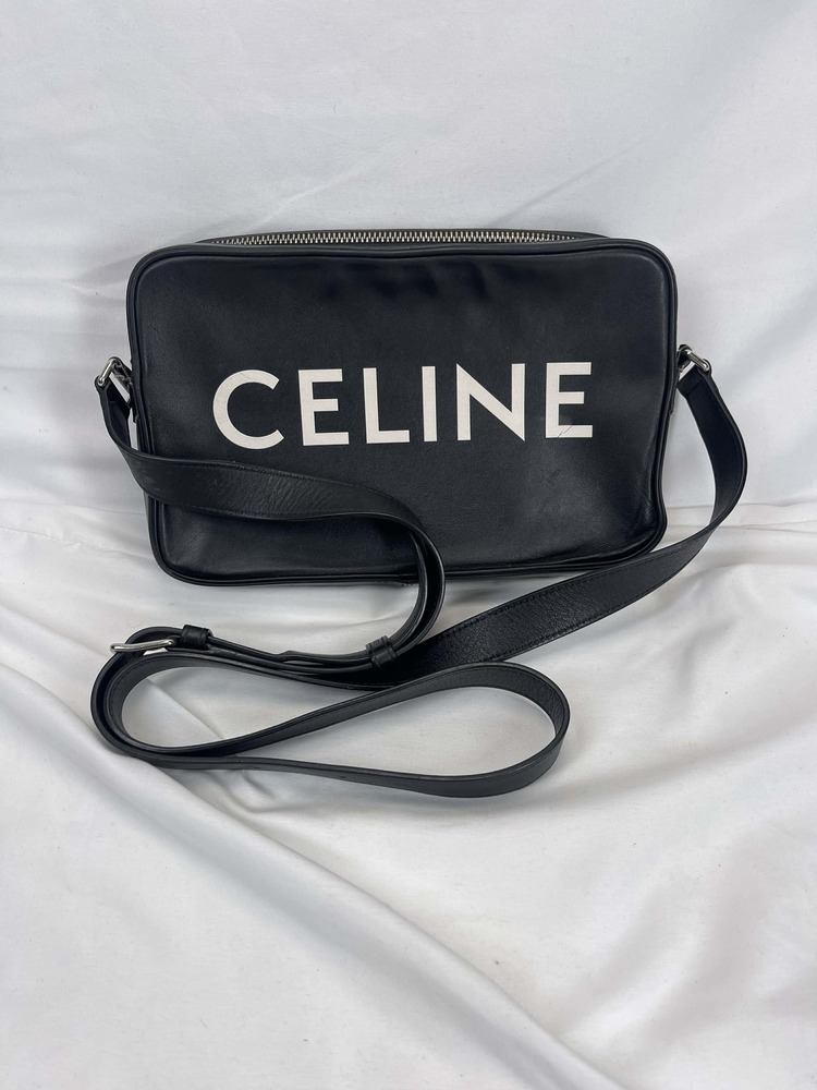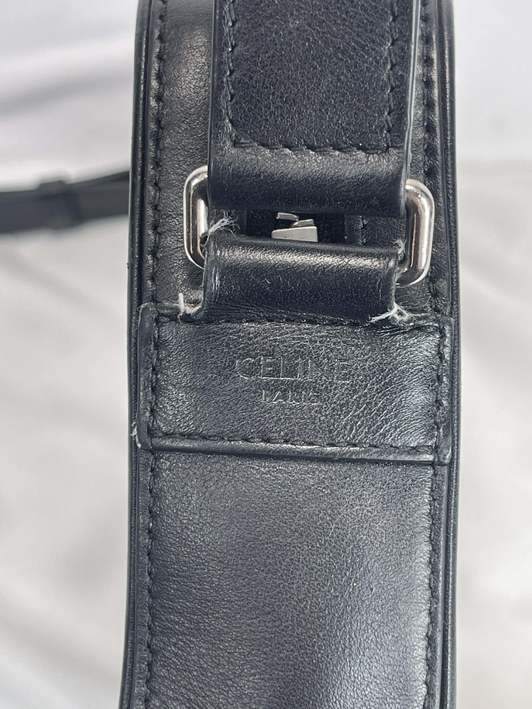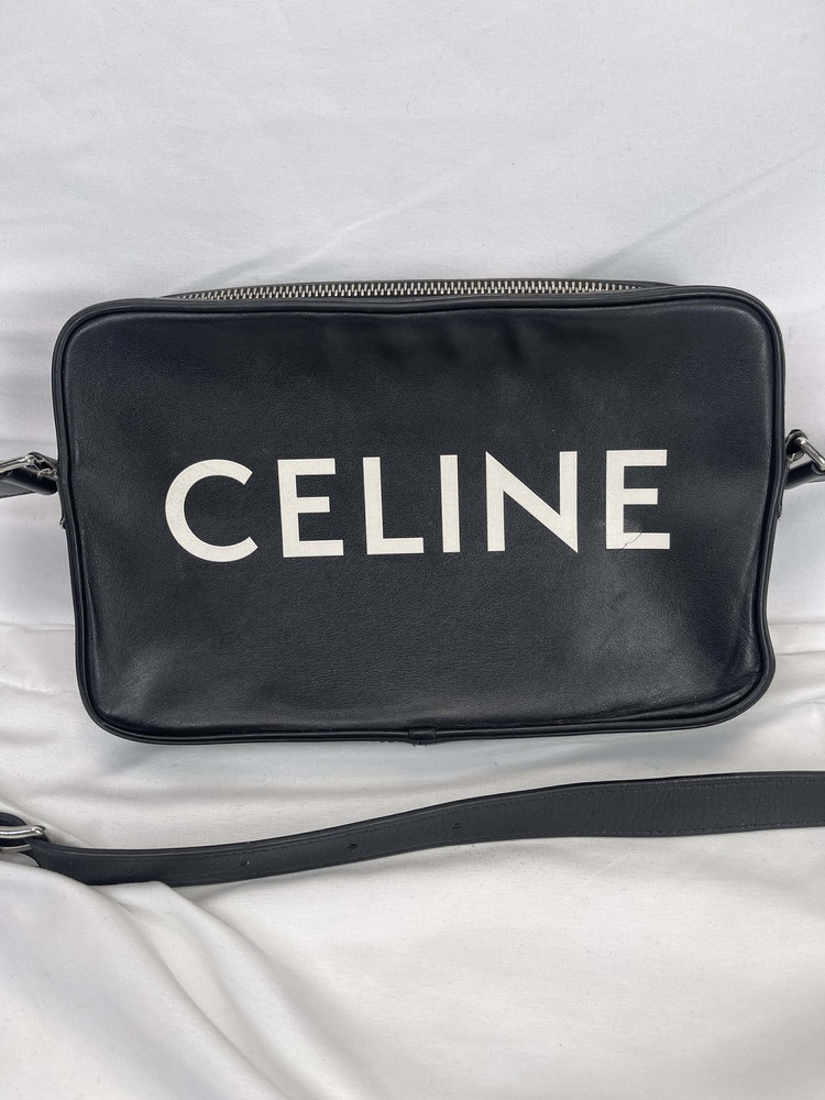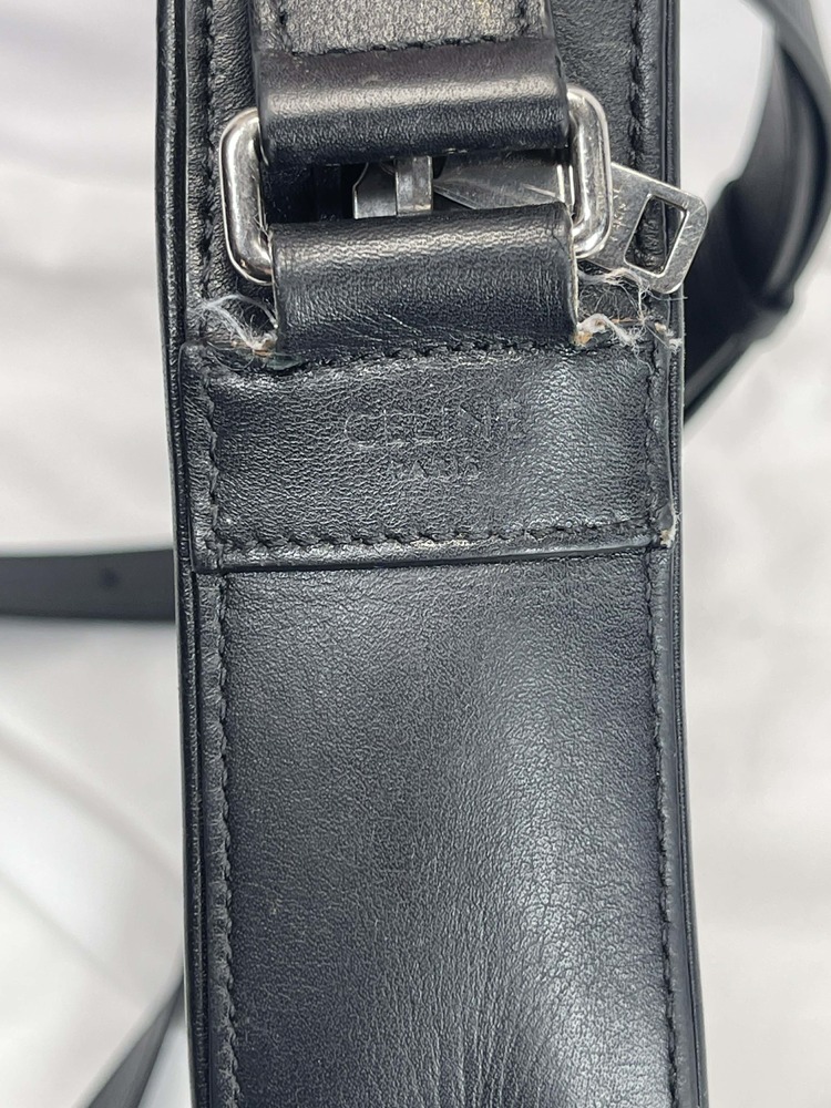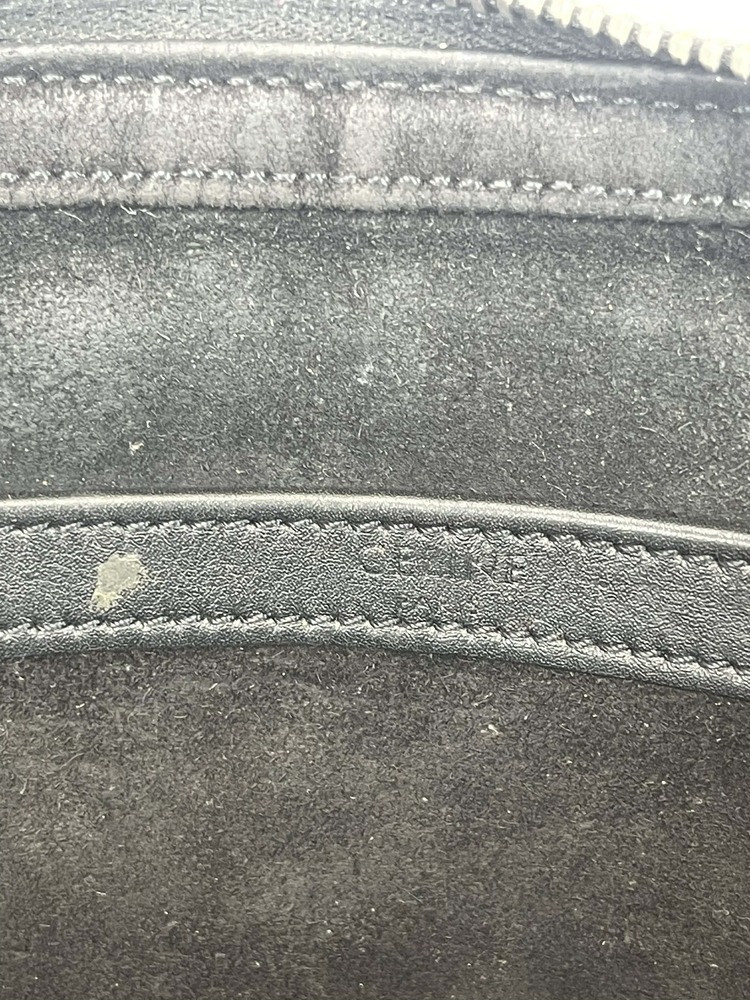 The Celine Medium Messenger Bag In Smooth Calfskin With Celine Print is in used condition. The exterior of the bag has multiple scuffs and scratches. The last "E" in Celine has cracking at the bottom. The crossbody strap has stains and wear. The interior of the bag has multiple stains. The overall condition of the bag is a (C).