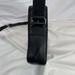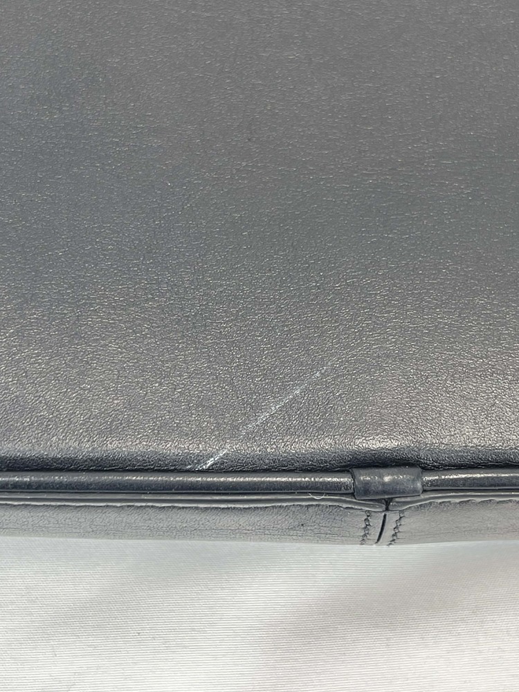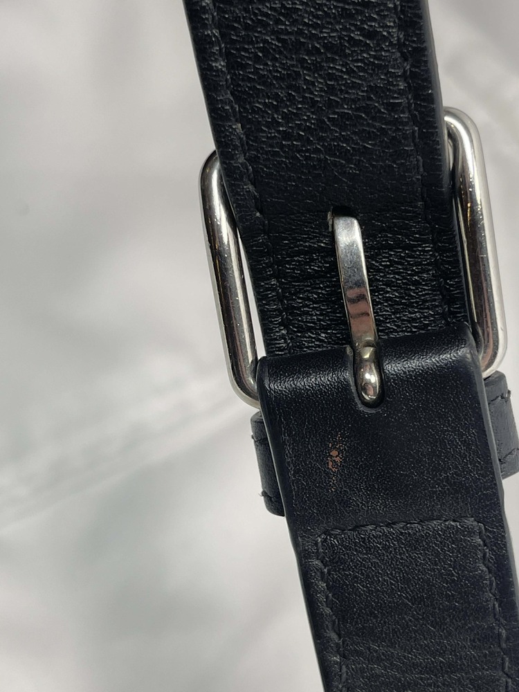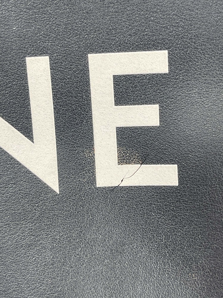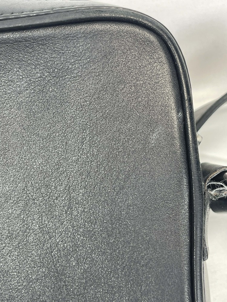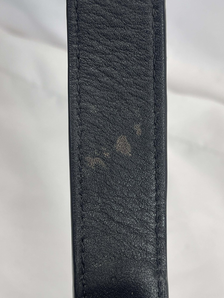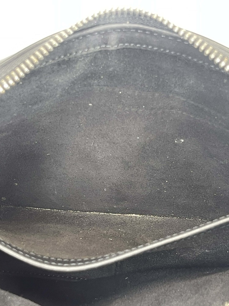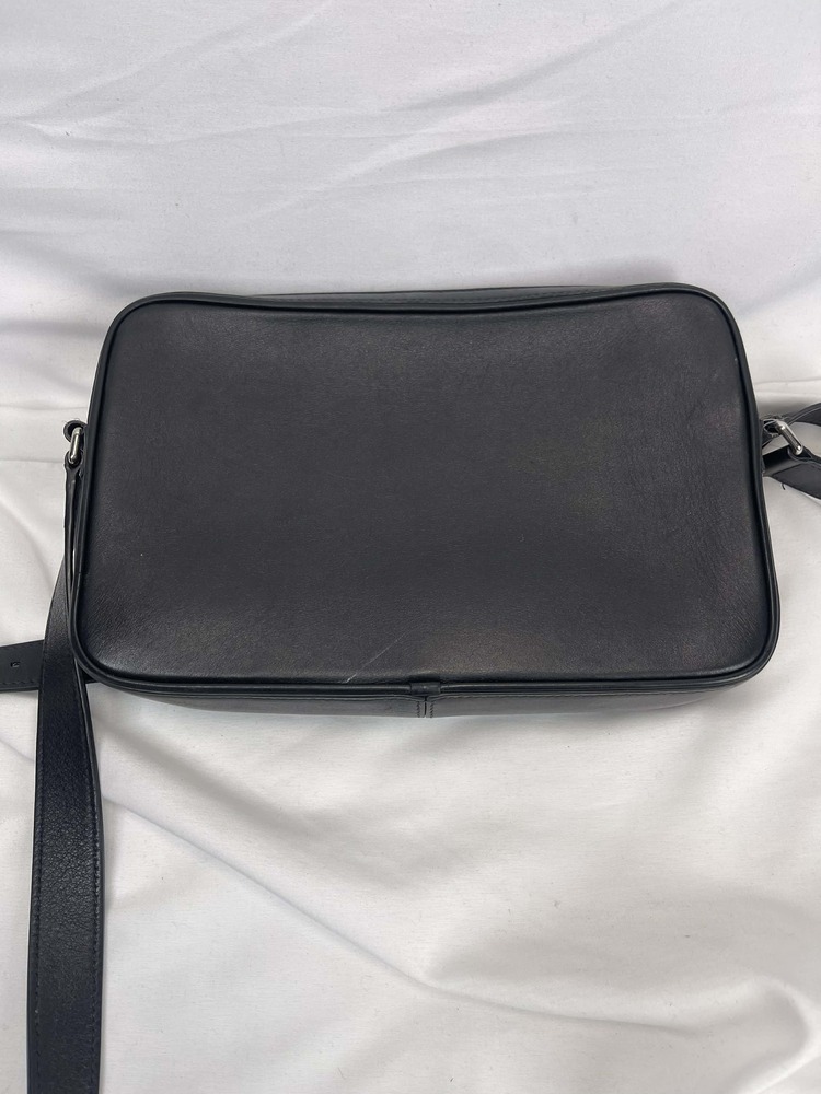 The Celine Medium Messenger Bag In Smooth Calfskin With Celine Print is in used condition. The exterior of the bag has multiple scuffs and scratches. The last "E" in Celine has cracking at the bottom. The crossbody strap has stains and wear. The interior of the bag has multiple stains. The overall condition of the bag is a (C).