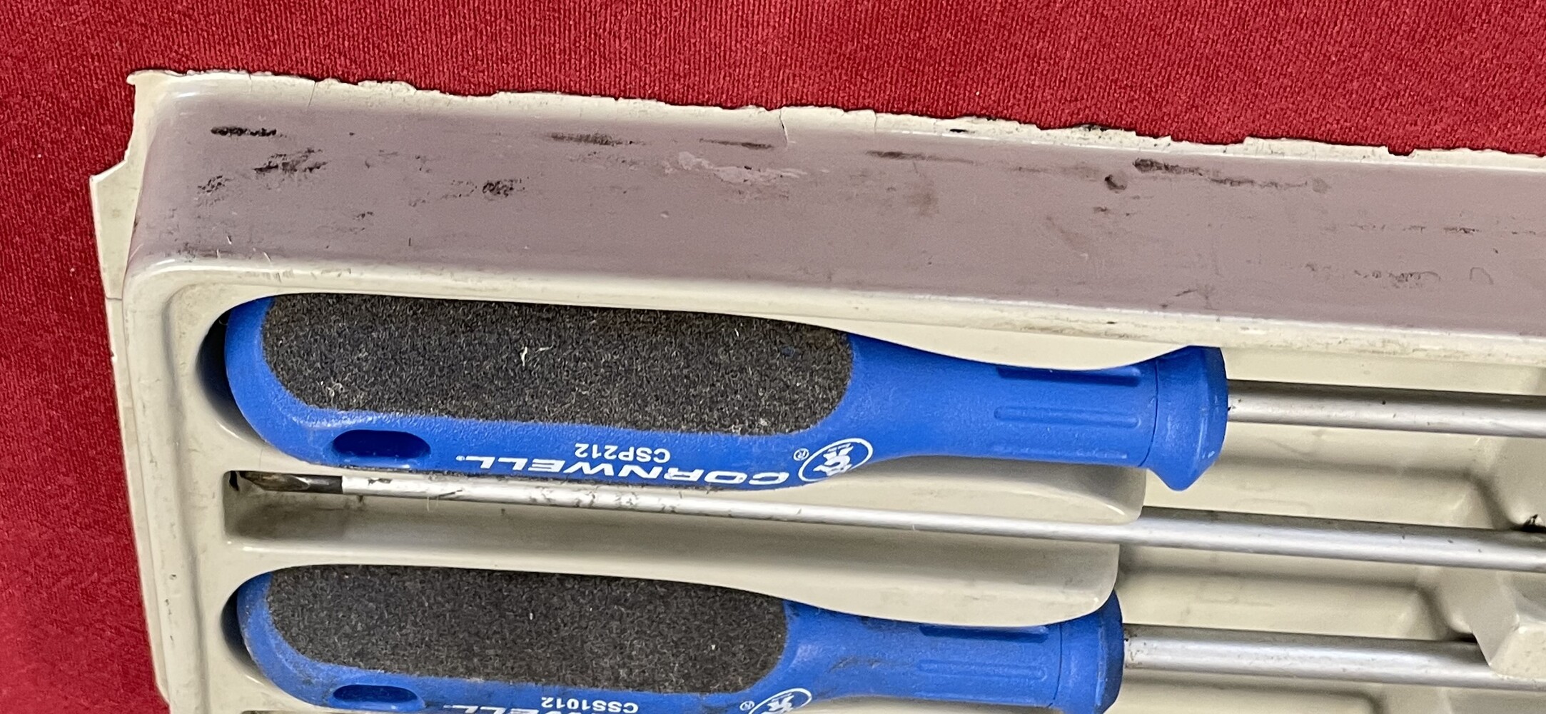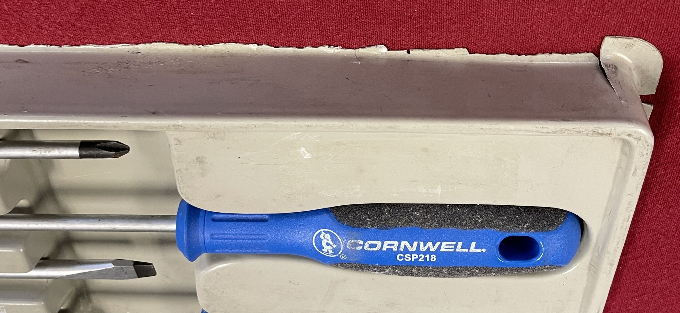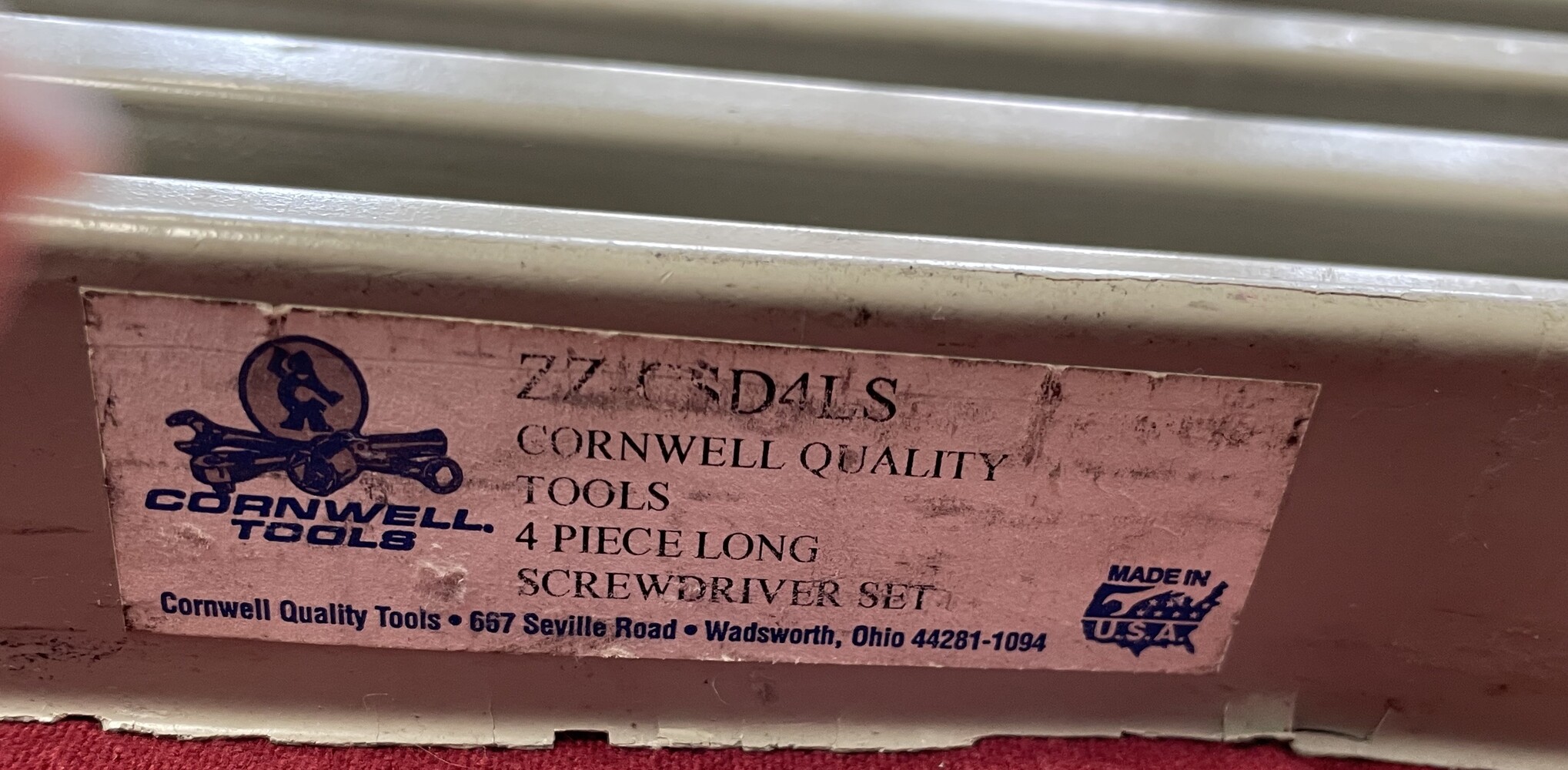 This is a preowned Cornwell Tools 5 PC Set. Screw Drivers CPS2018 - CSS1018 - CSS1012 & CPS212 Pluse Tray ( Tray Show lots of wear and tear) Screw Drivers all in good working condition. 2 flathead and 2 phillips screwdrivers long handle.