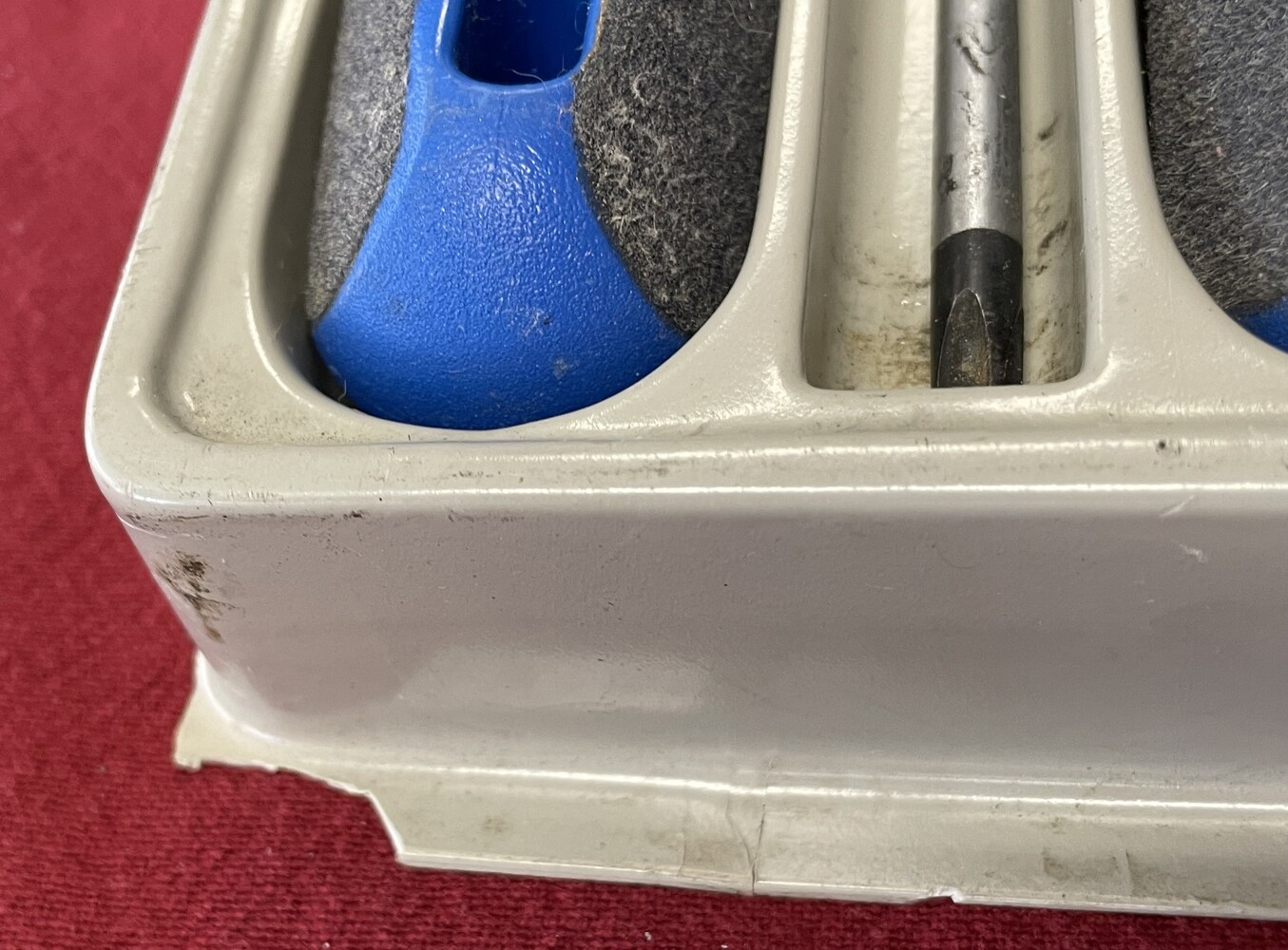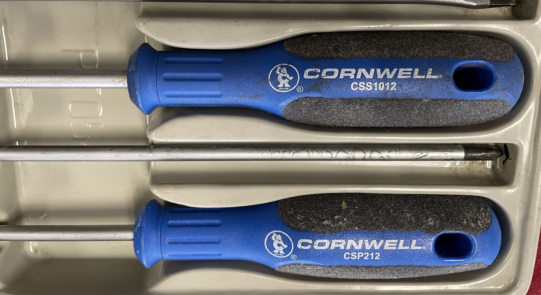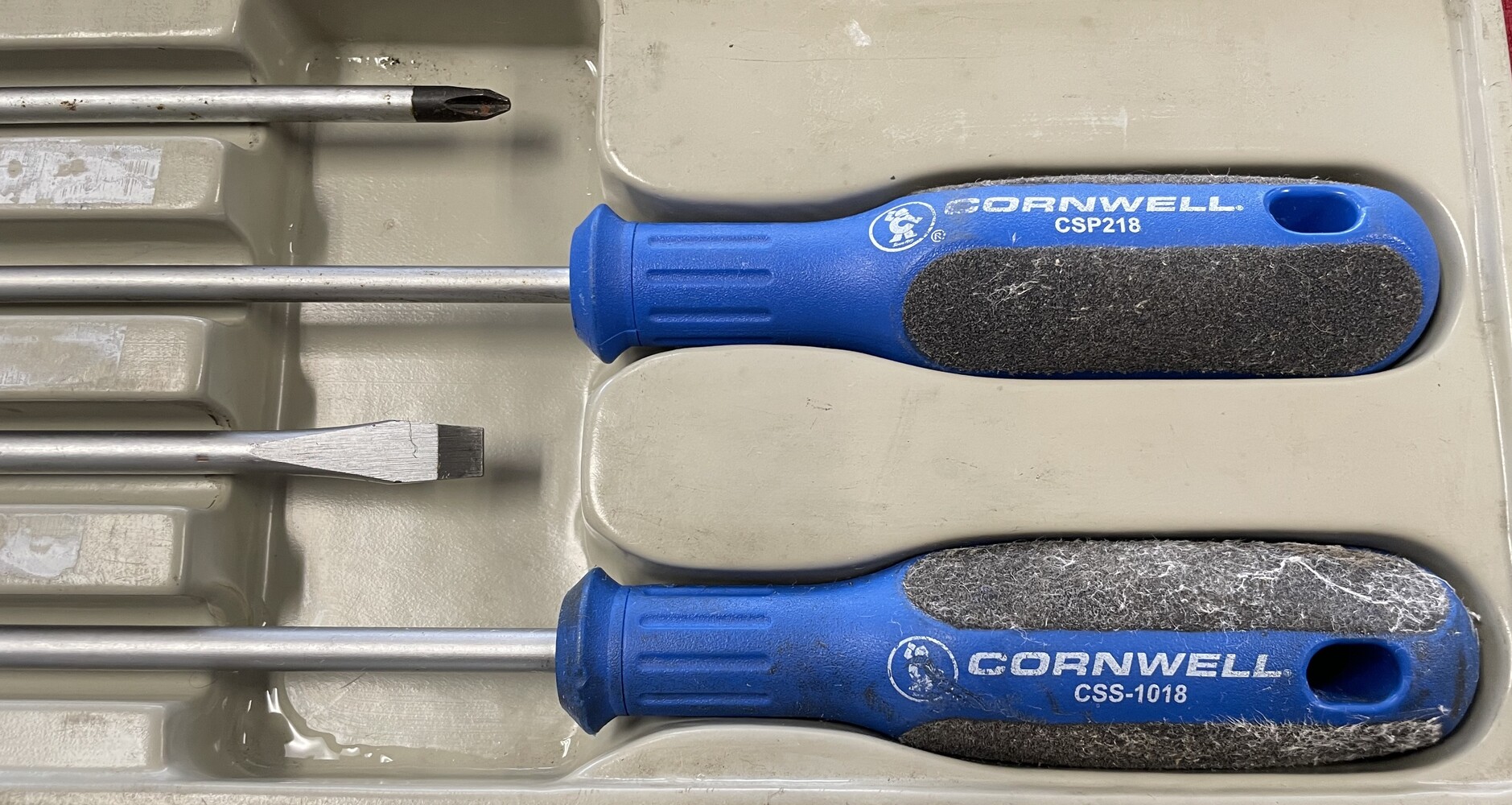 This is a preowned Cornwell Tools 5 PC Set. Screw Drivers CPS2018 - CSS1018 - CSS1012 & CPS212 Pluse Tray ( Tray Show lots of wear and tear) Screw Drivers all in good working condition. 2 flathead and 2 phillips screwdrivers long handle.