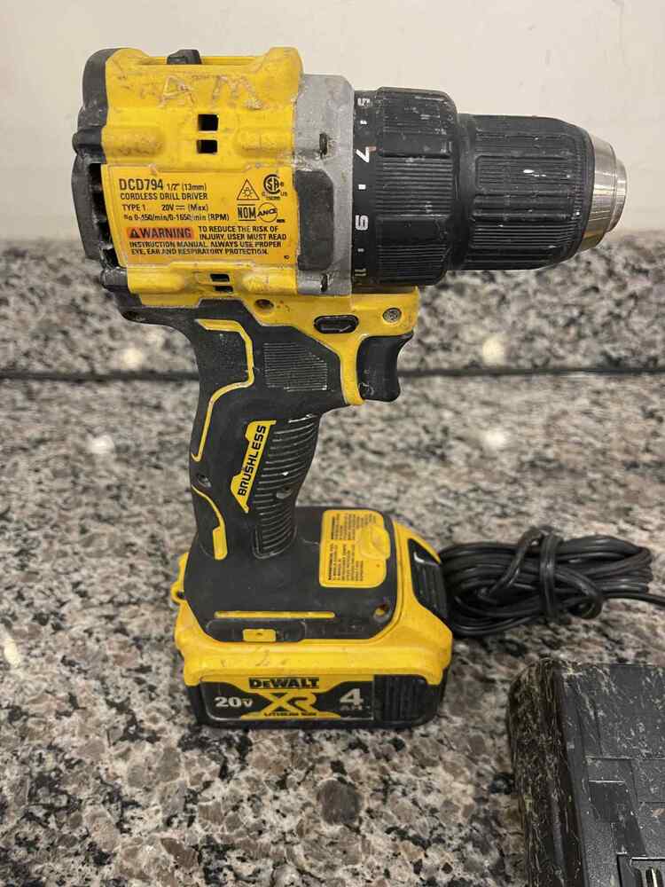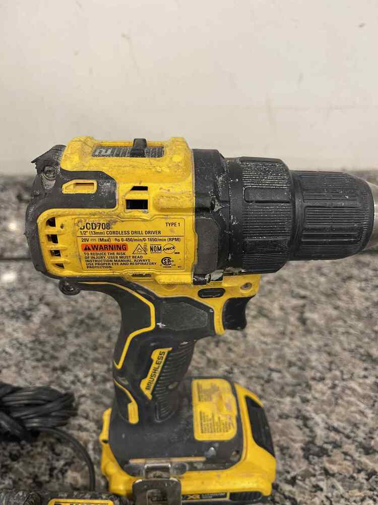 The Dewalt DCD794 DCD708 Drills Charger and Two Batteries are in used condition. The exterior of the items have visible use. They are fully functional and ready for use.