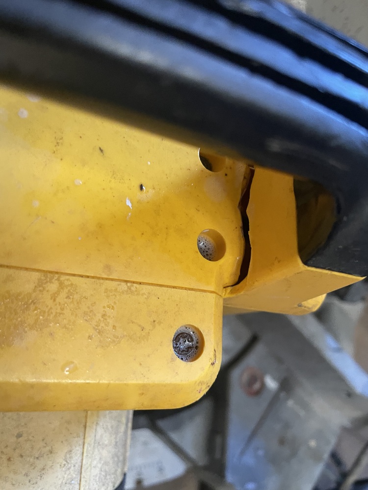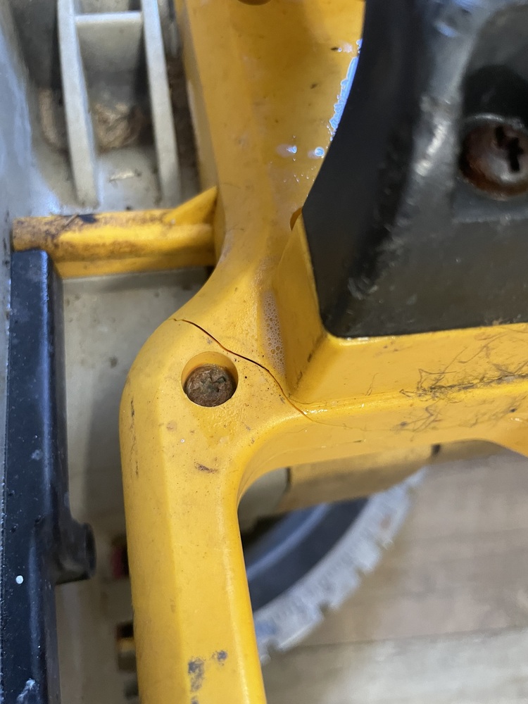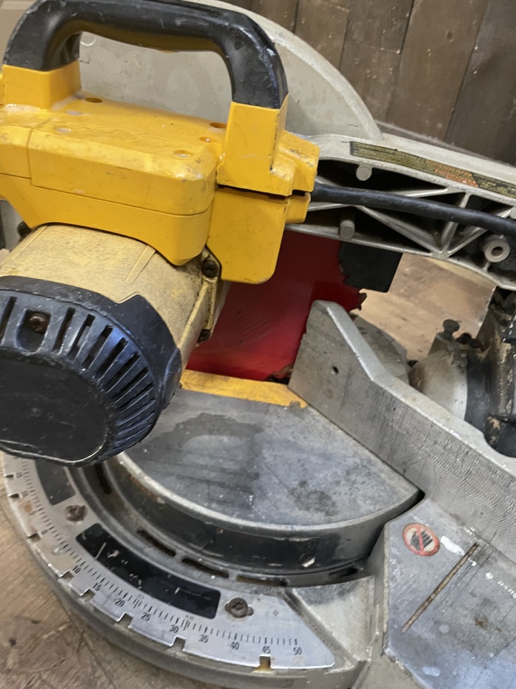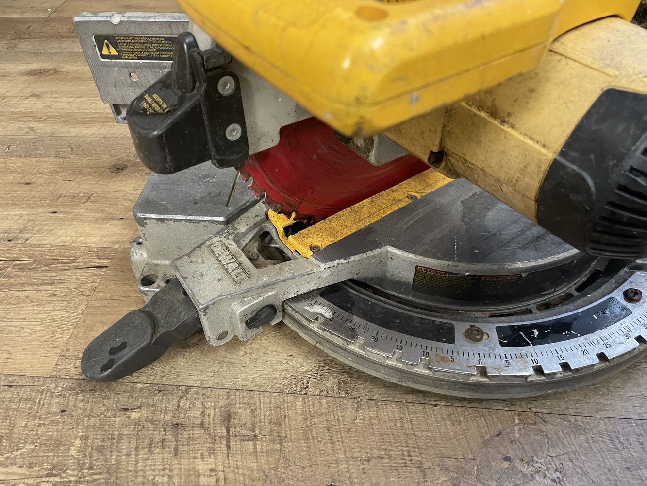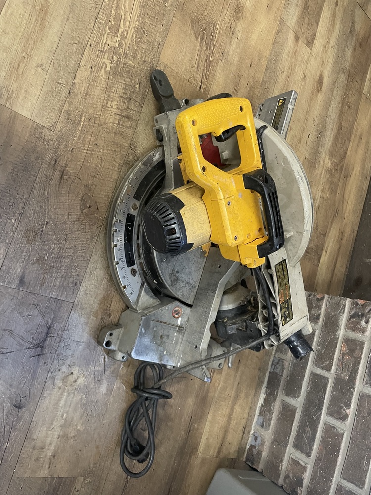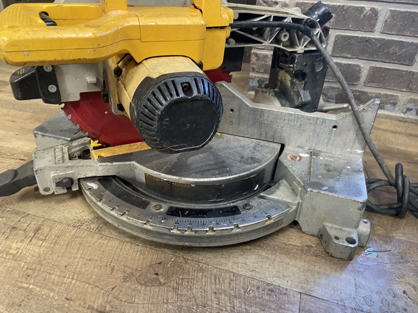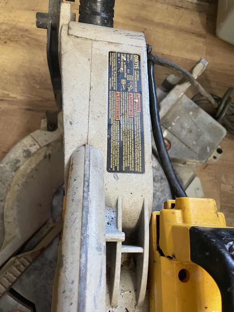 This is a preowned Dewalt Mitre Saw dw715 handle has 2 cracks in it no dust catching bag. Works well looks used.