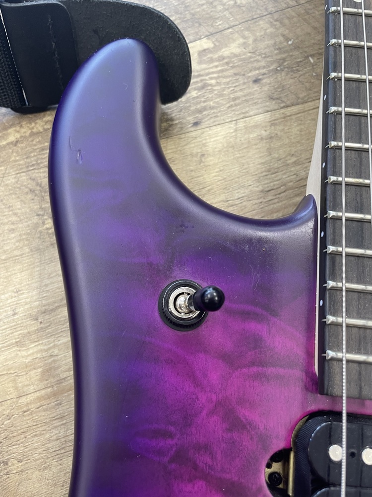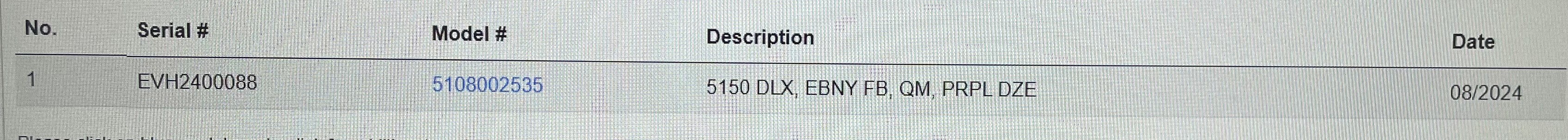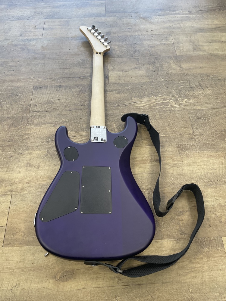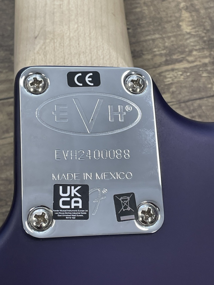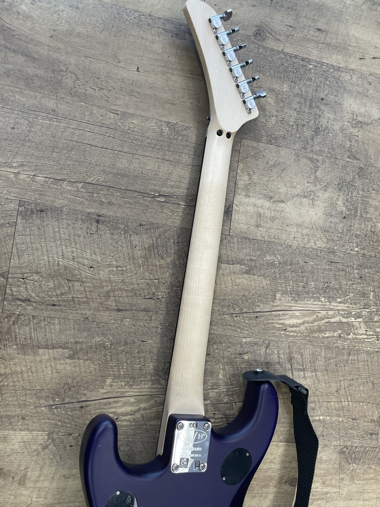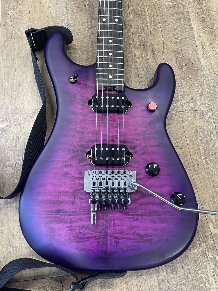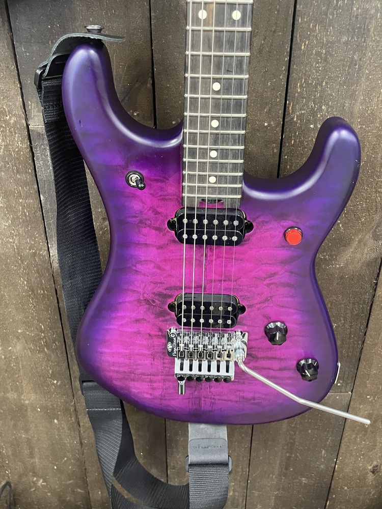This is a Preowned (Eddie Van Halen) EVH 5150 Deluxe Series Electric Guitar - Purple Daze Guitar w Strap in very good condition. Guitare does have a couple of blemished (back has a small worn spot in the paint - front has a ding in the left upper corner) Please see all pictures as there maybe something i did'nt catch. Plays and Sounds Great. Some Fun Facts Below: Designed by Edward Van Halen himself, this solidbody electric guitar boasts a spotlight-stealing quilt-maple-topped basswood body, which pairs perfectly with its muscular Wolfgang humbuckers. Thanks to a graphite-reinforced, quartersawn maple neck, you'll enjoy rock-solid stability, while a compound-radius ebony fingerboard enables exceptional speed and comfort. Built to King Edward's exact specifications and intentionally positioned against the guitar's body, the 5150 Deluxe's dive-bomb-only D-Tuna-equipped Floyd Rose lets you mimic Ed’s signature trem work with ease, along with giving you instant access to Drop D tuning. This axe also has a killswitch for mind-blowing stutter effects and a low-friction volume pot for super-smooth swells. The 5150 Deluxe boasts a top-loaded EVH-branded Floyd Rose 1000 Series tremolo. First gaining popularity in the 1980s, the Floyd Rose’s locking design keeps your guitar in tune, even if you like to perform extreme pitch pyrotechnics. When push comes to shove, you can force the whammy bar all the way down to the guitar's body for psychotic dive-bombing. Floyd Rose tremolo's locking design. On top of that, you can easily switch to Drop D tuning, courtesy of the 5150 Deluxe's D-Tuna.