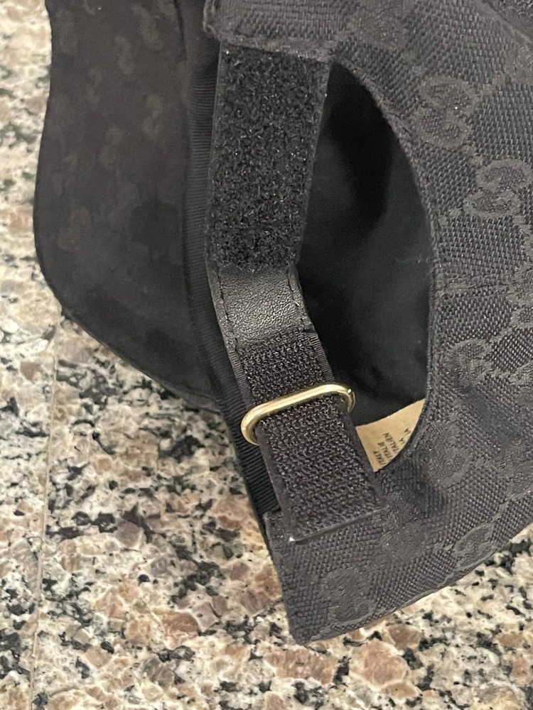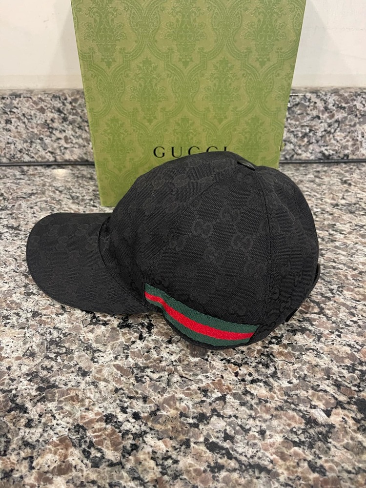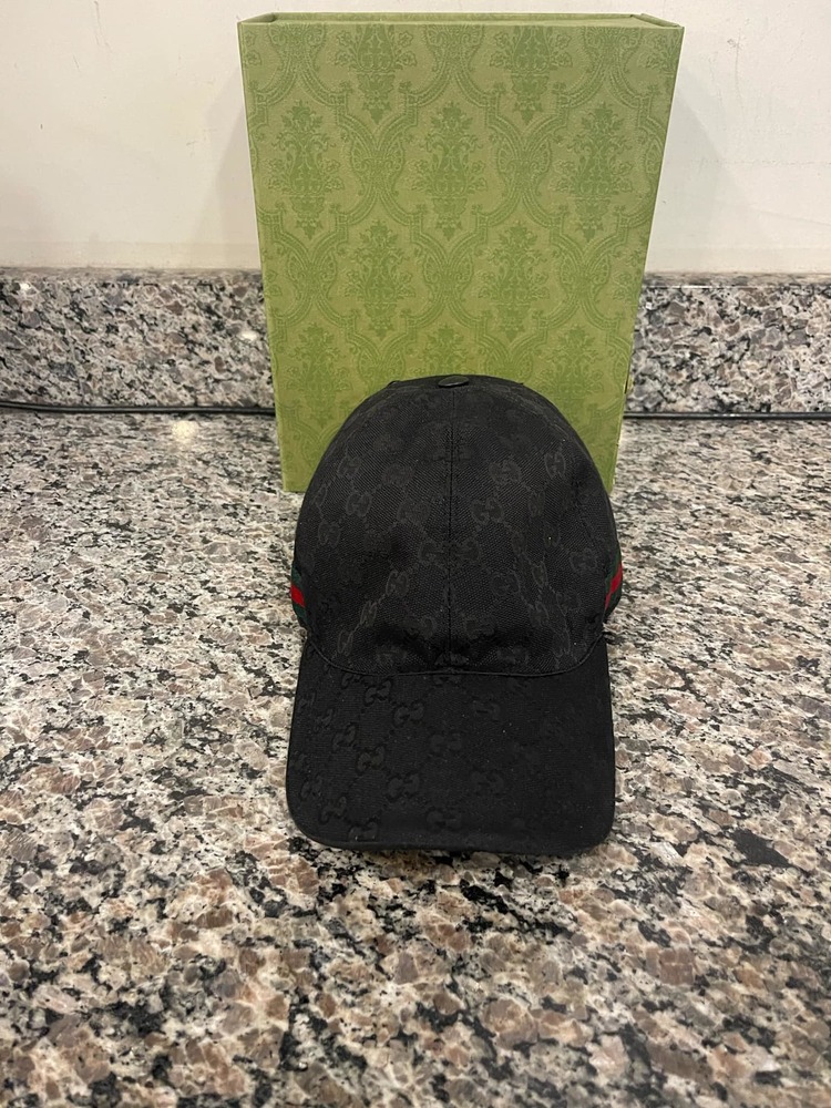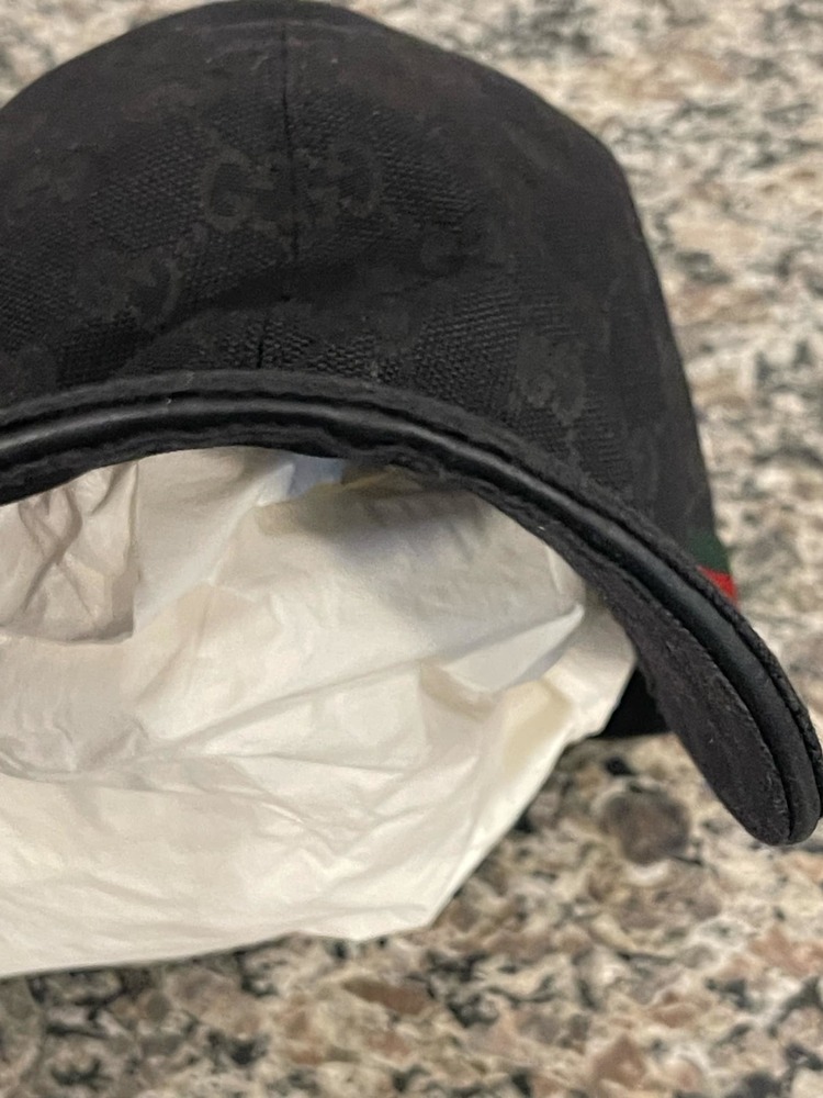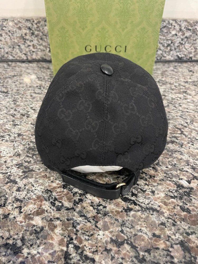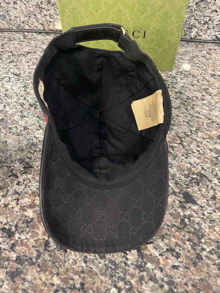 The Gucci GG Web Adjustable Black Baseball Hat With Box is in used condition. The exterior of the hat has light fraying on the tip of the bill. The interior of the hat has minimal wear. The hat comes with the original box but no dustbag. The overall condition of the hat is a (B+).