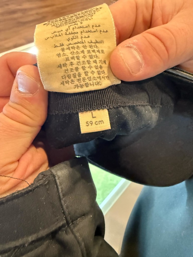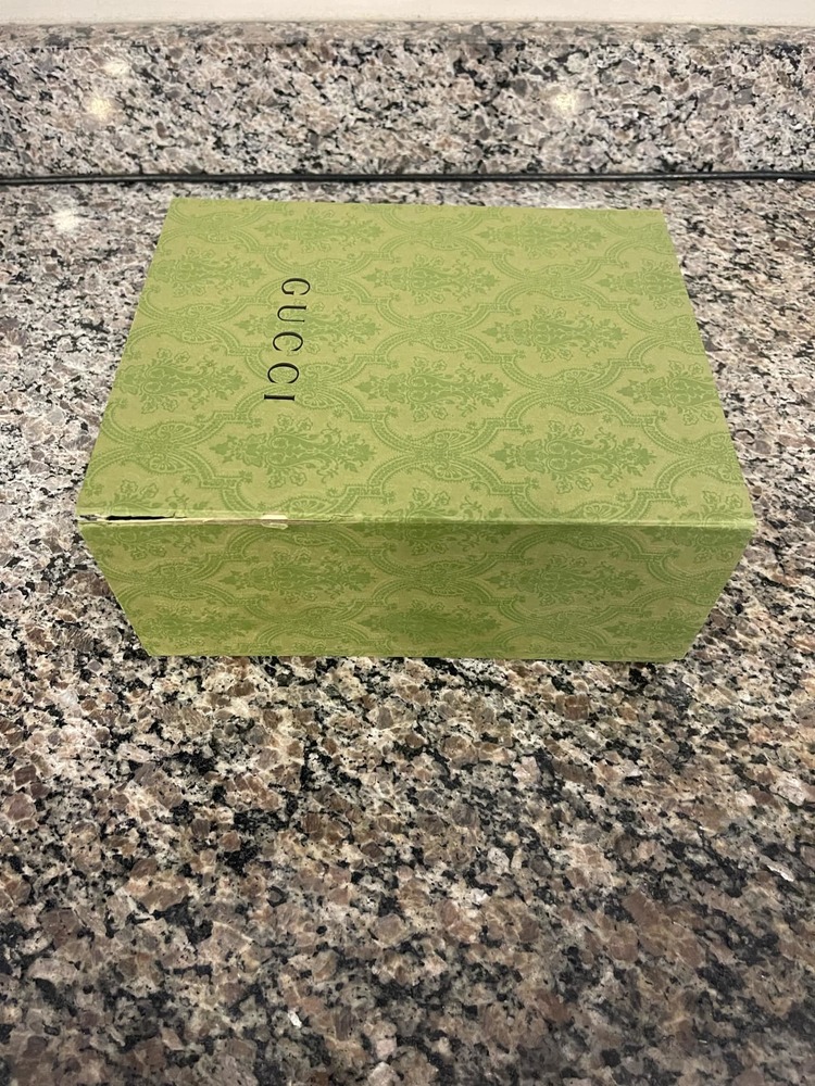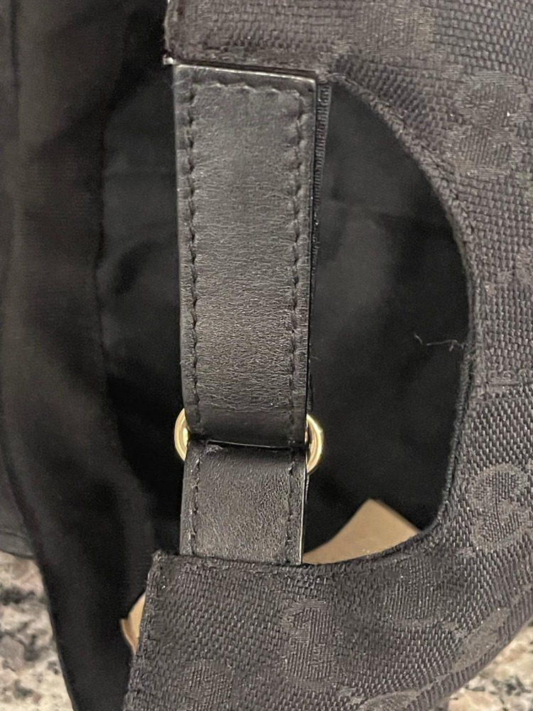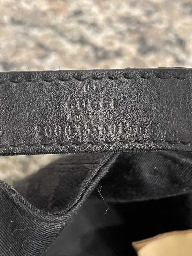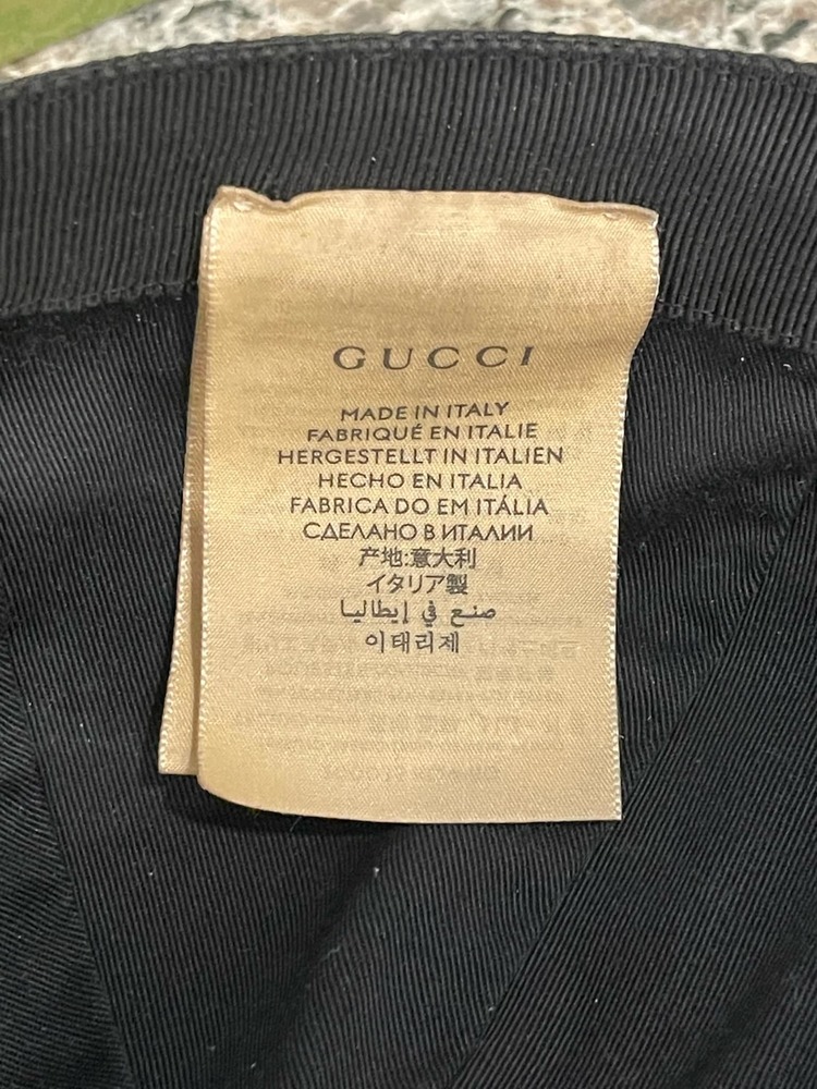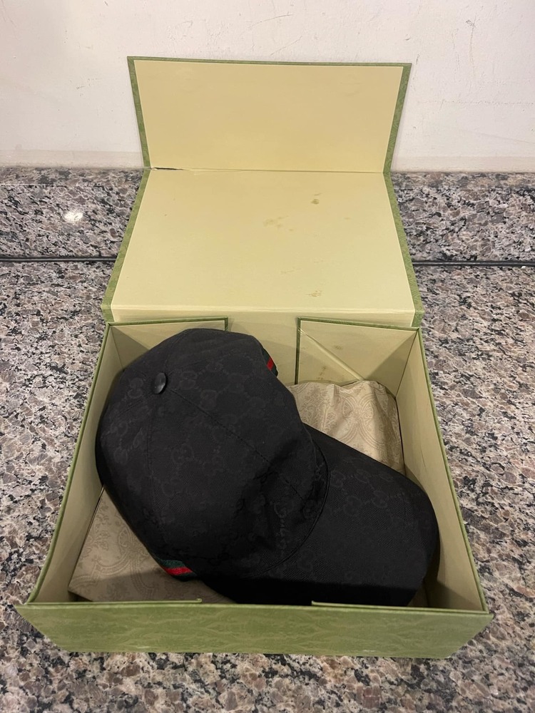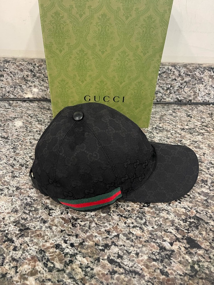 The Gucci GG Web Adjustable Black Baseball Hat With Box is in used condition. The exterior of the hat has light fraying on the tip of the bill. The interior of the hat has minimal wear. The hat comes with the original box but no dustbag. The overall condition of the hat is a (B+).