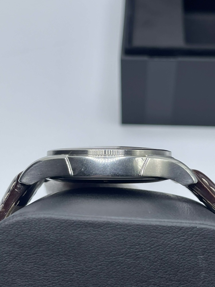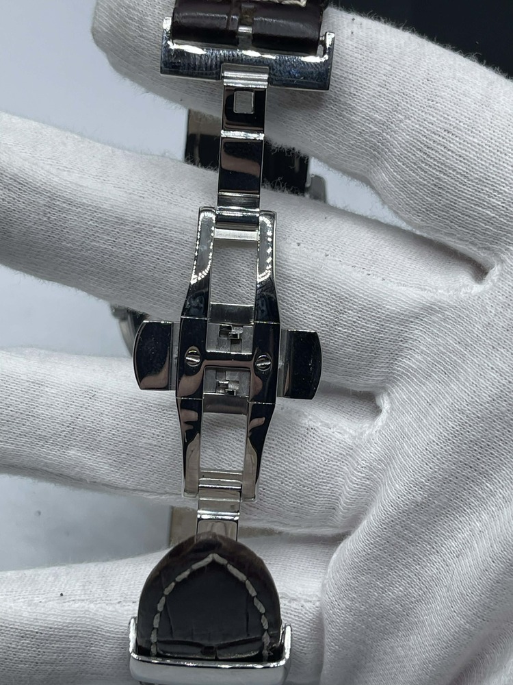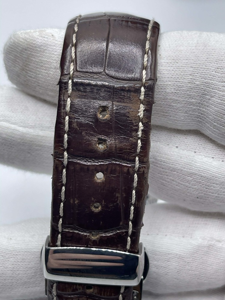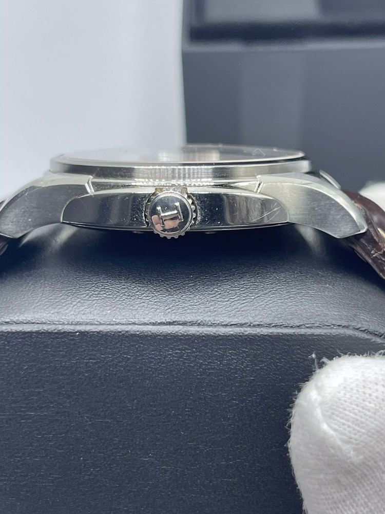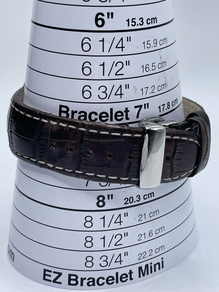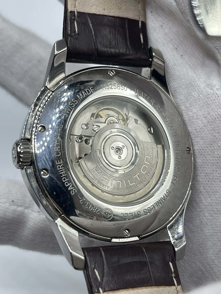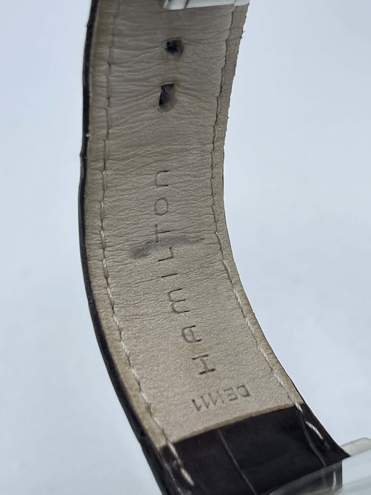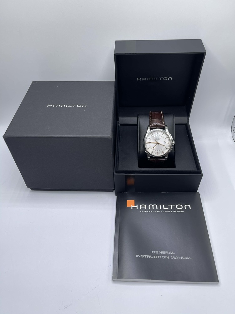 The Hamilton H325850 Jazzmaster GMT Automatic White Dial 42mm is in used condition. The case has scratches dotted around the exterior of the watch. The band does not hold its original shape. The watch comes with box and is a 7.5in wrist size.