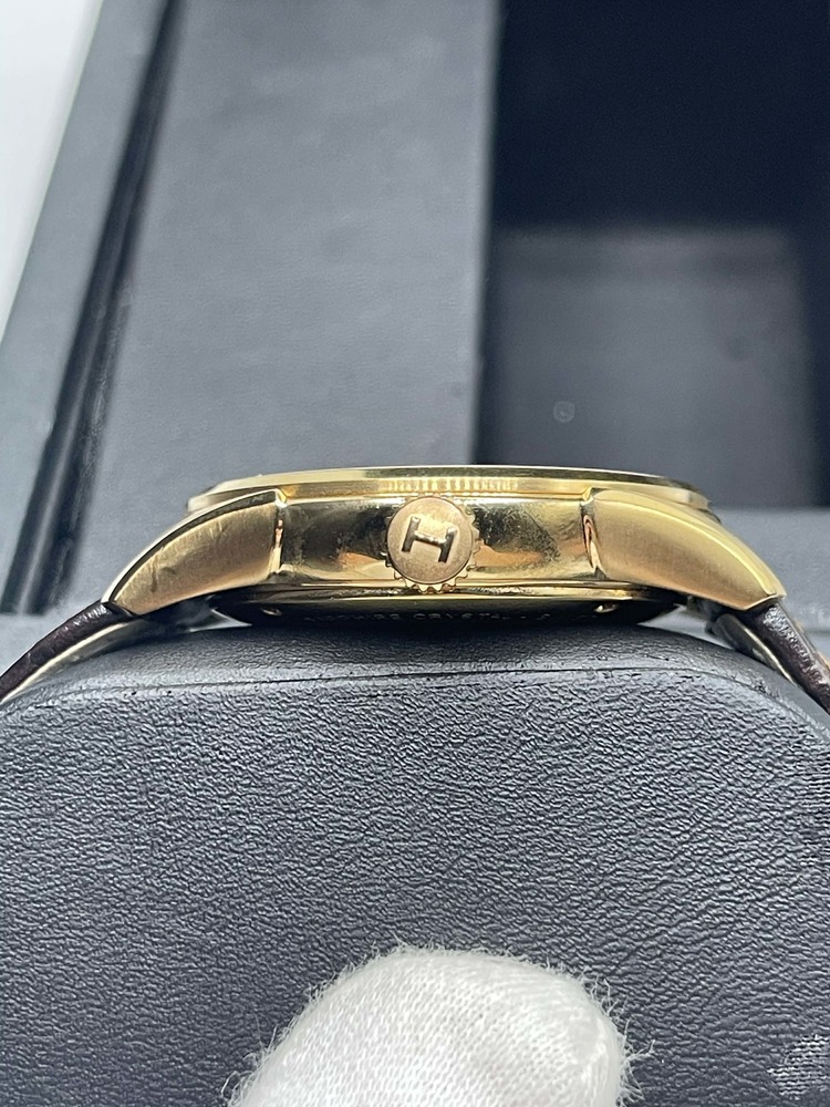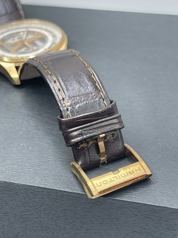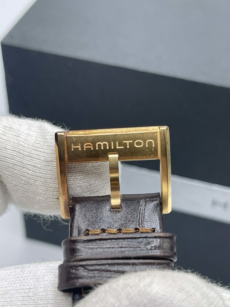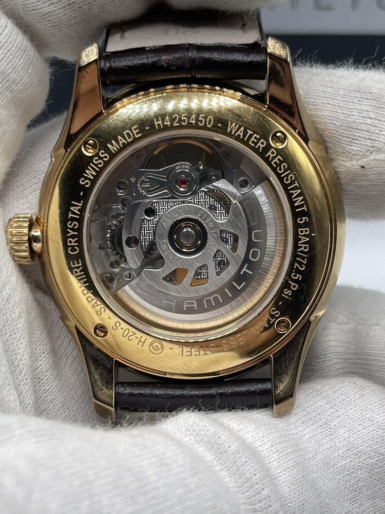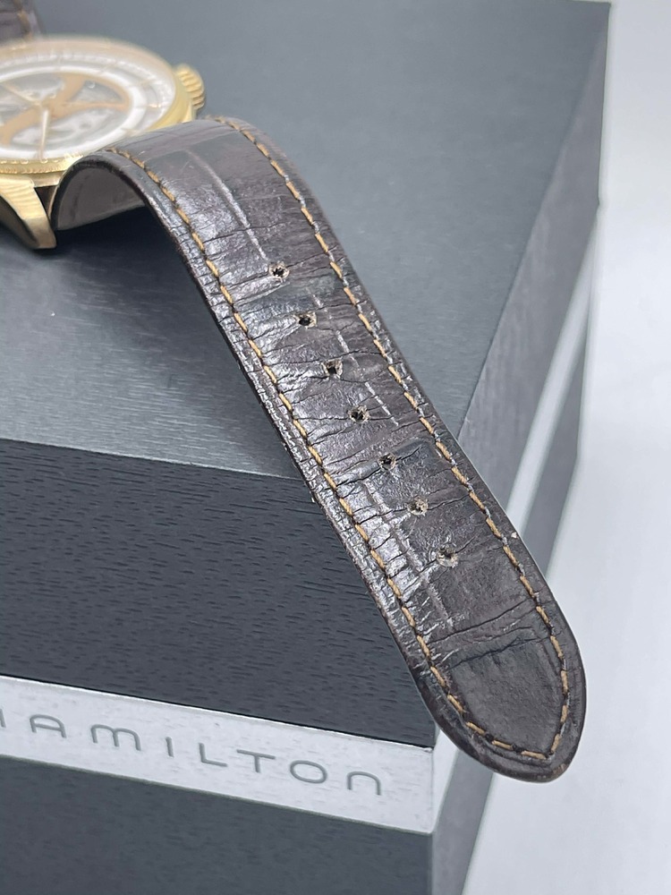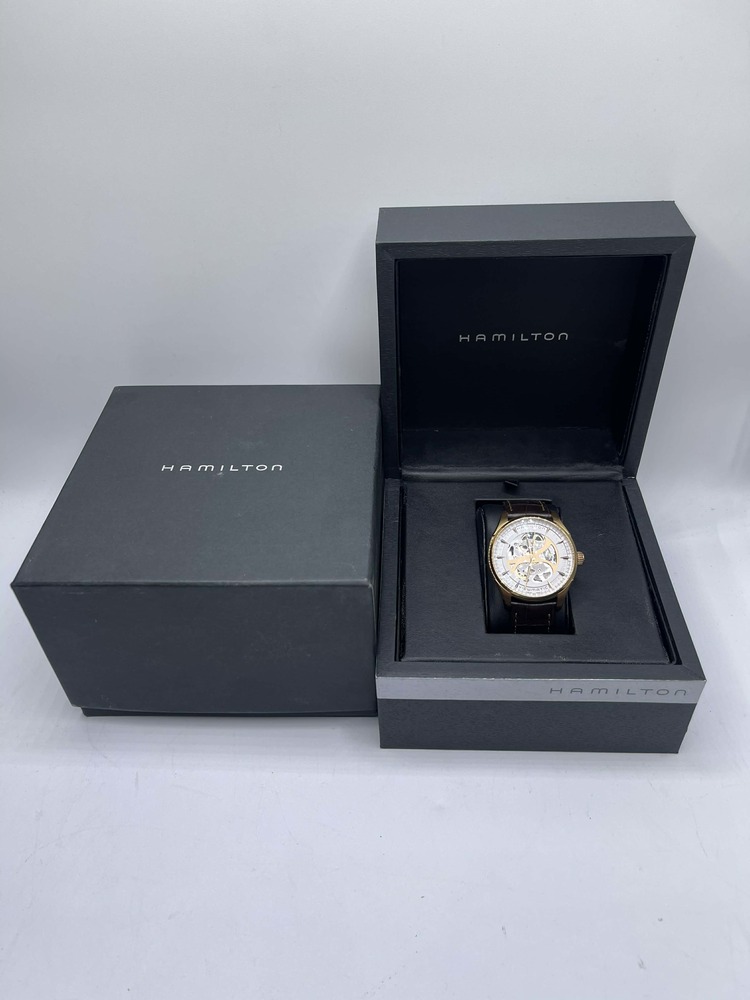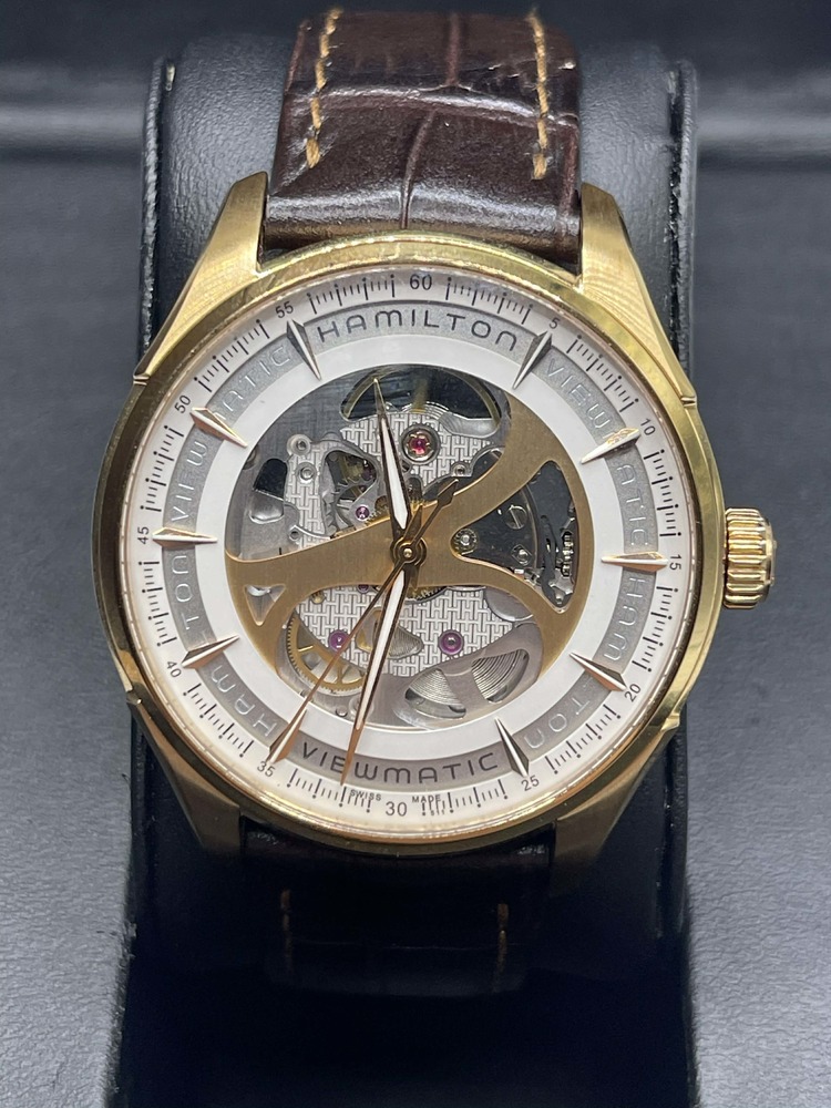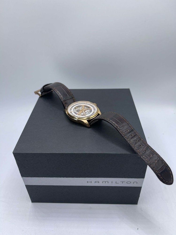 The Hamilton Jazzmaster Viewmatic 40mm Skeleton Automatic in Box is in used condition. The watch ahs scratches dotted around the exterior of the case. The band does not hold the original shape abd shoes signs of use. The watch omes with box. 7in wrist size