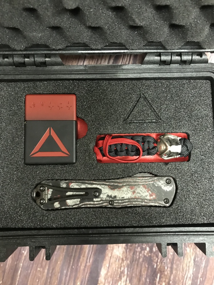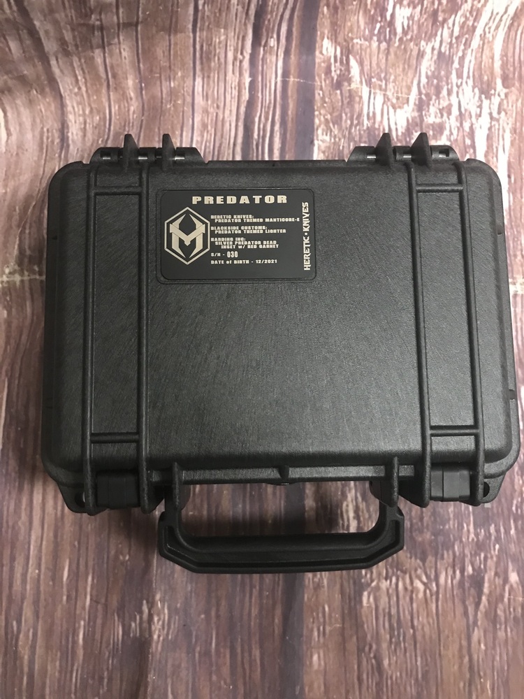 This set comes with a handcrafted Predator bead on a paracord lanyard by Harding Inc. It also has a lighter made by Blackside Customs—which includes a matching serial number to the knife, etched in Predator language. This set is stored in a waterproof Pelican case so you know it can survive the jungle, even if you might not.