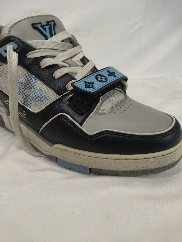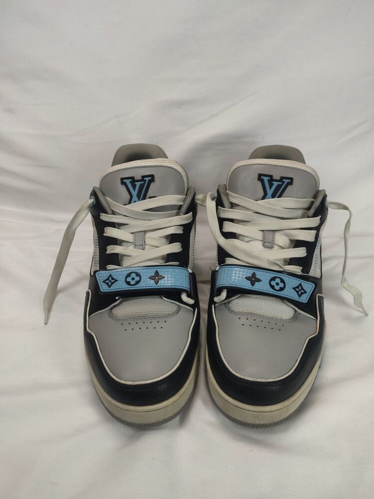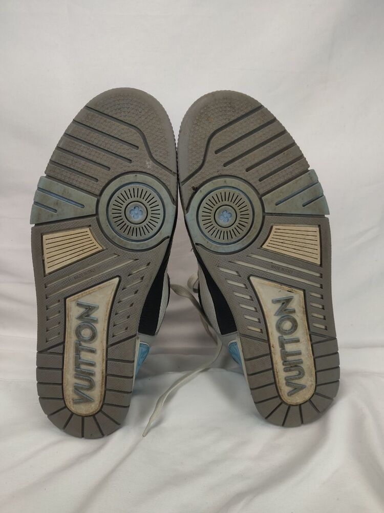 These are a good pair of used sneakers. Louis Vuitton size 9 US size 10. Includes box but the box is ripped and torn in places. The shoes are in good condition with some cosmetic blemishes. There are some marks and scuffs present on the sneakers. There are some stains present on the shoes and the mesh/fabric. There is some structure creasing on the back heel of the shoes. There are scuffs and marks on the soles and bottom of the shoes. Some wear around the edges of the shoes. Please see all pictures for details. (351823)