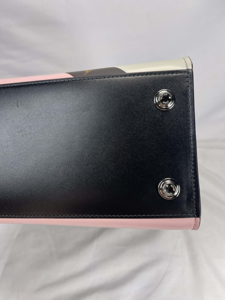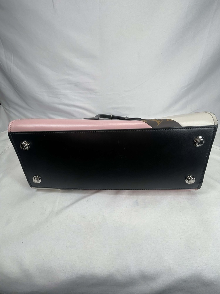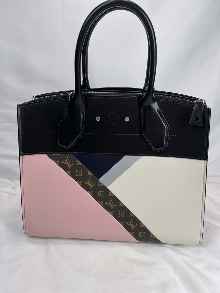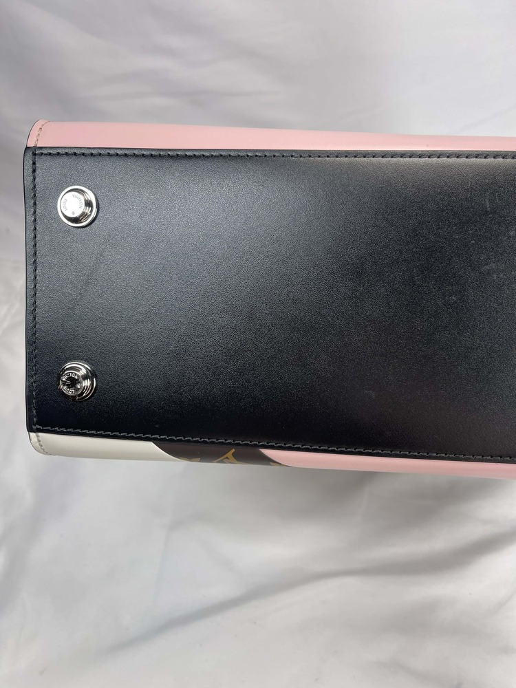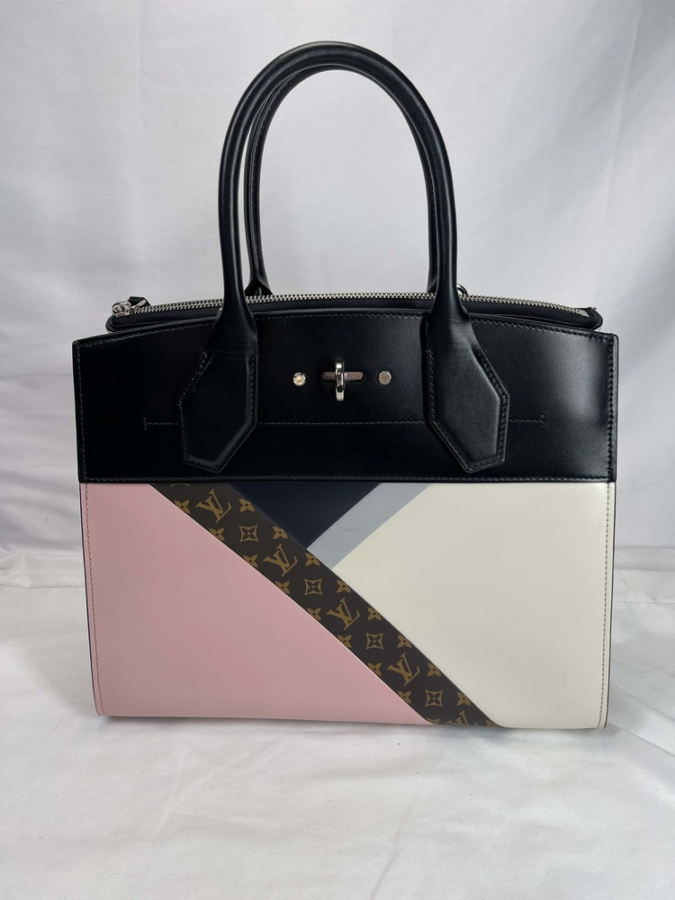 The Louis Vuitton City Steamer Handbag with Monogram Canvas Pink is in used condition. The exterior of the bag has scuffing and scratches on the front and bottom. The area under the front latch has scratches, the silver area on the front has a scratch and the white area has scuffing. The interior of the bag is in good condition. The bag comes with a COA from Entrupy. The bag does not come with the crossbody strap. The overall condition of the bag is a (B).