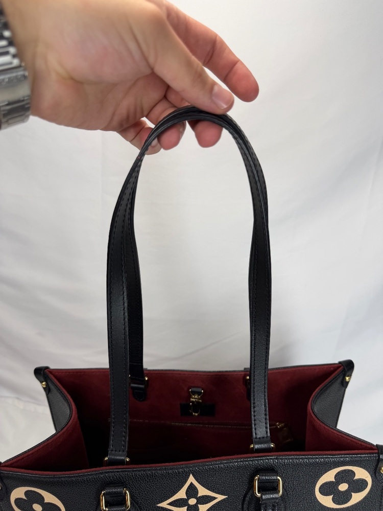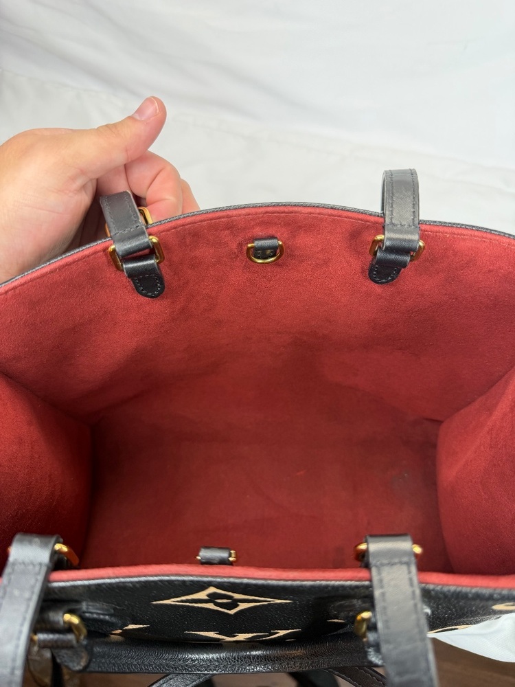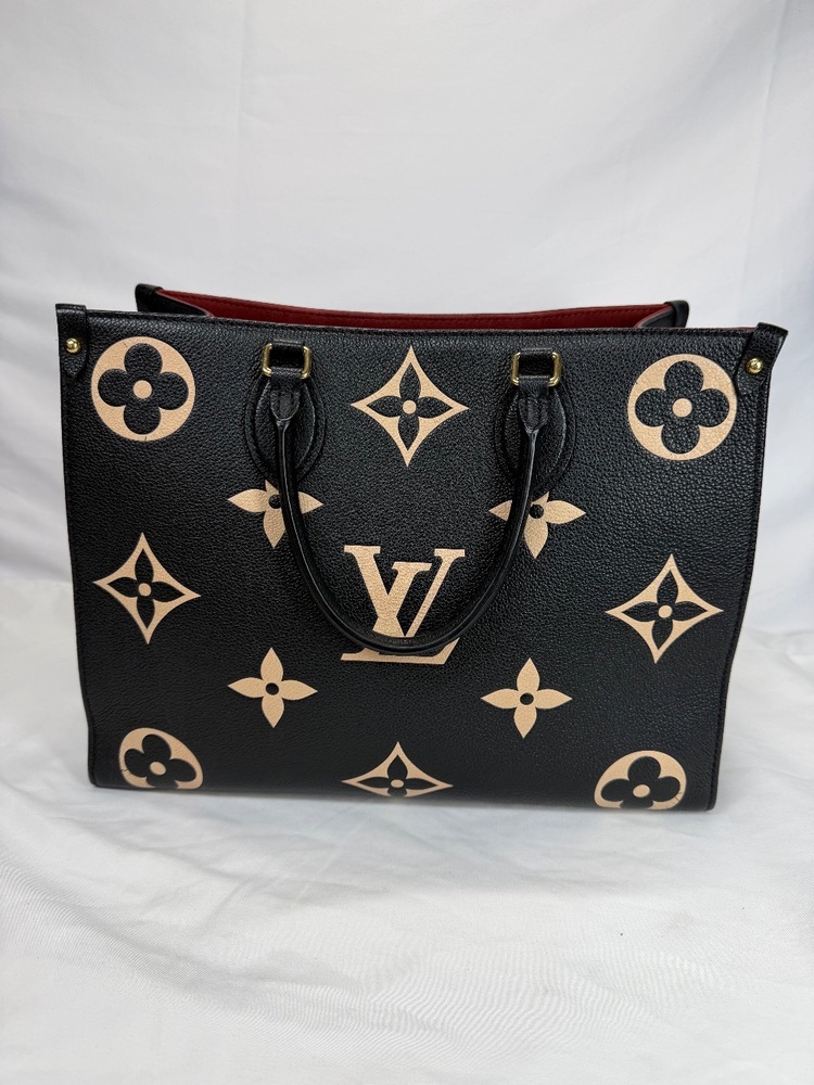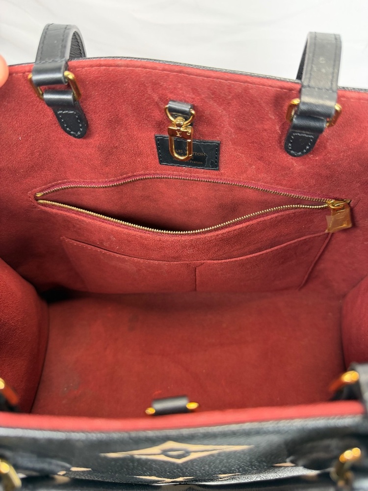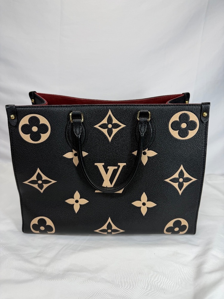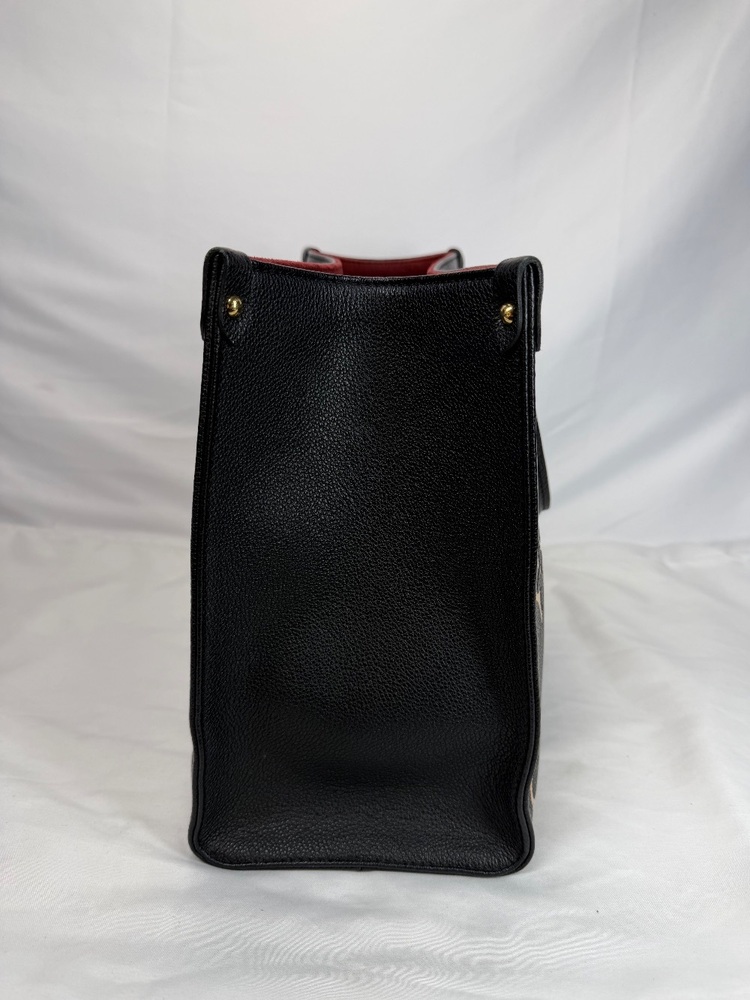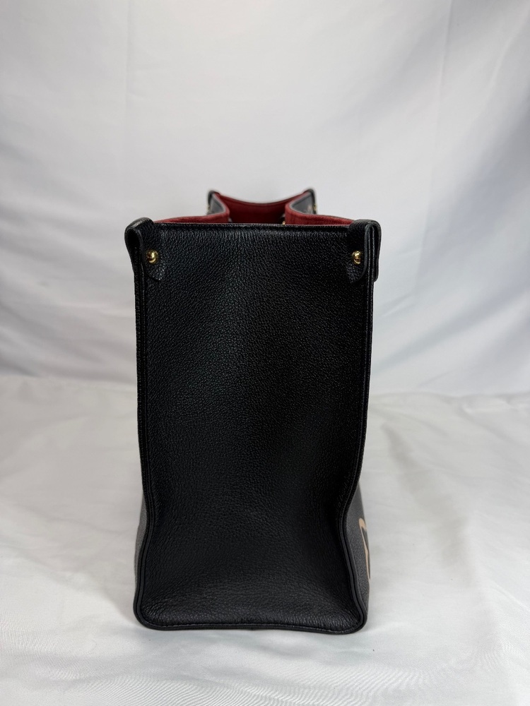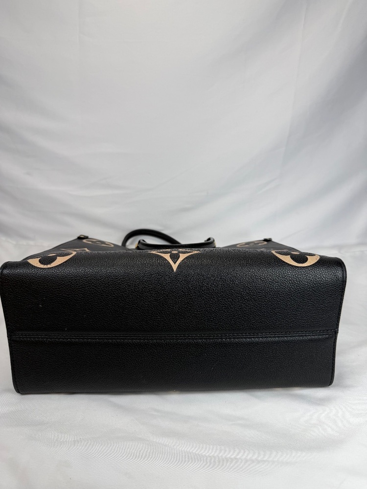 This is an authentic LOUIS VUITTON Empreinte Monogram Giant Onthego MM in Black and Beige. This limited edition tote is crafted of oversized ivory Louis Vuitton monogram print embossed on black calfskin leather. The bag features rolled leather top handles, long strap handles, and gold hardware. The top is open to a spacious burgundy microfiber interior with zipper and patch pockets.