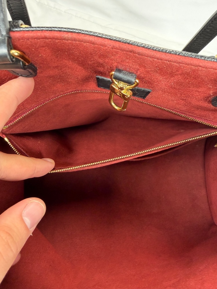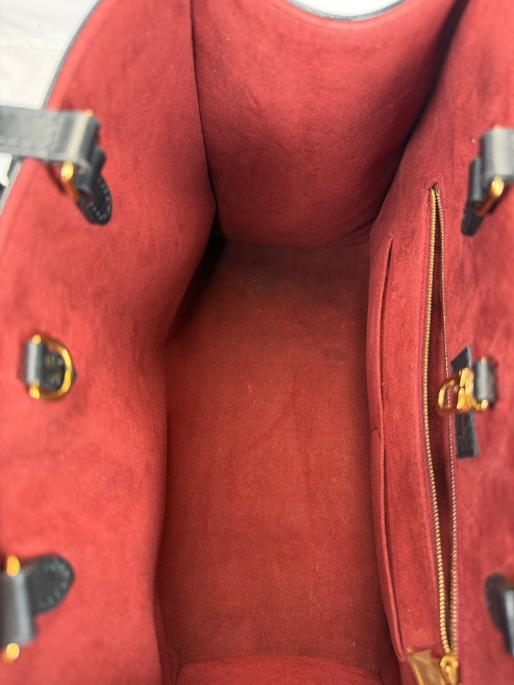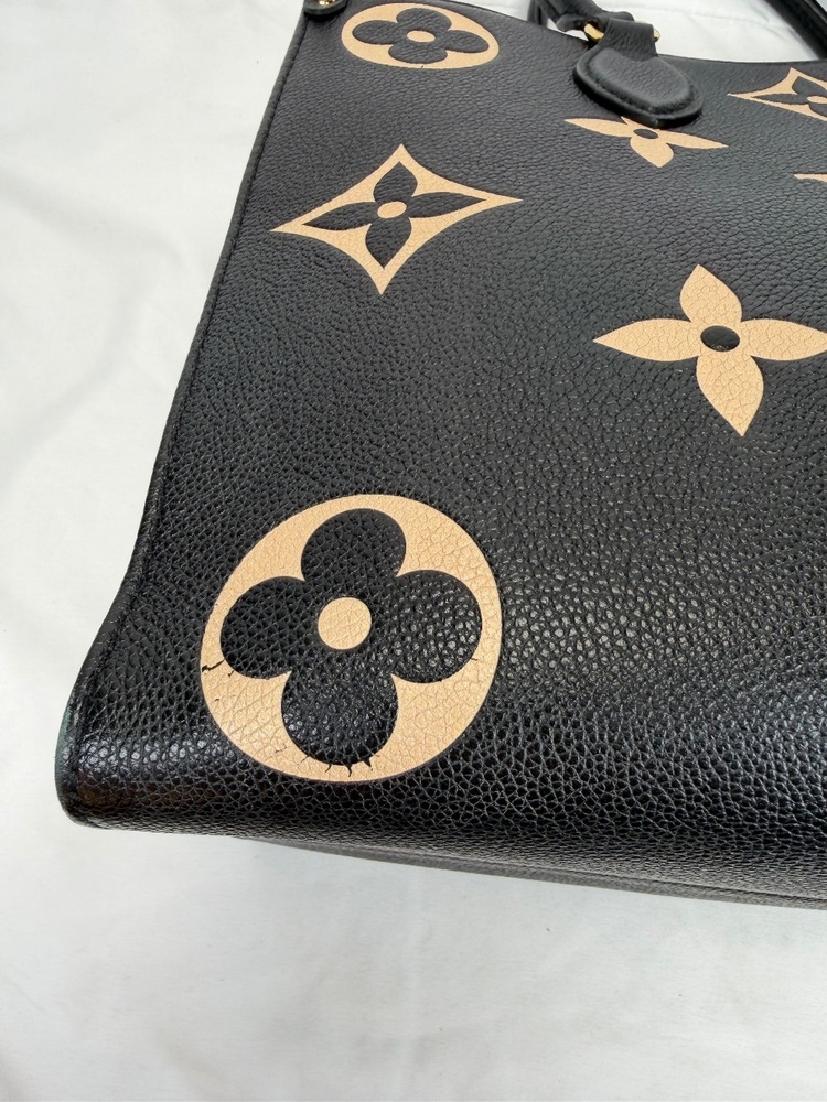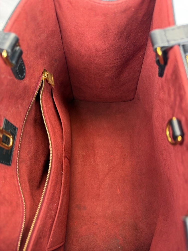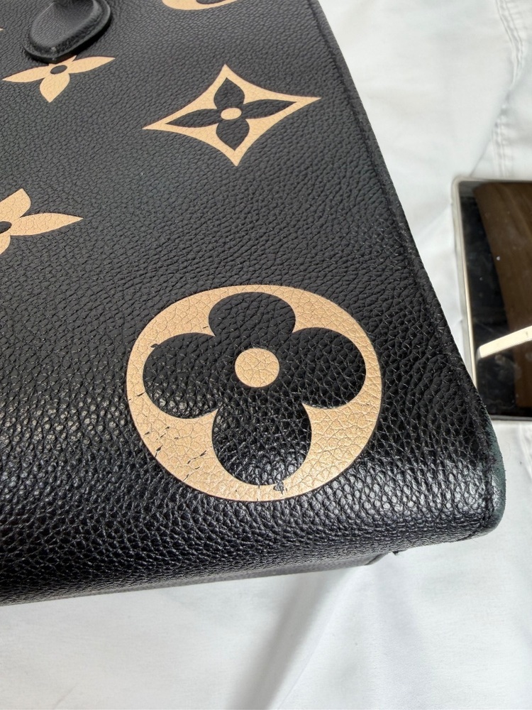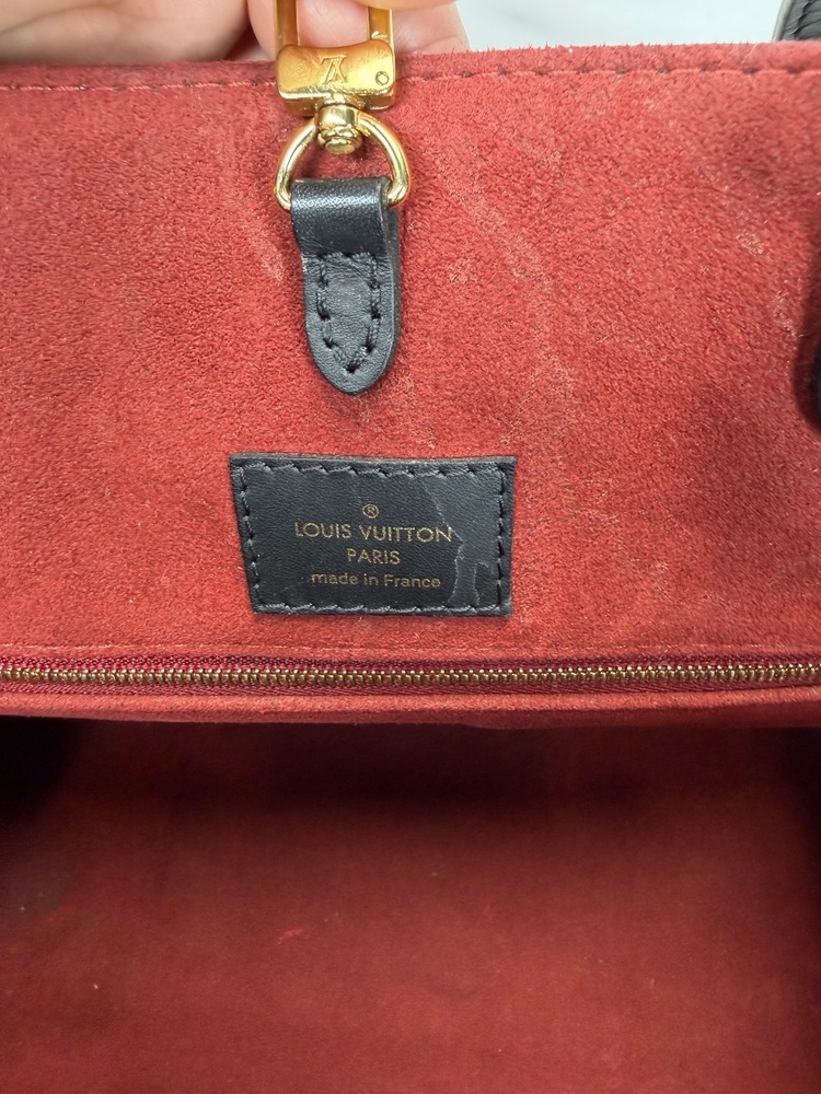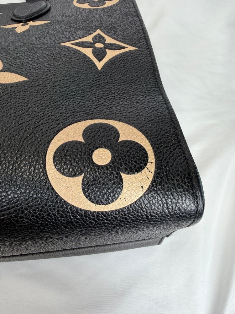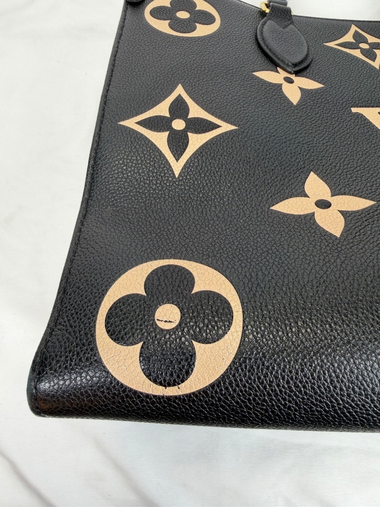 This is an authentic LOUIS VUITTON Empreinte Monogram Giant Onthego MM in Black and Beige. This limited edition tote is crafted of oversized ivory Louis Vuitton monogram print embossed on black calfskin leather. The bag features rolled leather top handles, long strap handles, and gold hardware. The top is open to a spacious burgundy microfiber interior with zipper and patch pockets.