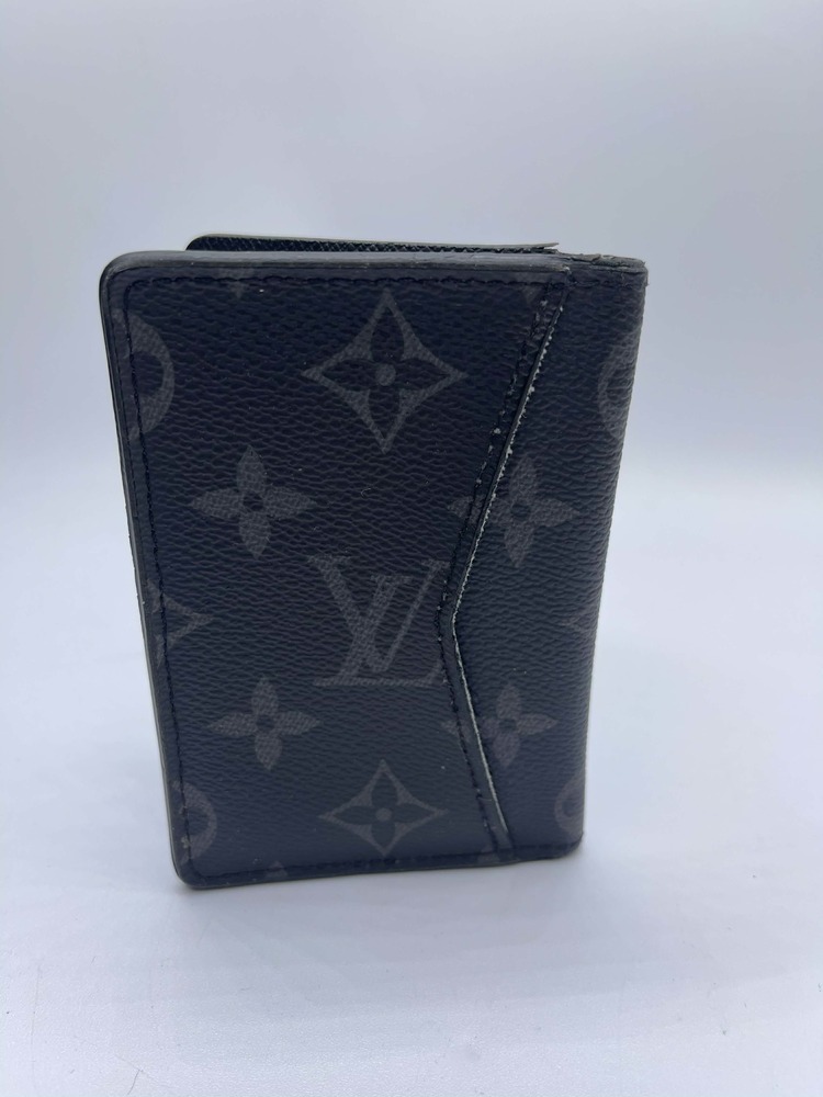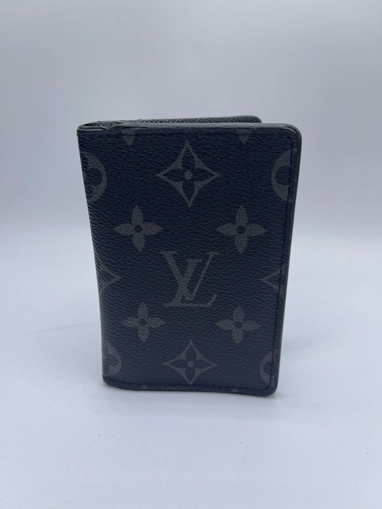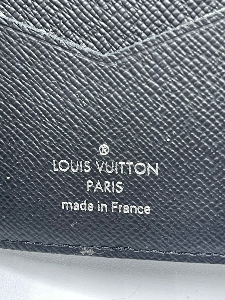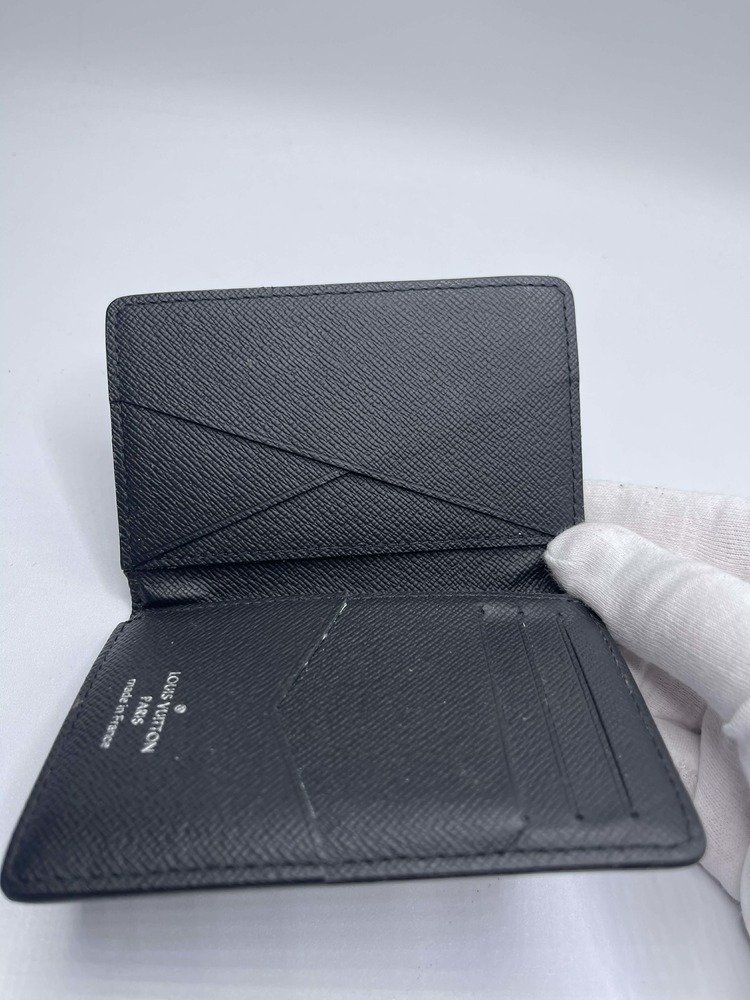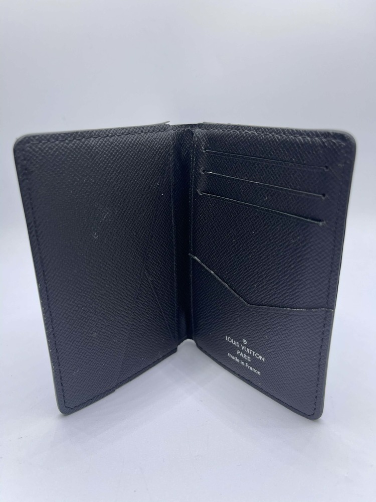 The Louis Vuitton Monogram Graphite Pocket Organizer M61696 is in used condition. The piping has scuffs and cracking. The back pocket has the piping worn off. The interior has light stains and wear to the leather. The overall condition of the wallet is a (B-).