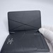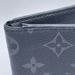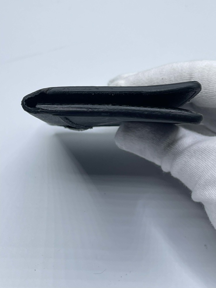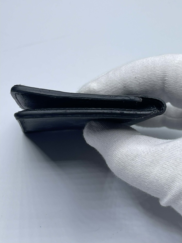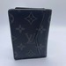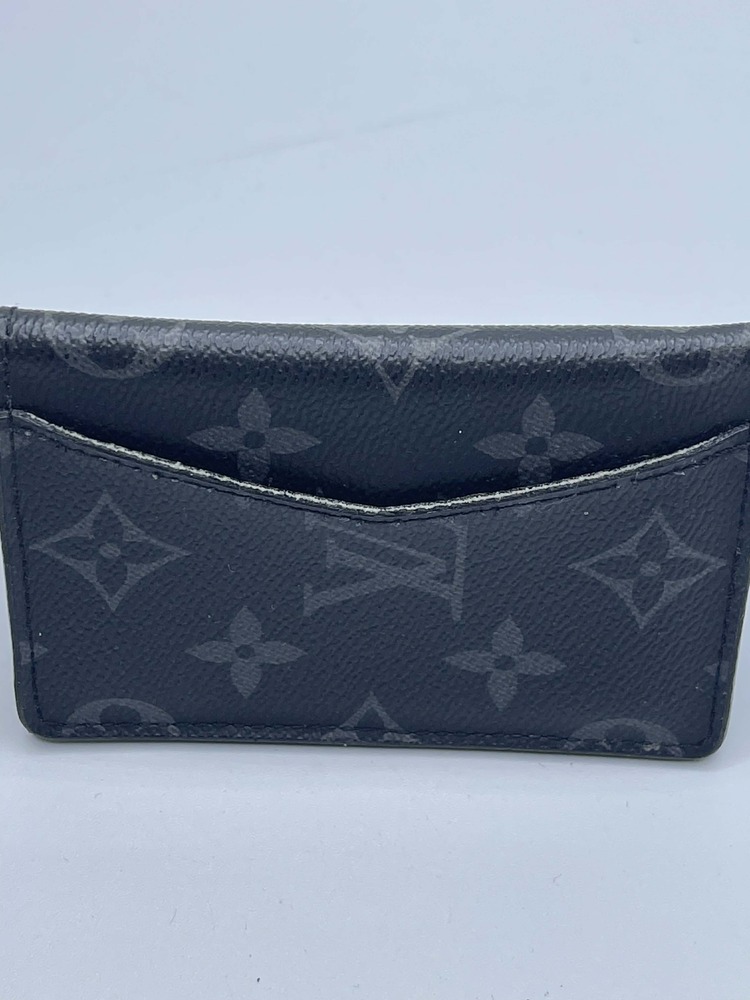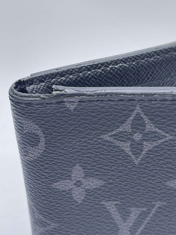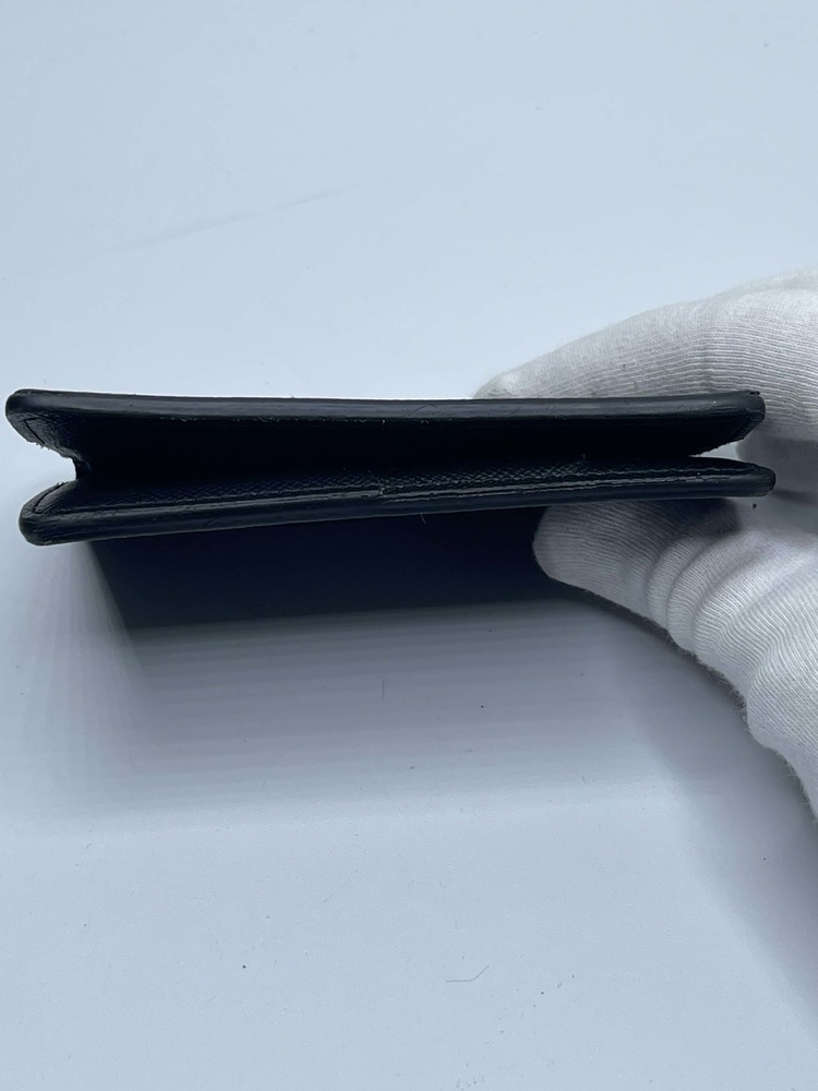 The Louis Vuitton Monogram Graphite Pocket Organizer M61696 is in used condition. The piping has scuffs and cracking. The back pocket has the piping worn off. The interior has light stains and wear to the leather. The overall condition of the wallet is a (B-).