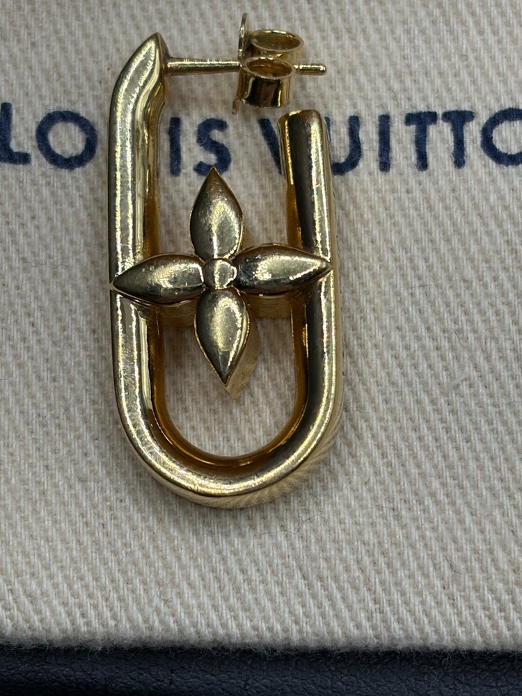 Inspired by the iconic temples of the My LV Chain sunglasses, these earrings offer an elegant new way to wear the Louis Vuitton signature. Chunky brass links are inset with two different House emblems: the LV initials on one and a Monogram Flower on the other. An asymmetrical look that complements the other jewels of the My LV Chain theme.