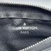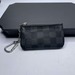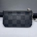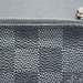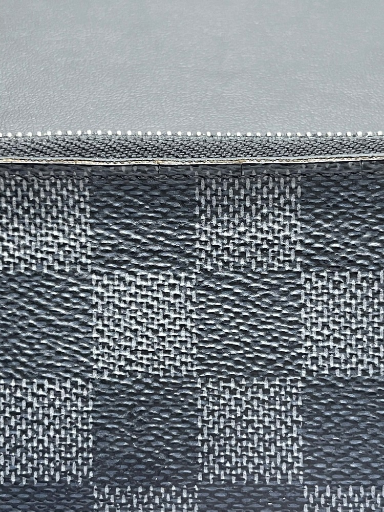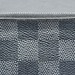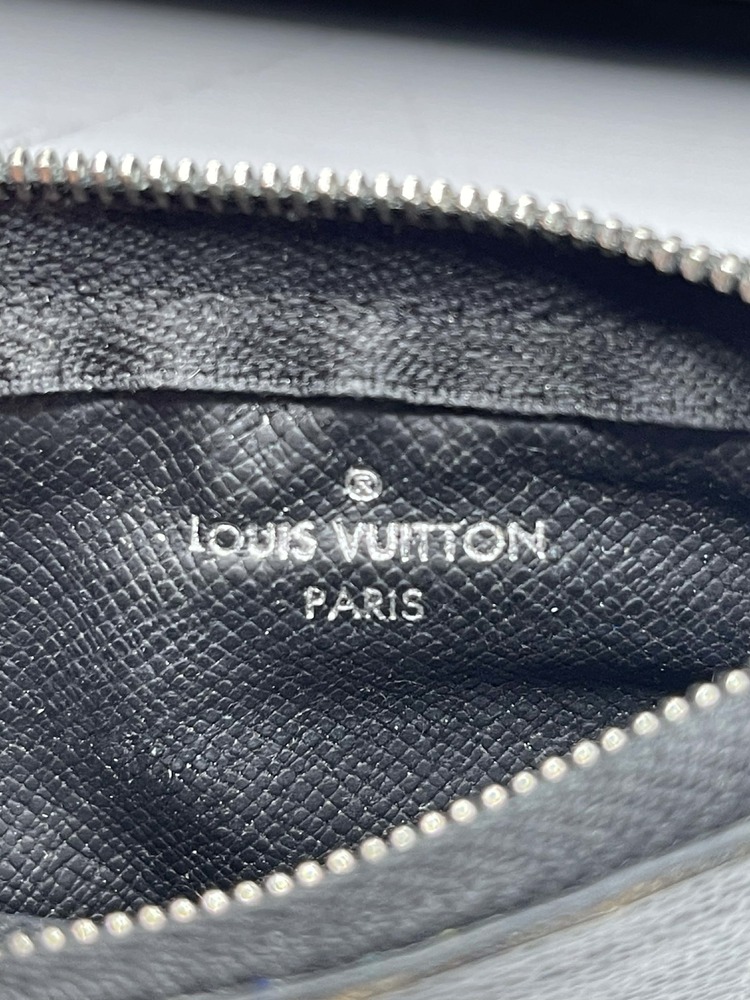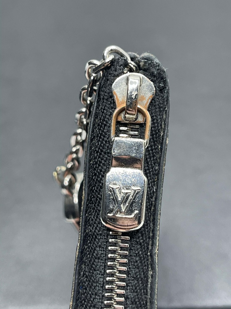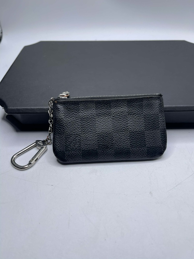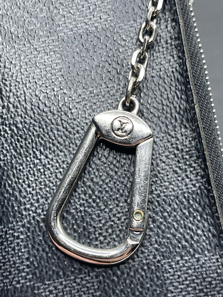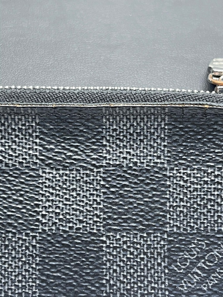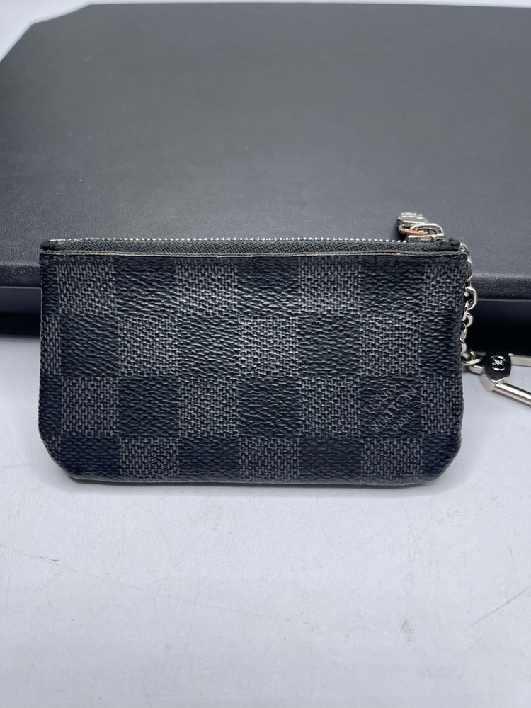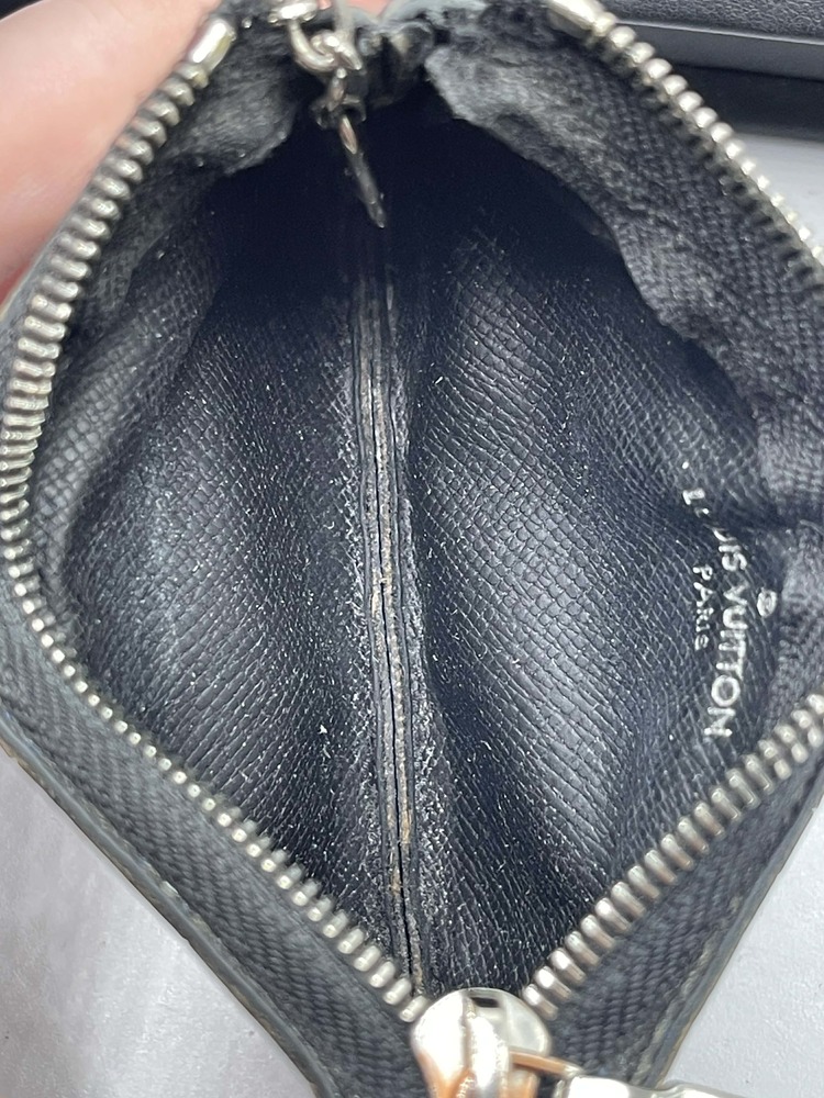 The Louis Vuitton Pochette Cle Key Pouch Damier Graphite is in used condition. The exterior has cracking and peeling near the top. The zipper has wear that shows discoloration. The interior of the wallet is in good condition. The overall condition of the wallet is a (B-).