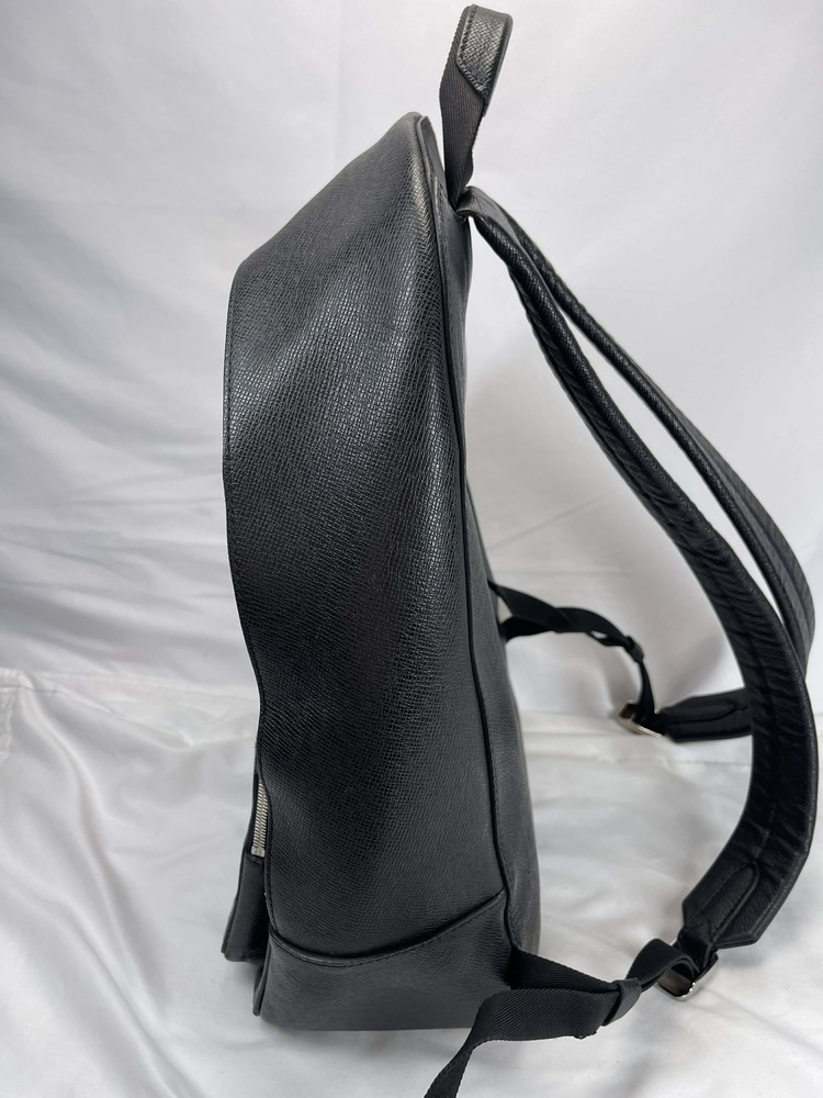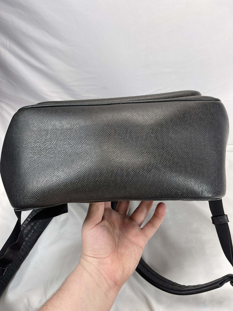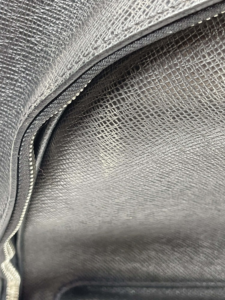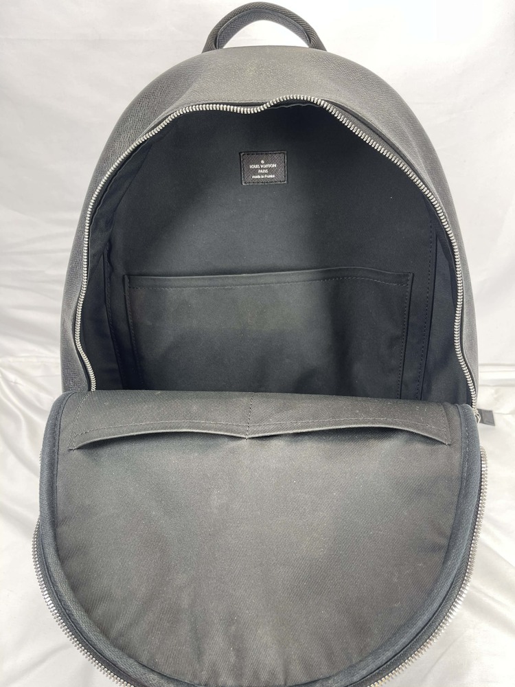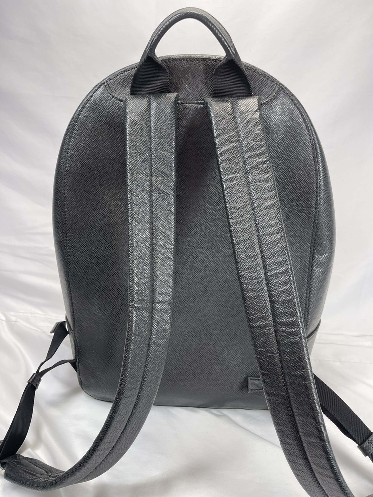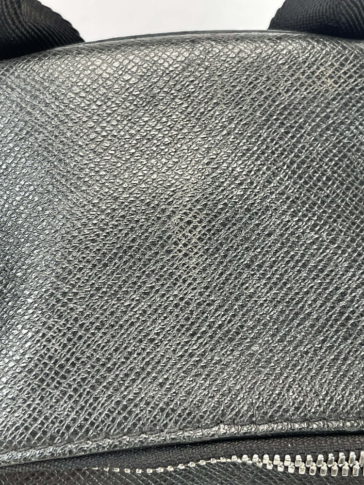 The Louis Vuitton Taiga Leather Alex Backpack Noir Black is in used condition. The exterior of the bag has multiple scuffs and stains dotted around the bag. The bag has damage around the front pocket where the piping meets the zipper. The hardware has scratches on it. The area above the main section of the has scuffing. The interior of the bag has some small stains inside the main section of the bag. Inside of the interior pocket has small stains all alond the seam.The bag comes with a COA from Entrupy. The overall condition of the bag is a (B-).