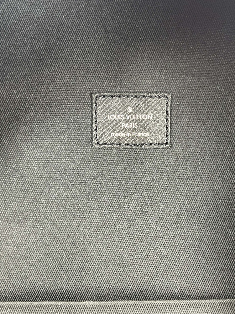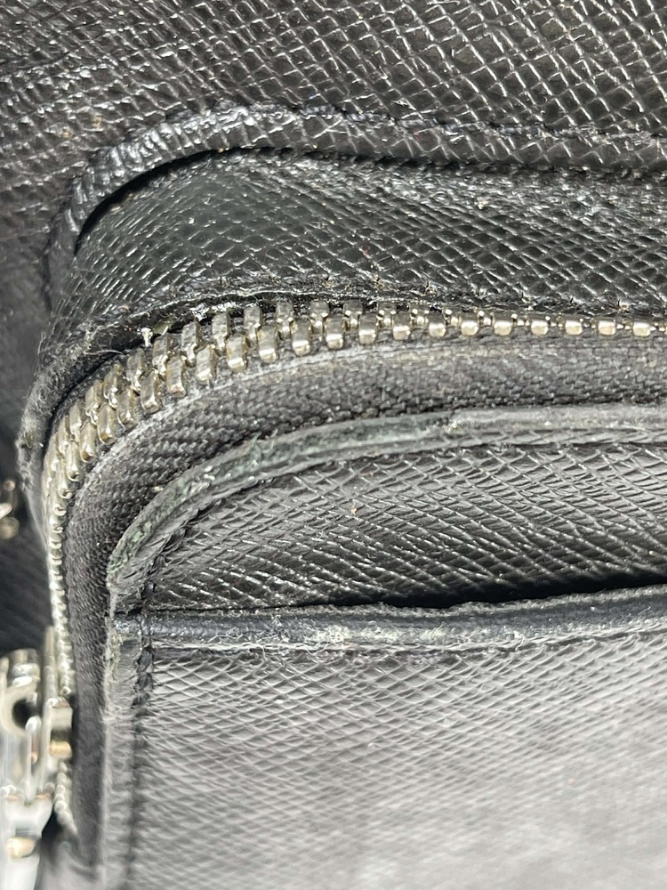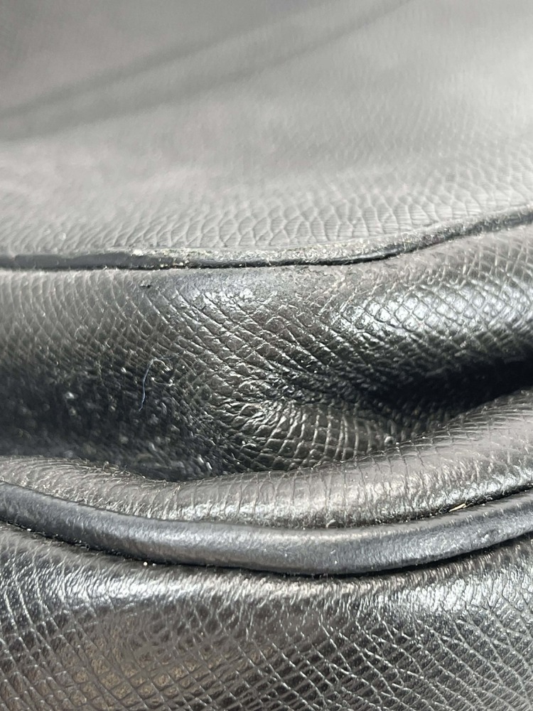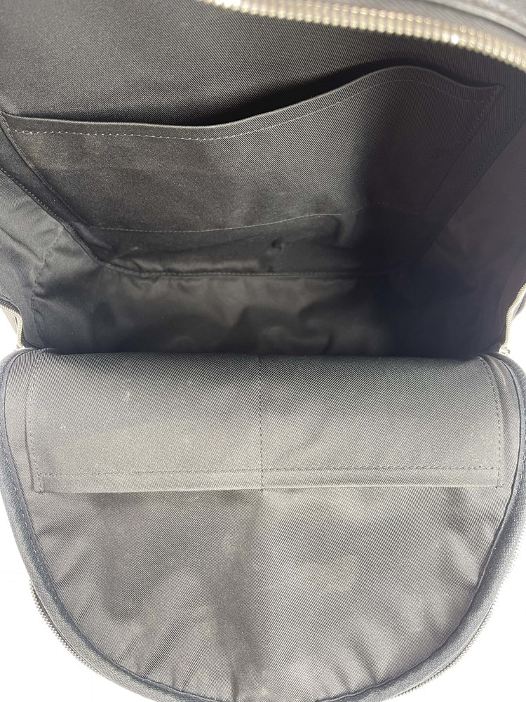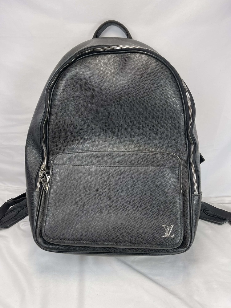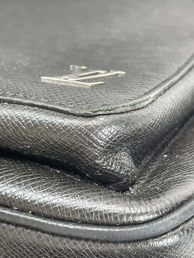 The Louis Vuitton Taiga Leather Alex Backpack Noir Black is in used condition. The exterior of the bag has multiple scuffs and stains dotted around the bag. The bag has damage around the front pocket where the piping meets the zipper. The hardware has scratches on it. The area above the main section of the has scuffing. The interior of the bag has some small stains inside the main section of the bag. Inside of the interior pocket has small stains all alond the seam.The bag comes with a COA from Entrupy. The overall condition of the bag is a (B-).