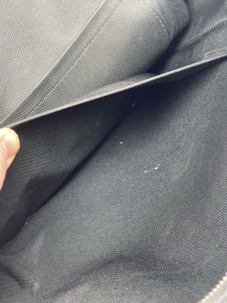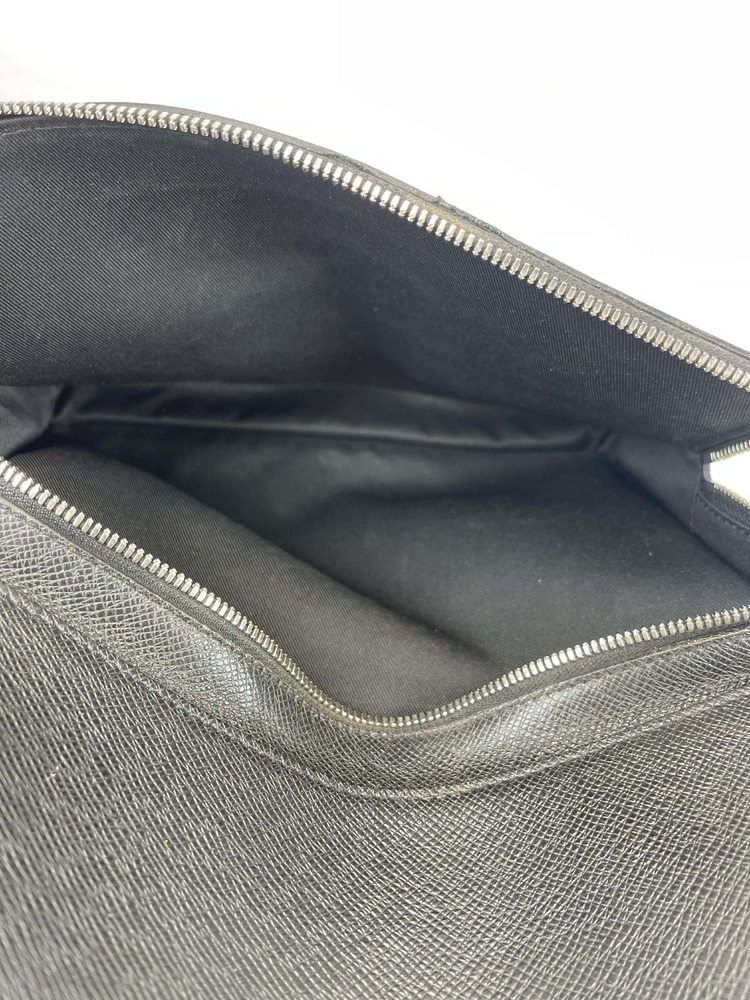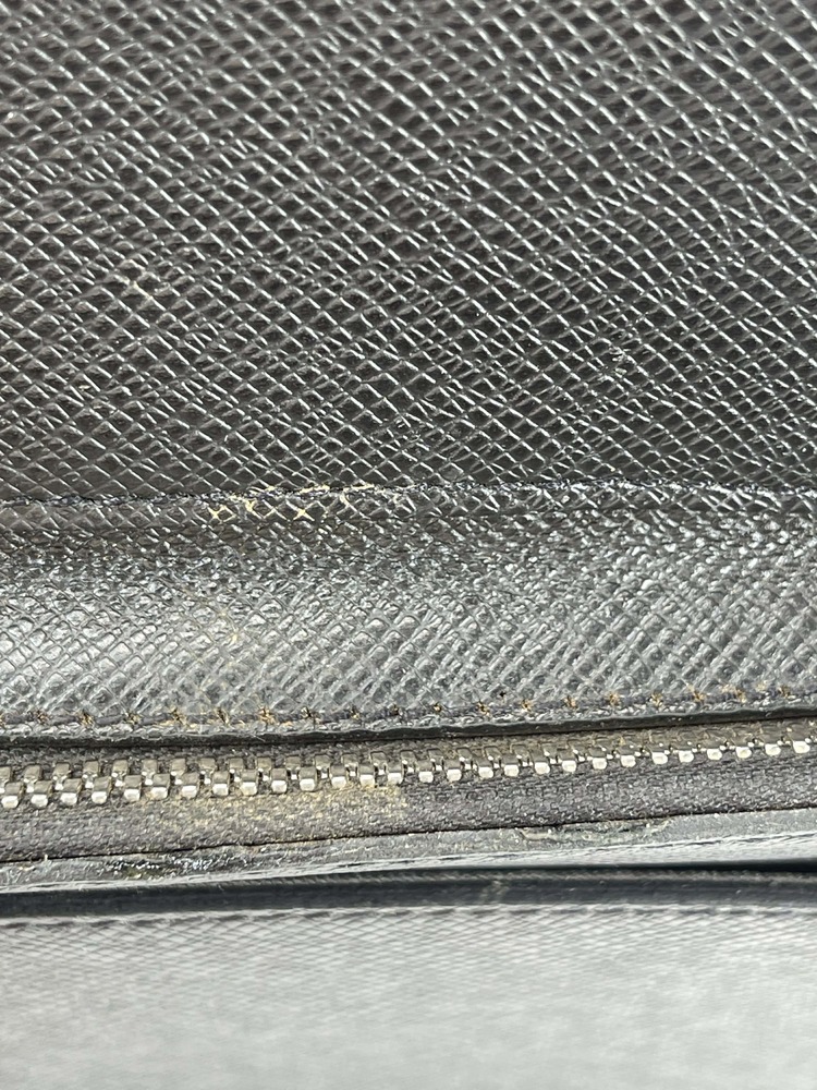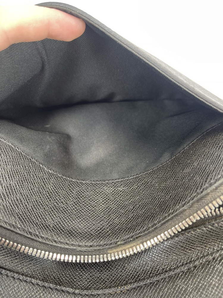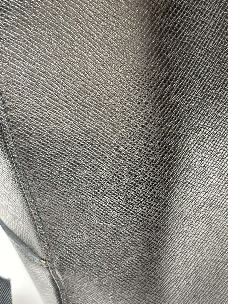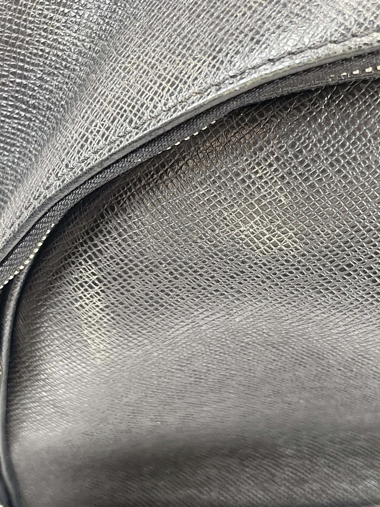 The Louis Vuitton Taiga Leather Alex Backpack Noir Black is in used condition. The exterior of the bag has multiple scuffs and stains dotted around the bag. The bag has damage around the front pocket where the piping meets the zipper. The hardware has scratches on it. The area above the main section of the has scuffing. The interior of the bag has some small stains inside the main section of the bag. Inside of the interior pocket has small stains all alond the seam.The bag comes with a COA from Entrupy. The overall condition of the bag is a (B-).