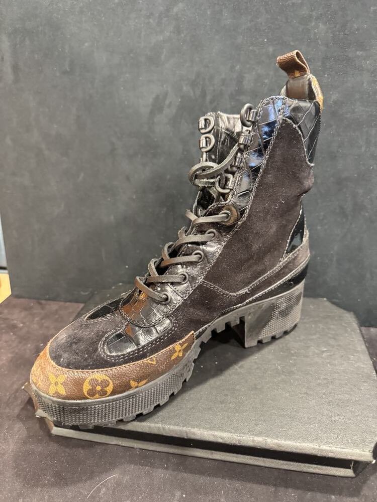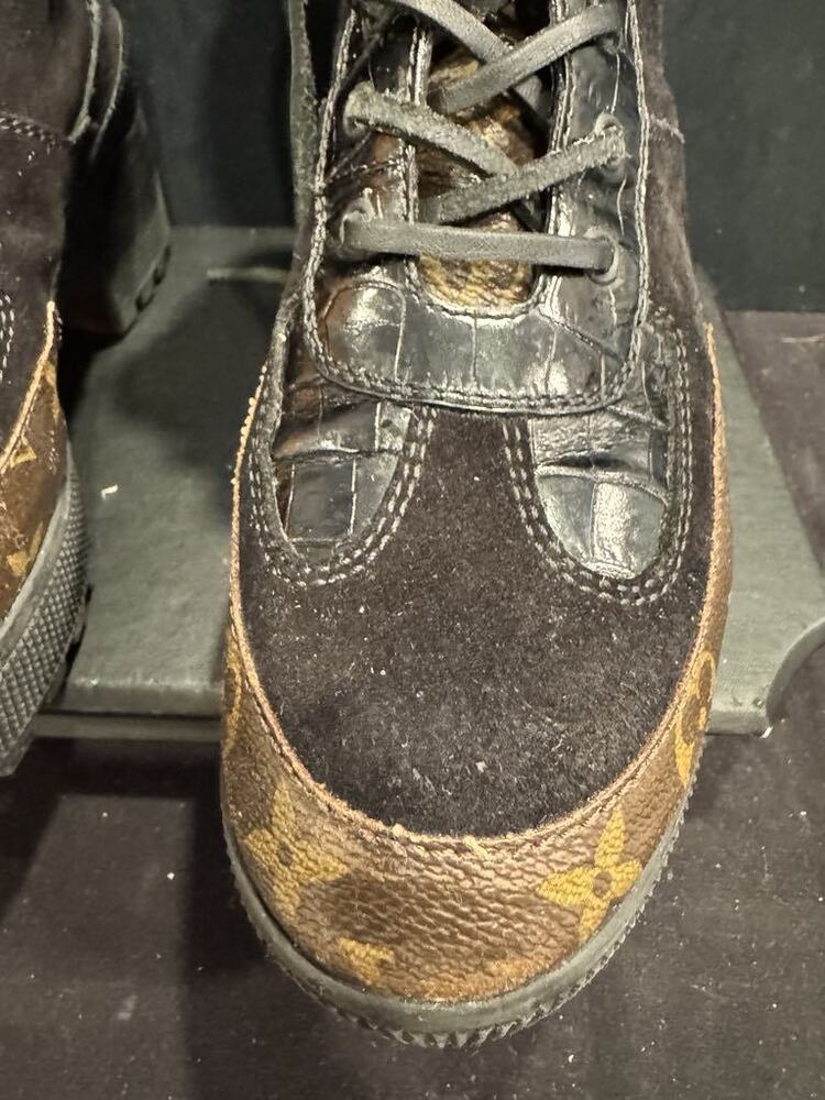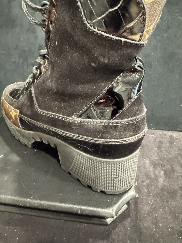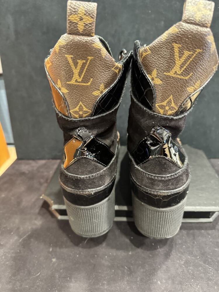 The Louis Vuitton Laureate Platform Desert Boots are a size 40 and are designed for women who want to make a statement with their footwear. With a comfortable leather insole material, these boots are perfect for all-day wear. Step out in style and add these beautiful boots to your shoe collection today!