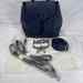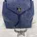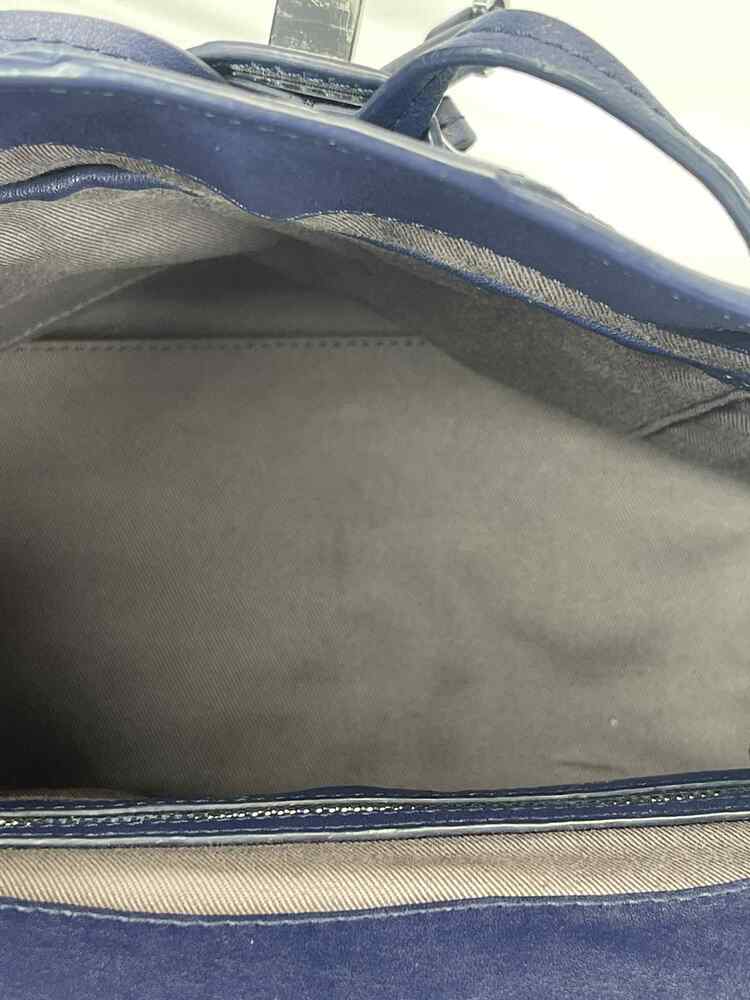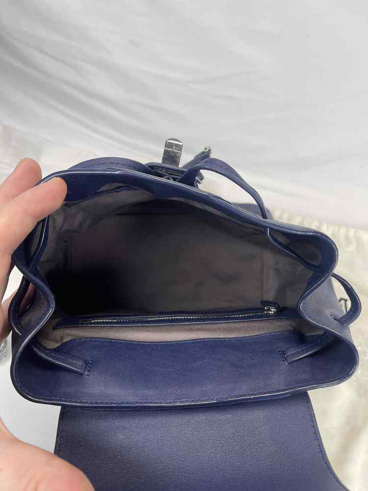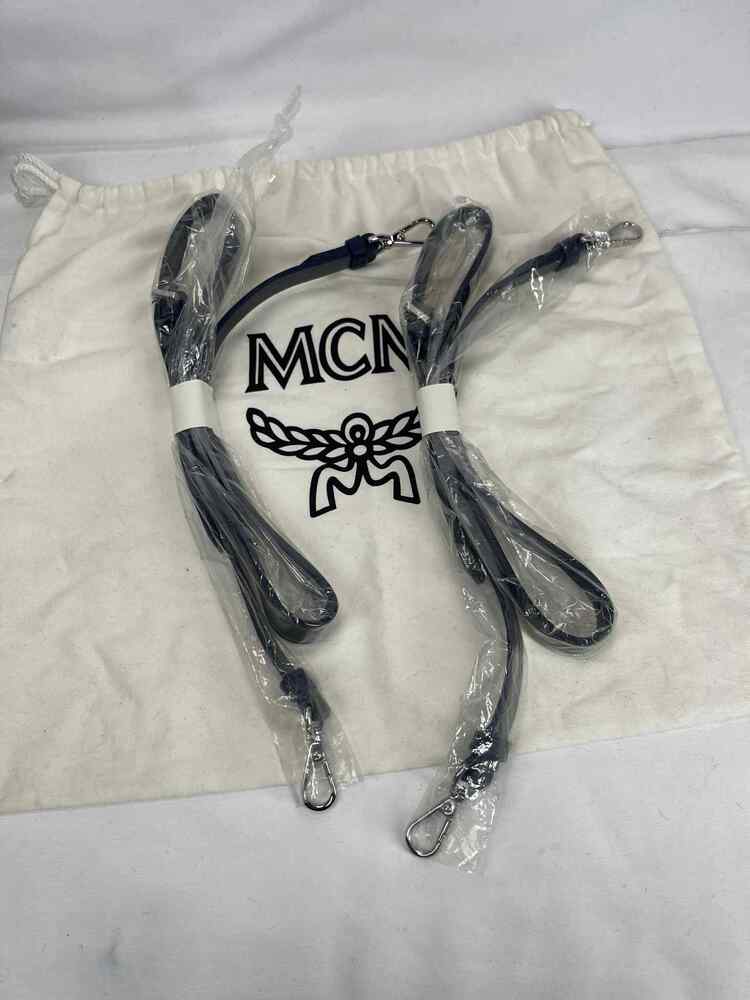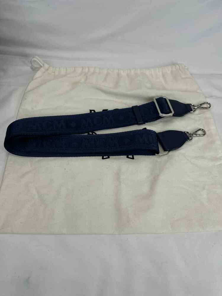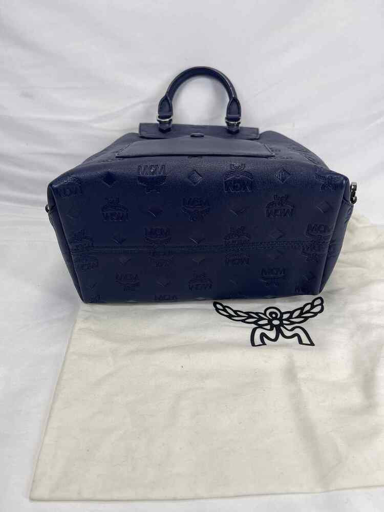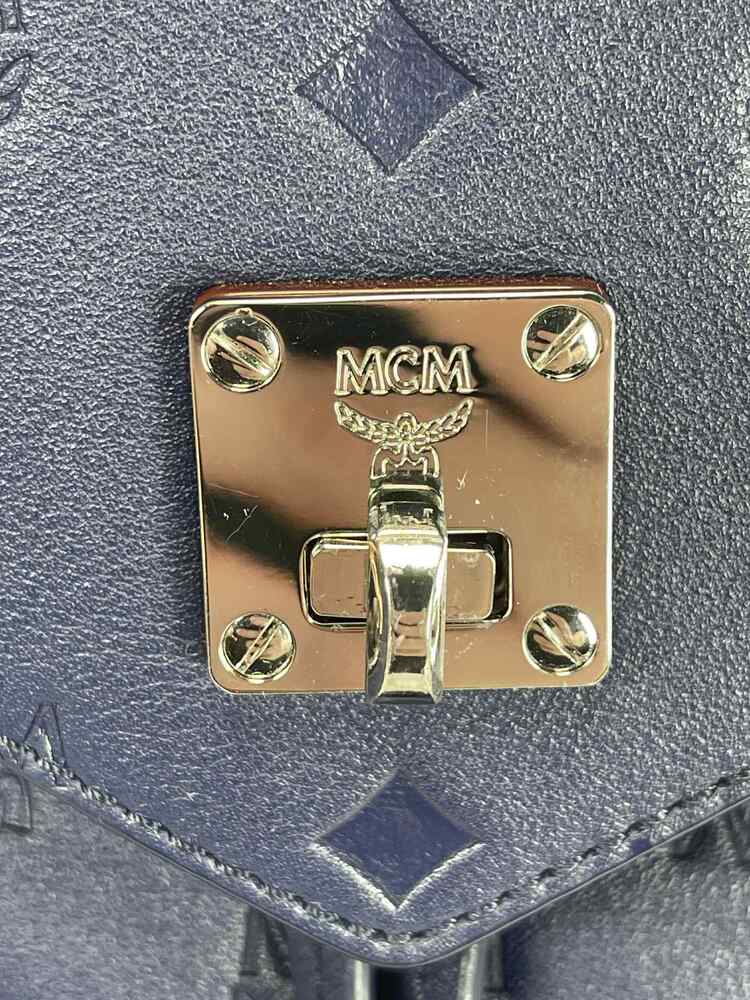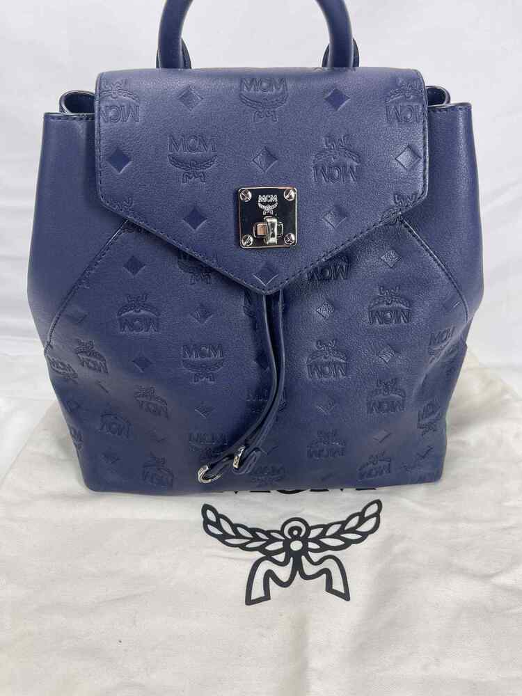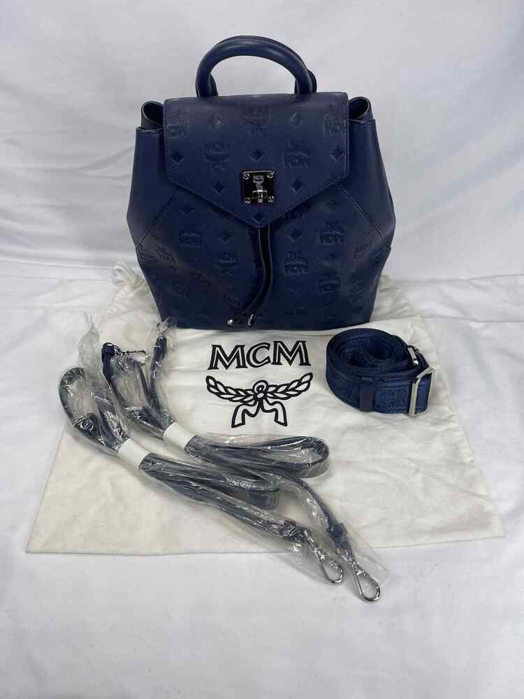 The MCM Visetos Essential Small Backpack Blue is in good condition. The exterior of the bag is in good condition with light scratching on the hardware. The crossbody strap is in good condition with no major signs of use. The two shoulder straps are still in the original packaging. The interior of the bag is in good condition with one small white stain. The bag comes with dustbag and COA from Entrupy. The overall condition of the bag is an (A).