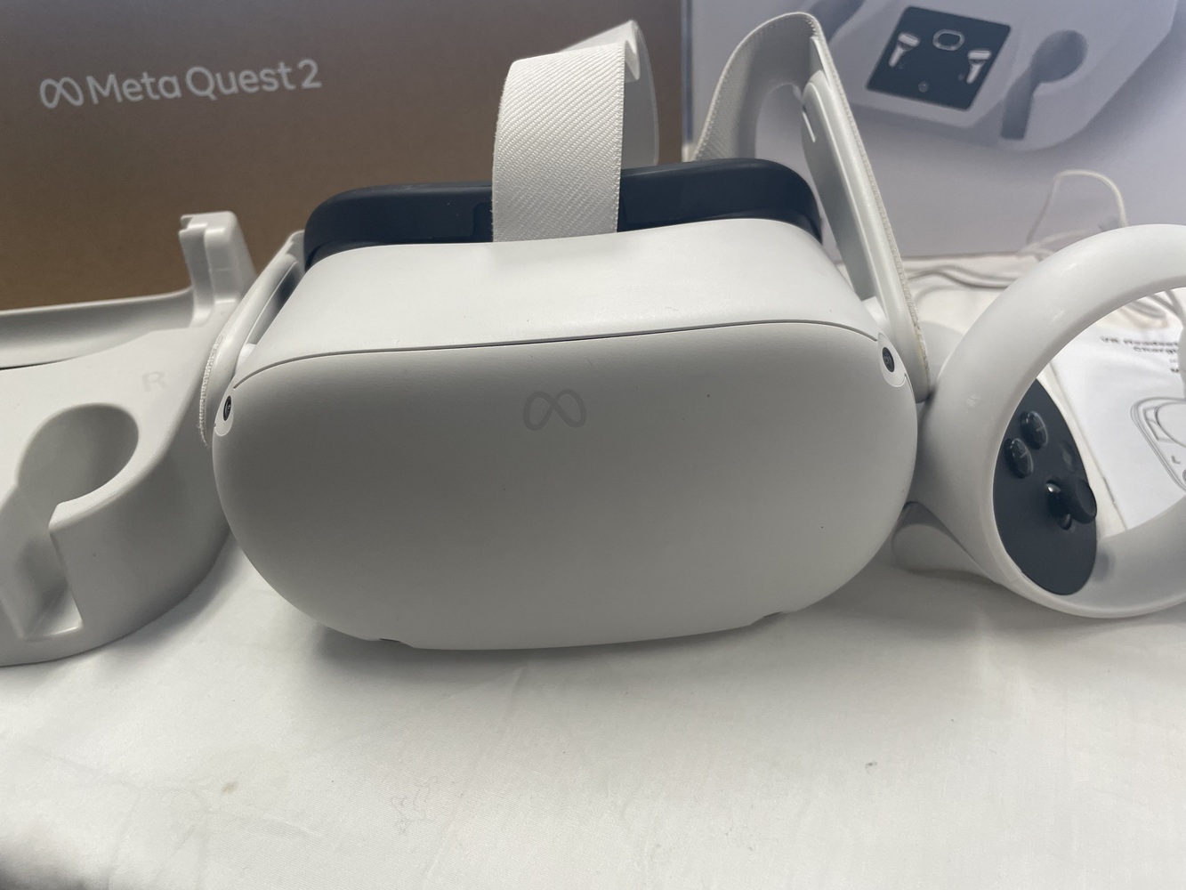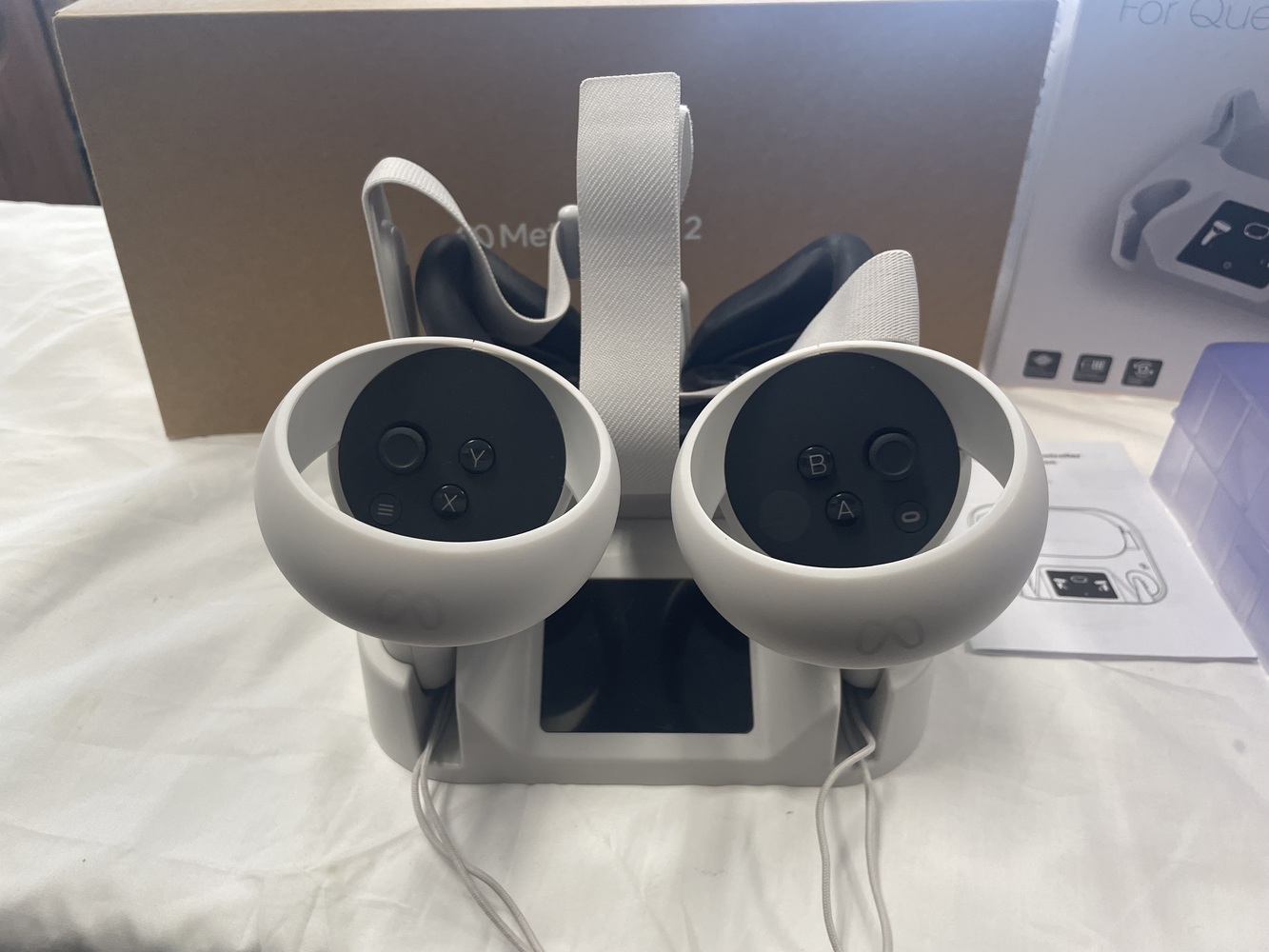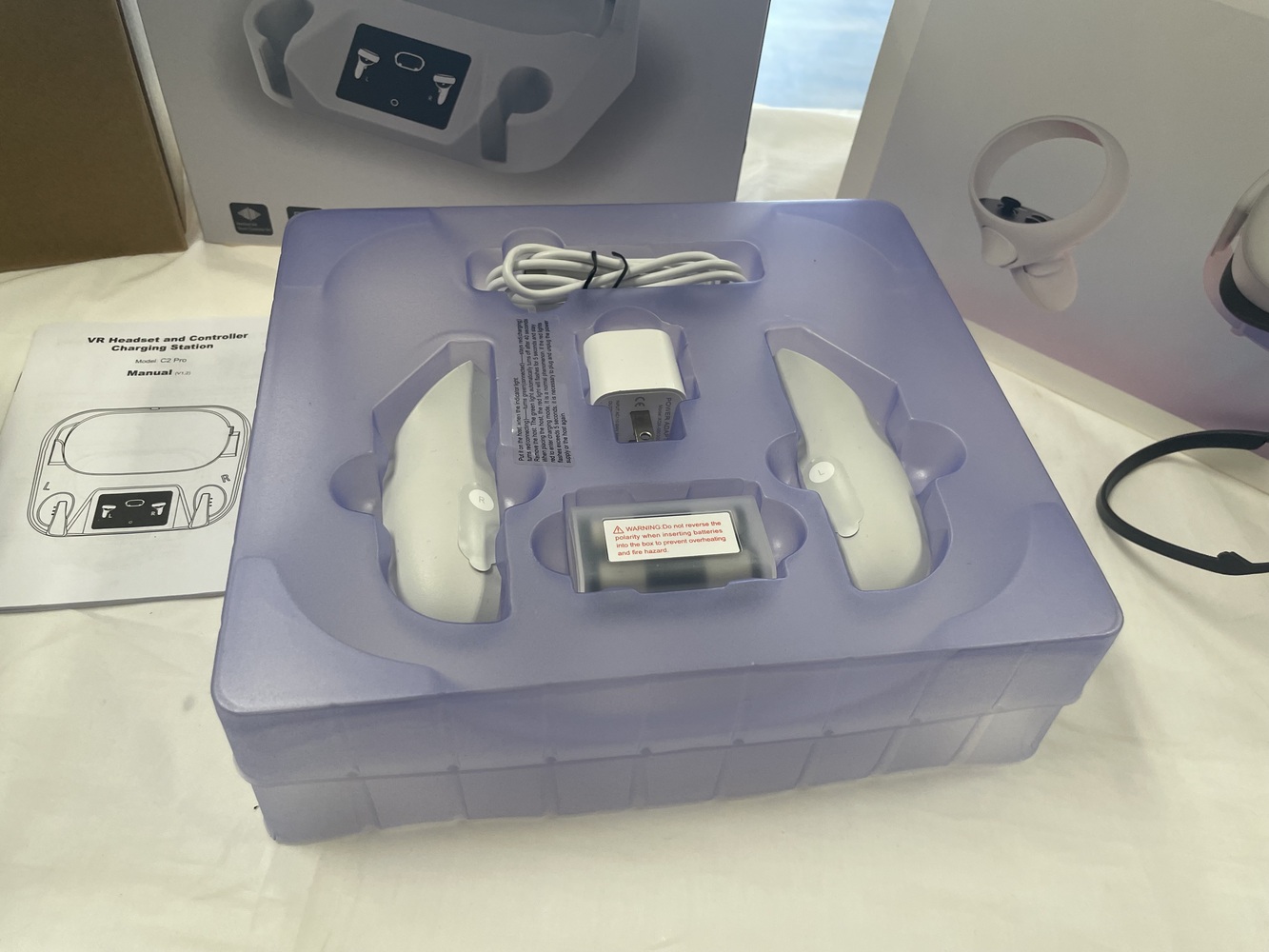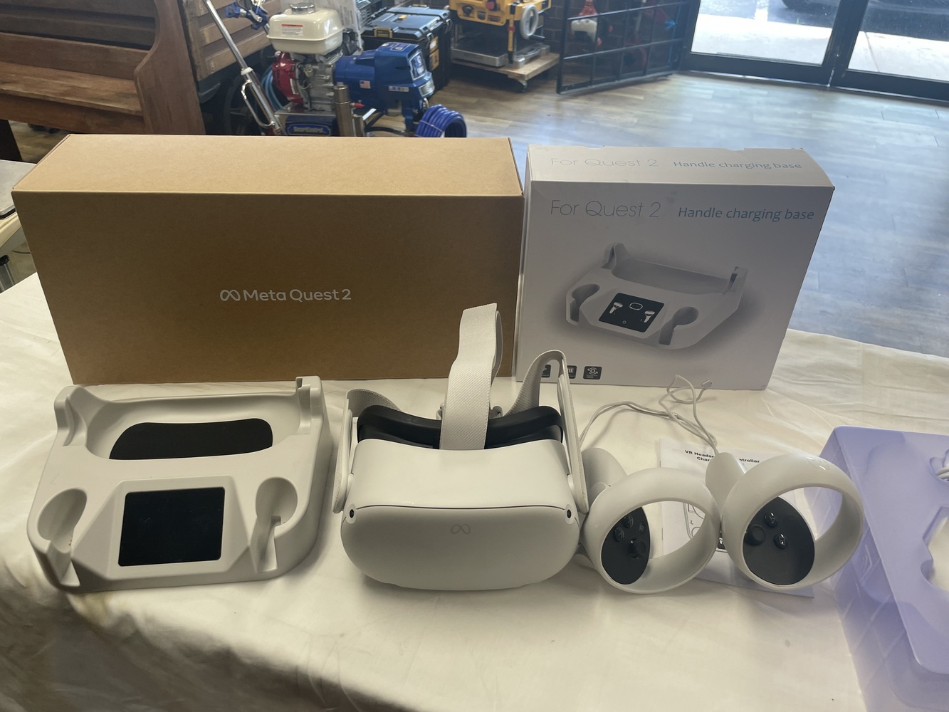 This is a preowned Meta Quest 2 in the Original Box will all accessories (EXCEPT the C Charge Cable and Brick) In Very Good Used Condition. Quest has been Tested and Factory Reset. Quest comes with a Wireless Charging Dock. Dock has the Original Battery Covers in the package with the recharagable ones already installed on the controllers - has 2 rechargable batteries (taken out for shipment) - Dongal for the quest in a plastic zip bag - and brick and c-cable. all in very good condition. Pictures are of the actual items you will receive.