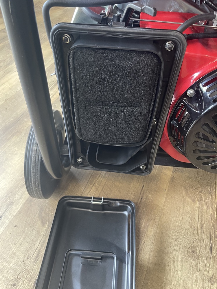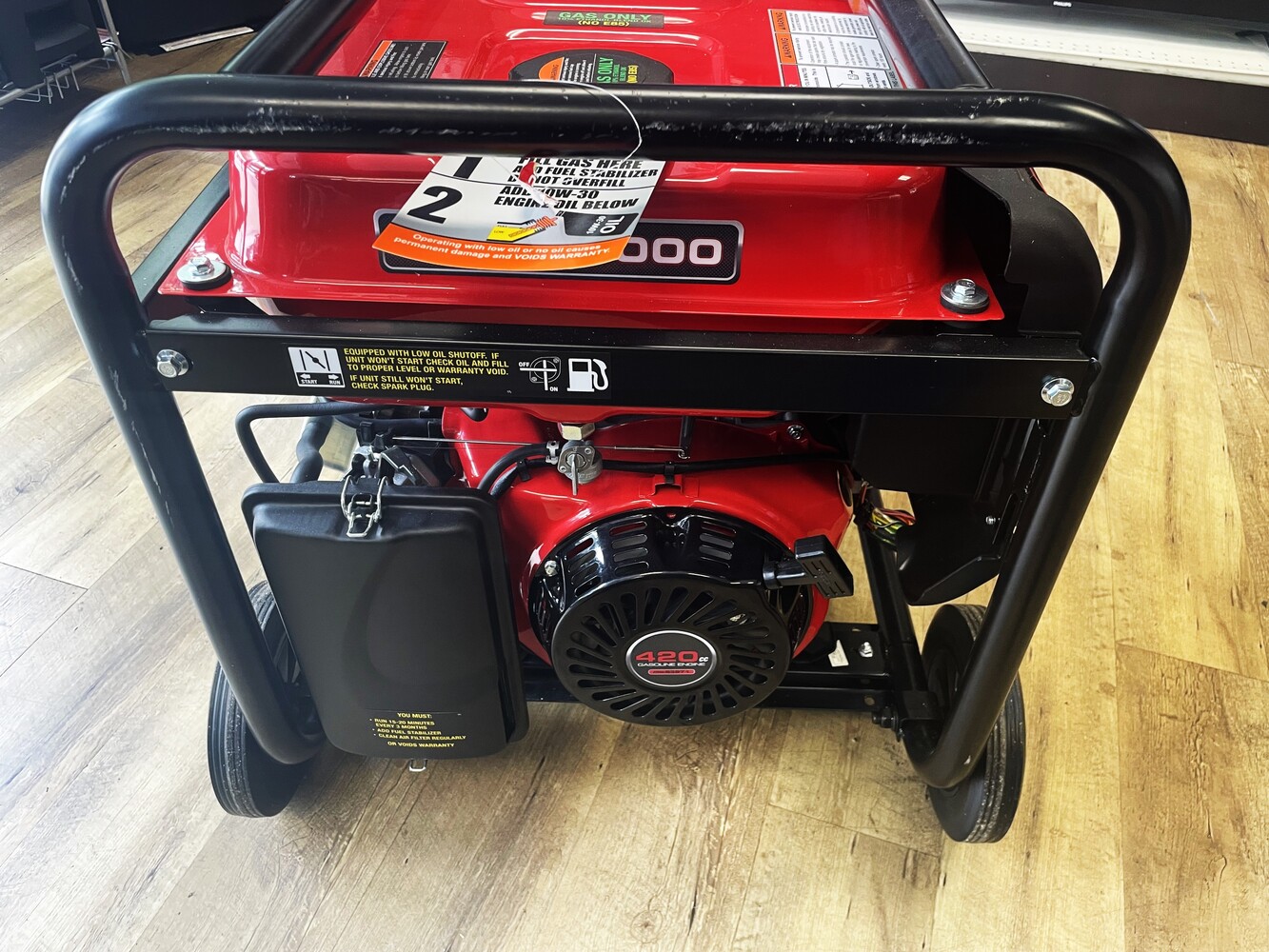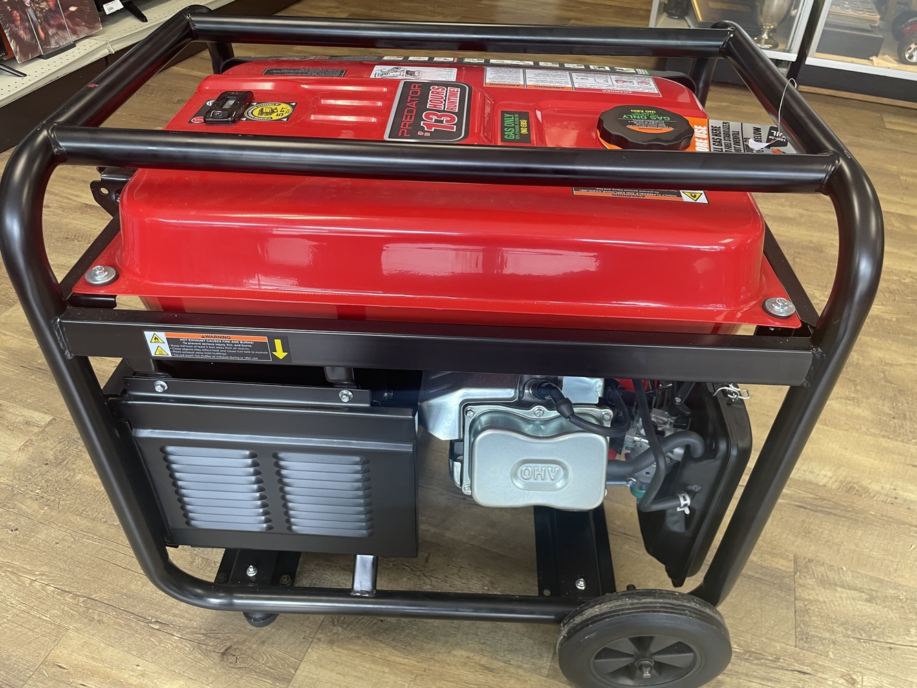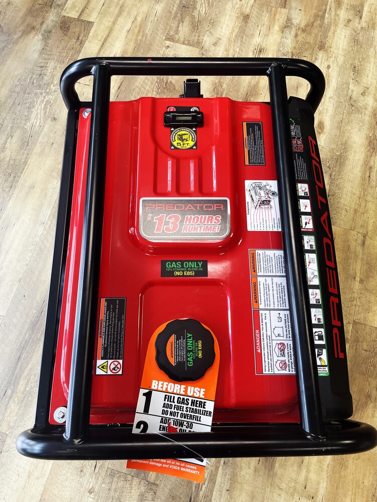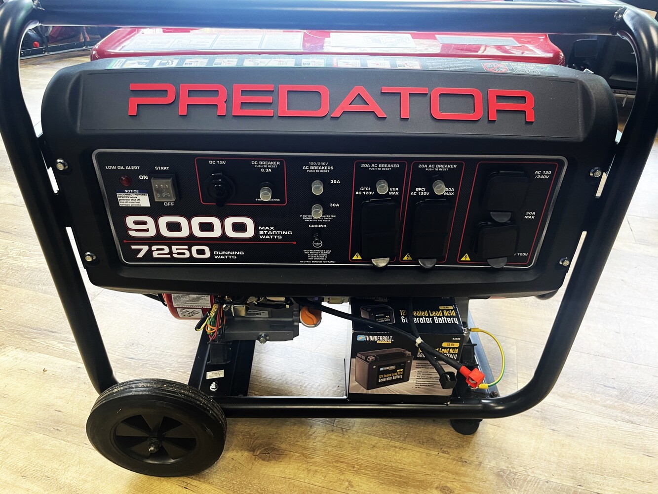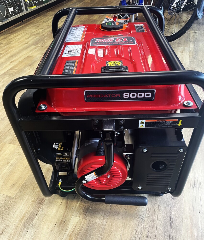 The Predator 9000-watt portable generator is a popular choice for providing backup power during outages, for jobsites, and for recreational use. It features a powerful 420cc engine, electric start (with recoil backup), and multiple outlets including GFCI and twist-lock options. It also has safety features like CO secure technology, low-oil shutdown, and UL-listed circuit breakers. Does have some dirt on the wheels from being moved.