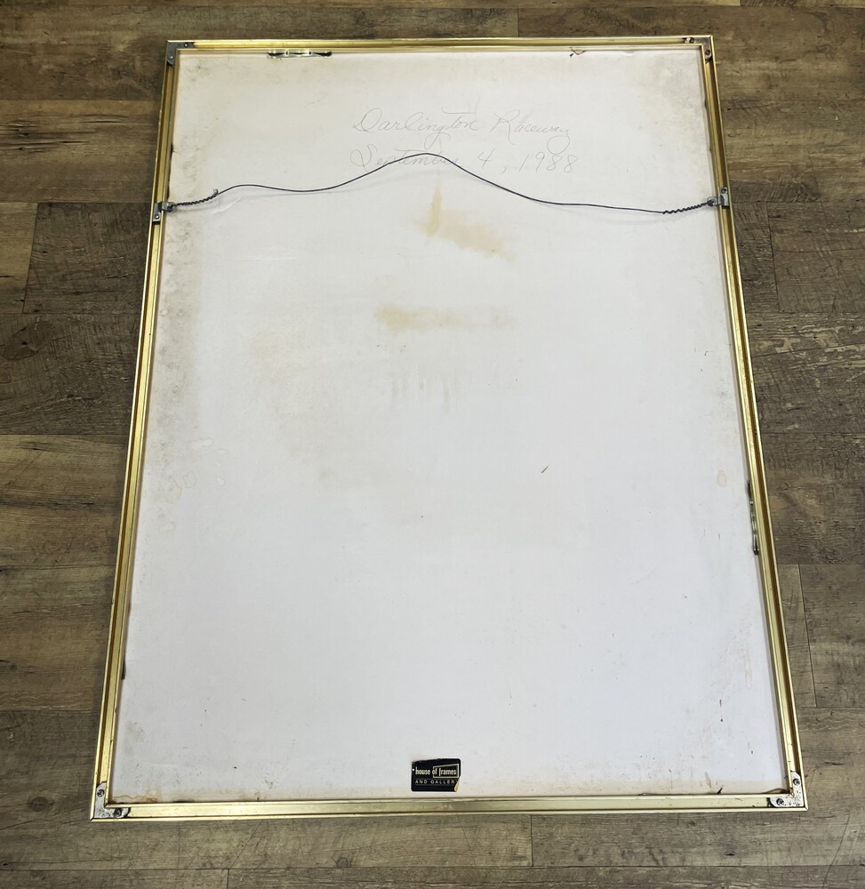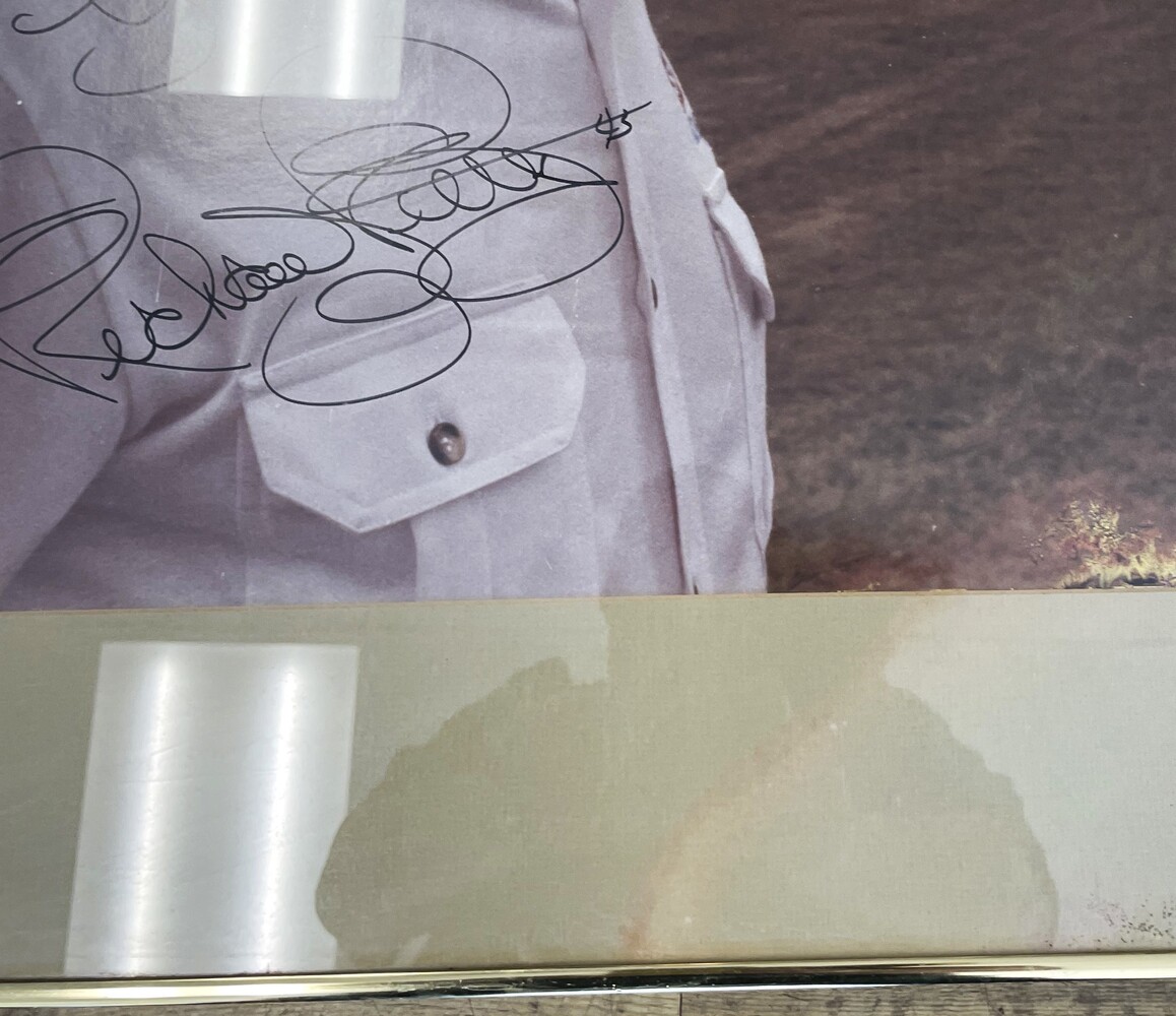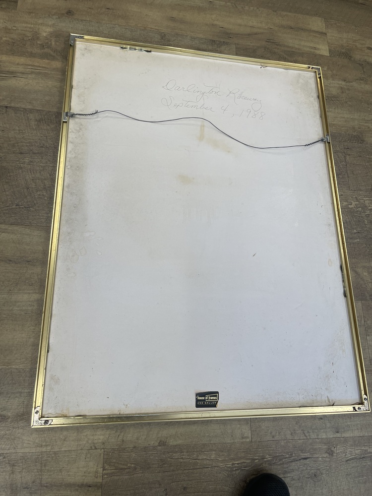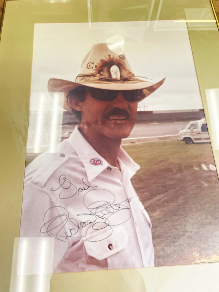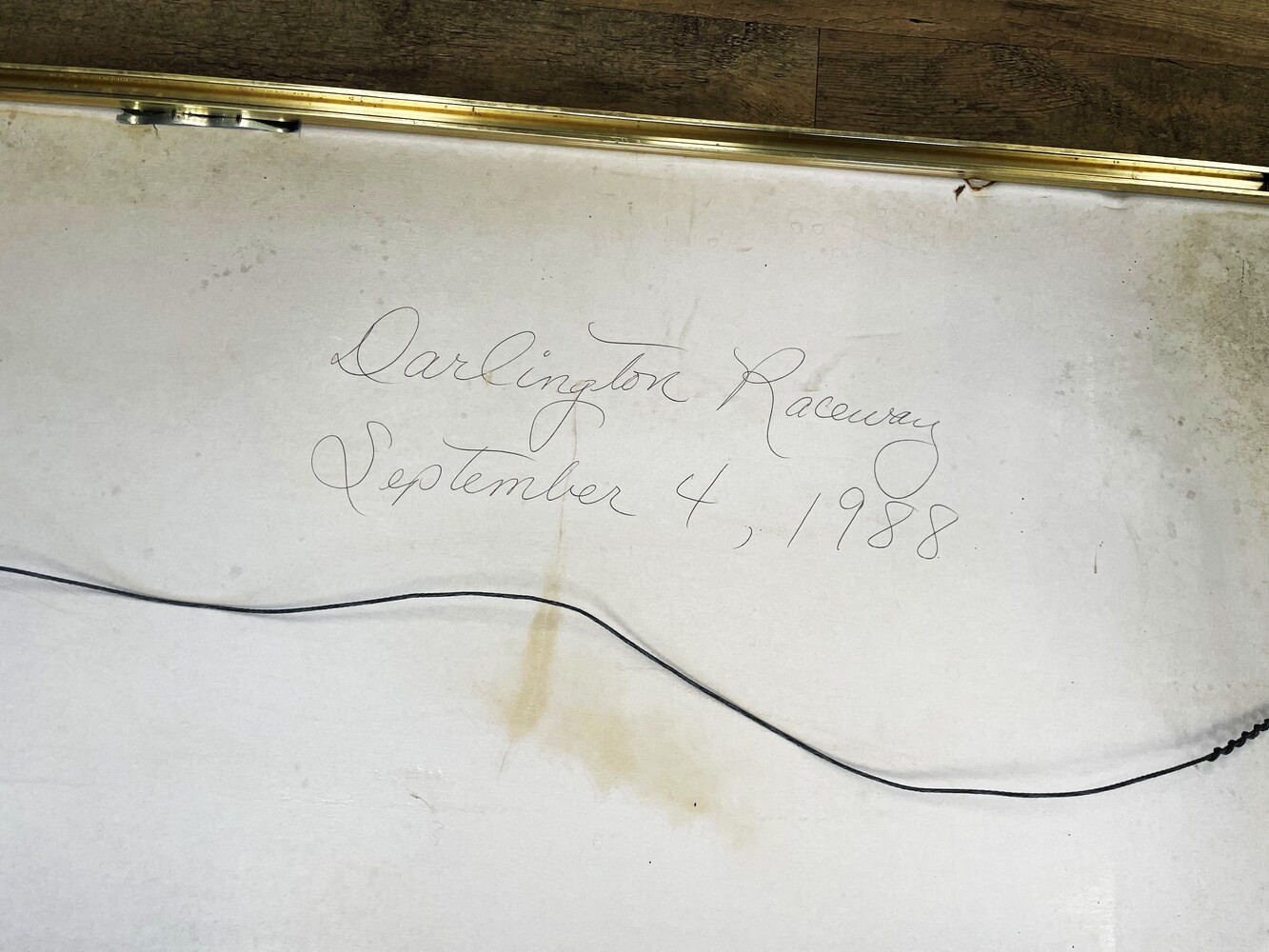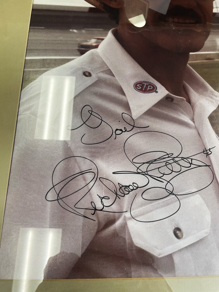 This is a preowned 1988 Framed Poster of Richard Petty ( Signed Gail Richard Petty) . This a nice piece of the past . Poster Does have some water damage as shown in the pictures - aging signs in discoloration - and has a crack in the right hand bottom corner of the glass. The lighted parts of the pictures are the lights in our ceiling. Sorry Frame is 37" x 28" x1"