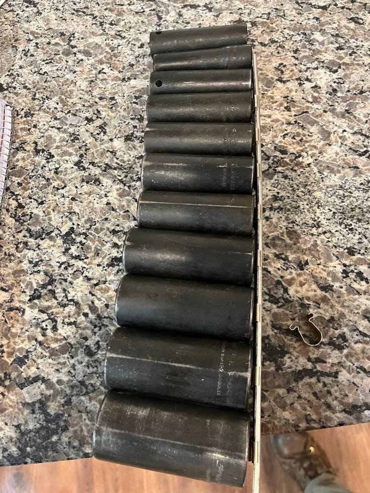Snap On 1/2" Drive Deepwell Impact sockets 6 point 11 piece. Inclues 1/2",9/16",5/8",11/16",3/4",13/16",13/16",15/16",1",11/16",11/8". Used ALL in good condition. ALL included in photos.