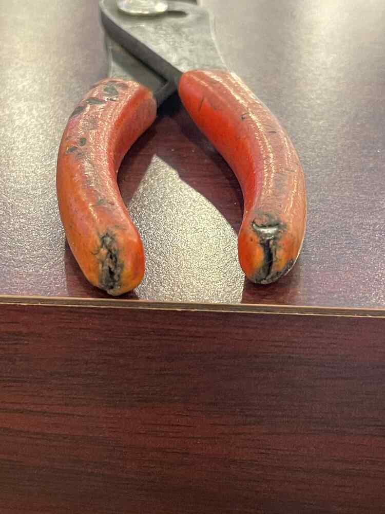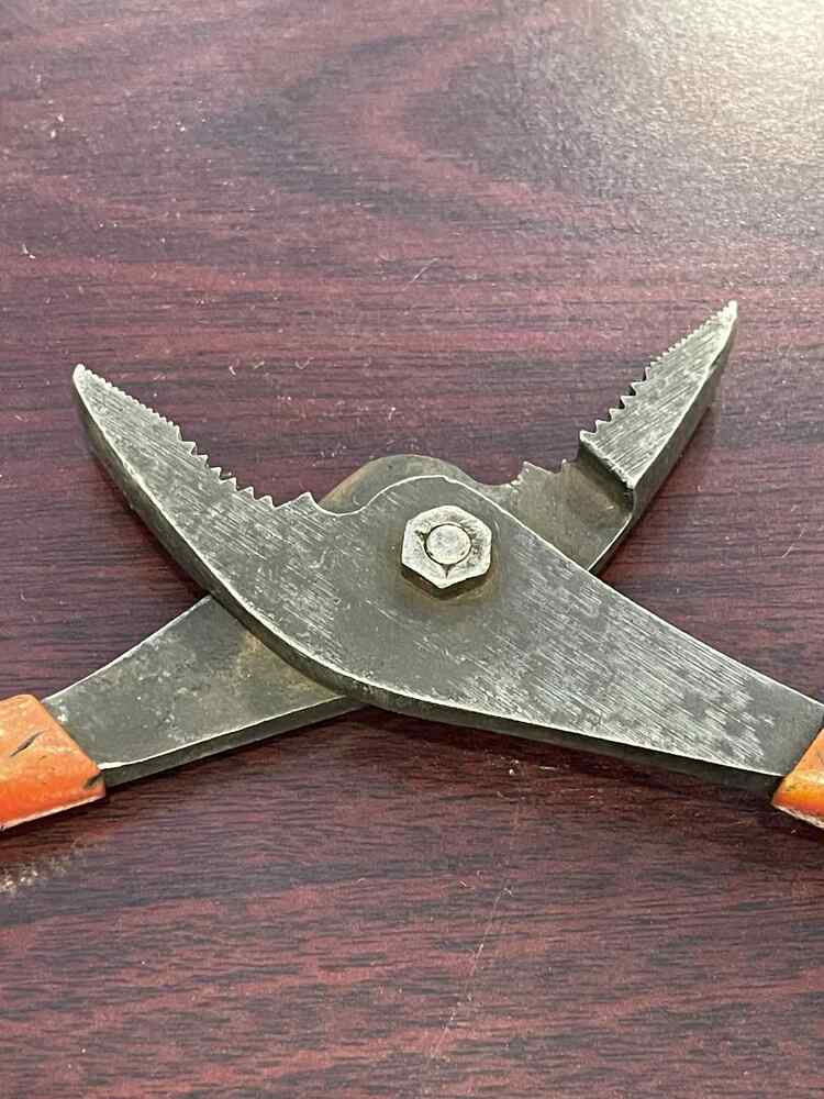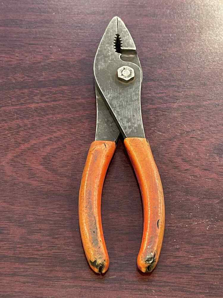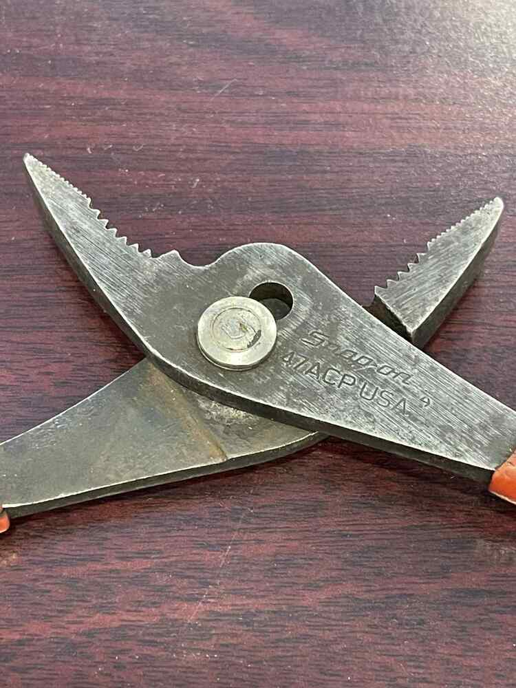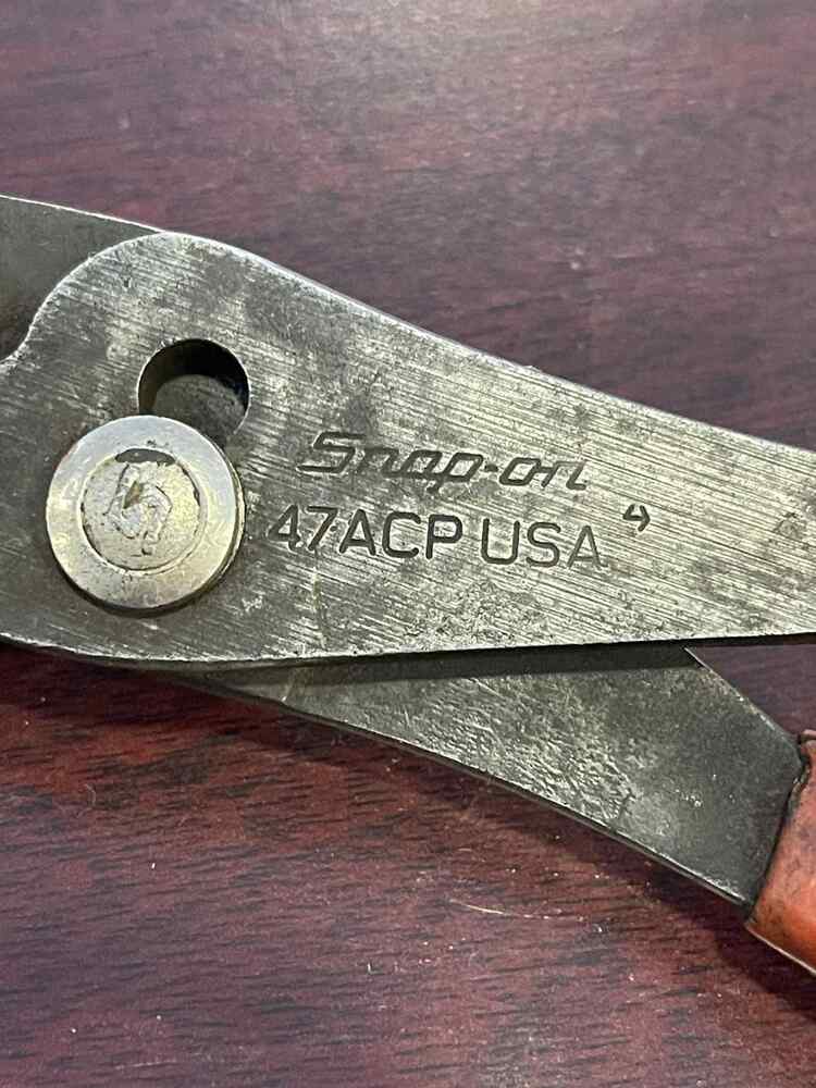 The Snap On 47 ACP Pliers is in used condition. It has rusting on the interior. The handles have visible signs of use with cracking at the bottom.