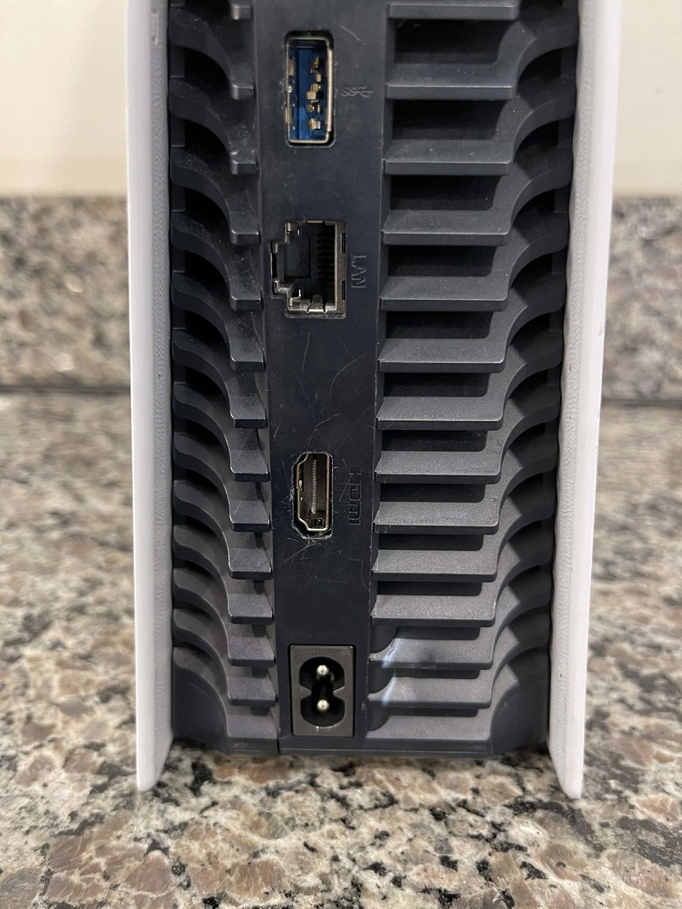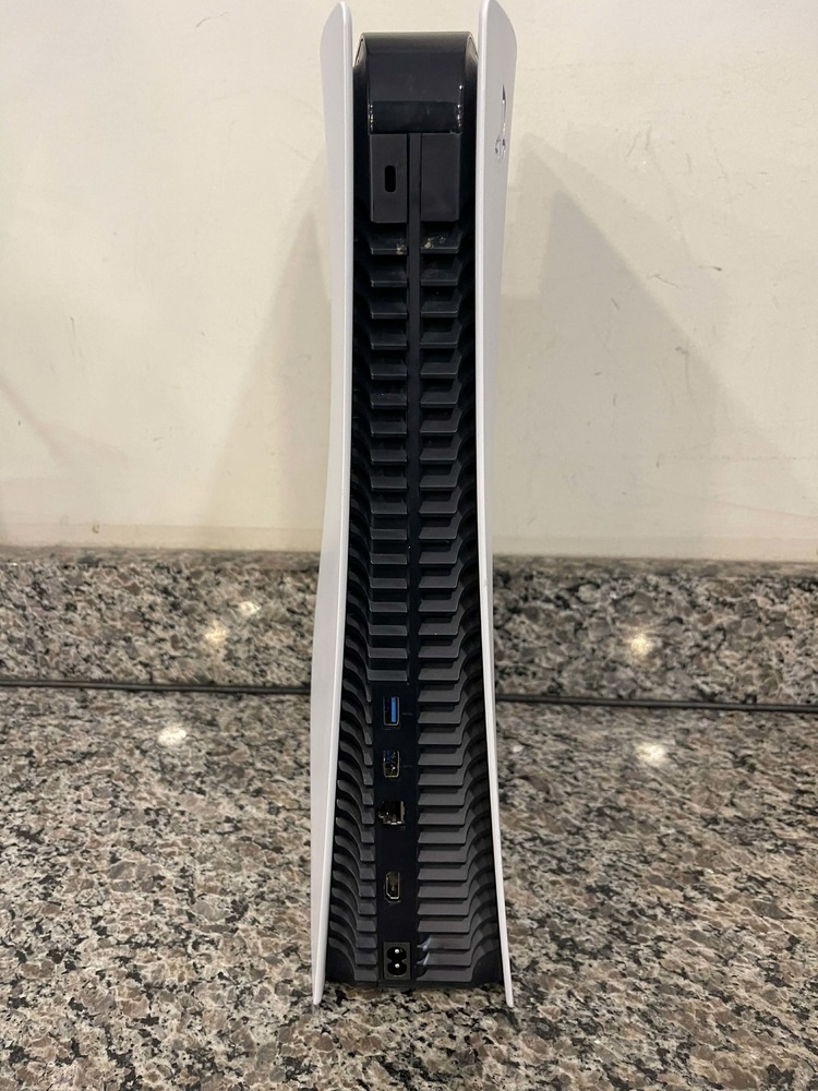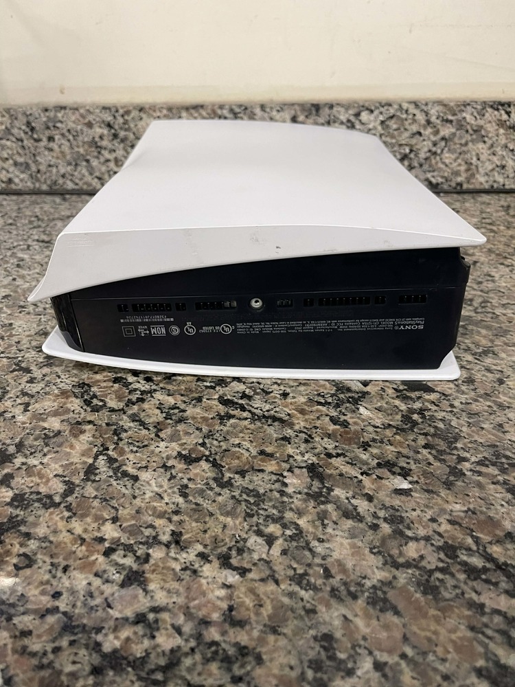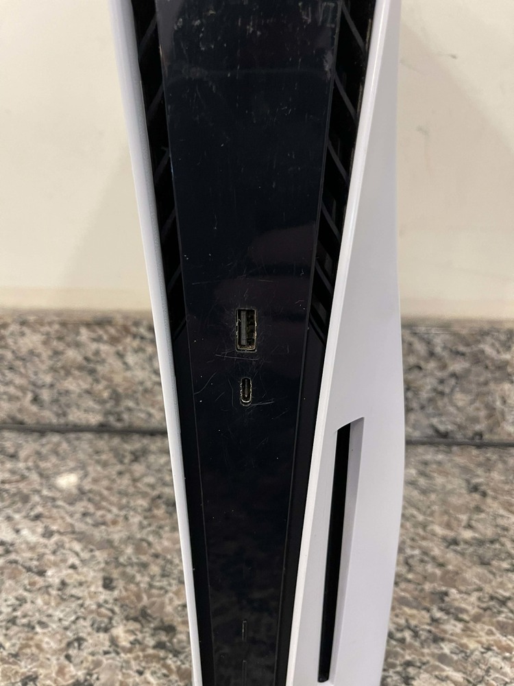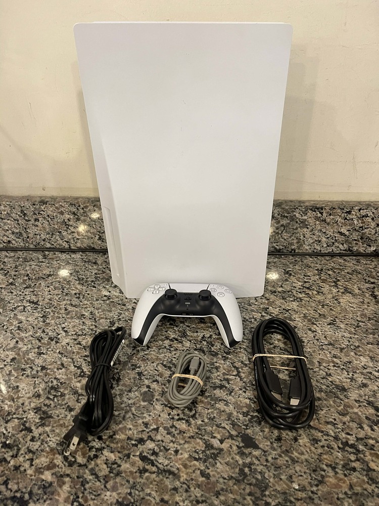 The Sony PlayStation PS5 OG Disk 1TB White is in used condition. Everything is fully funcitonal and factory reset. The console comes with HDMI, power, controller charging cable and controller. Has scuffing and scratches to the exterior of the console.