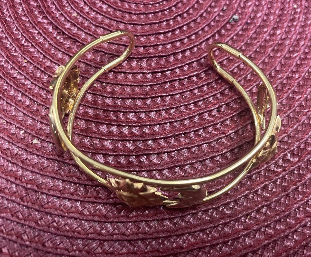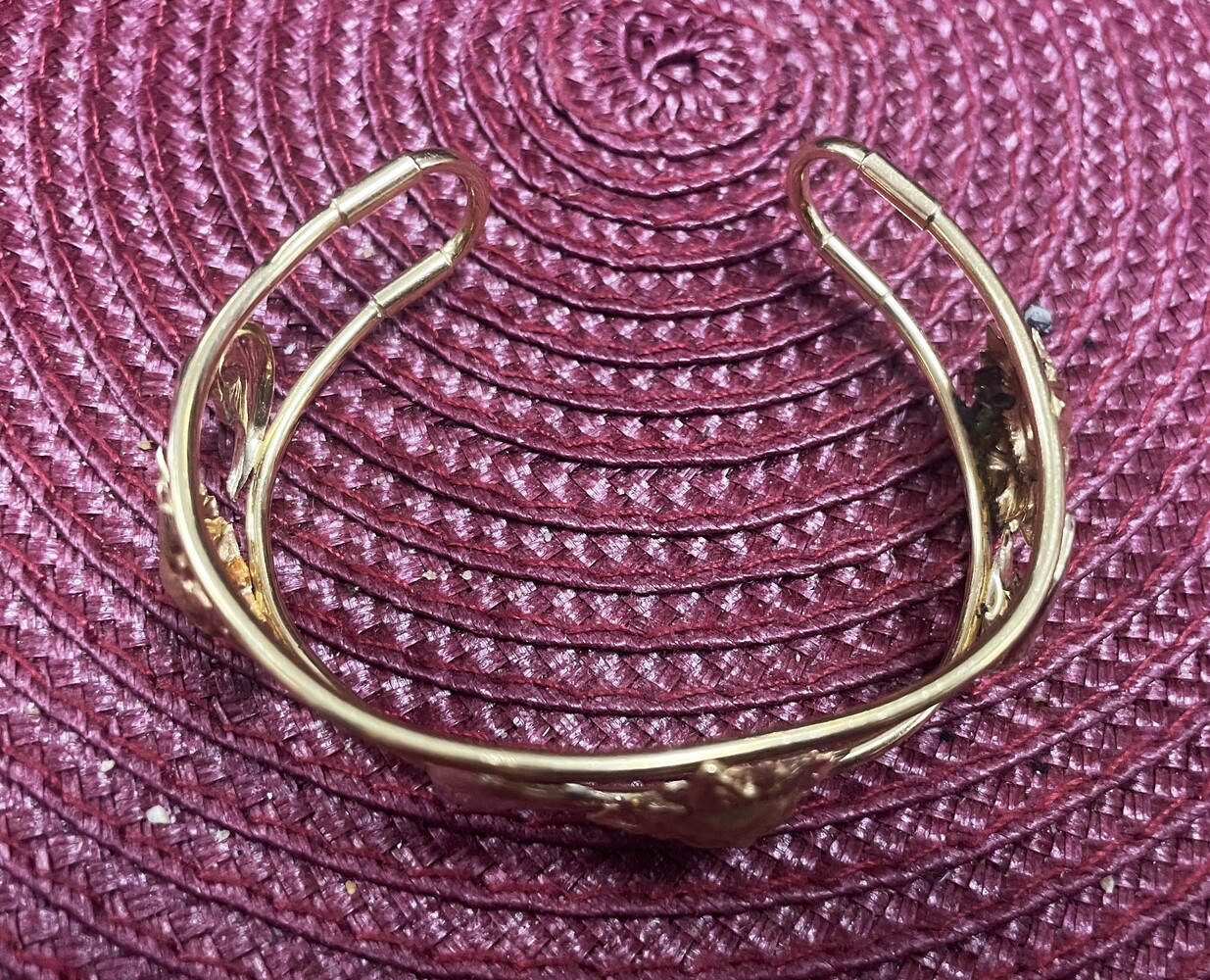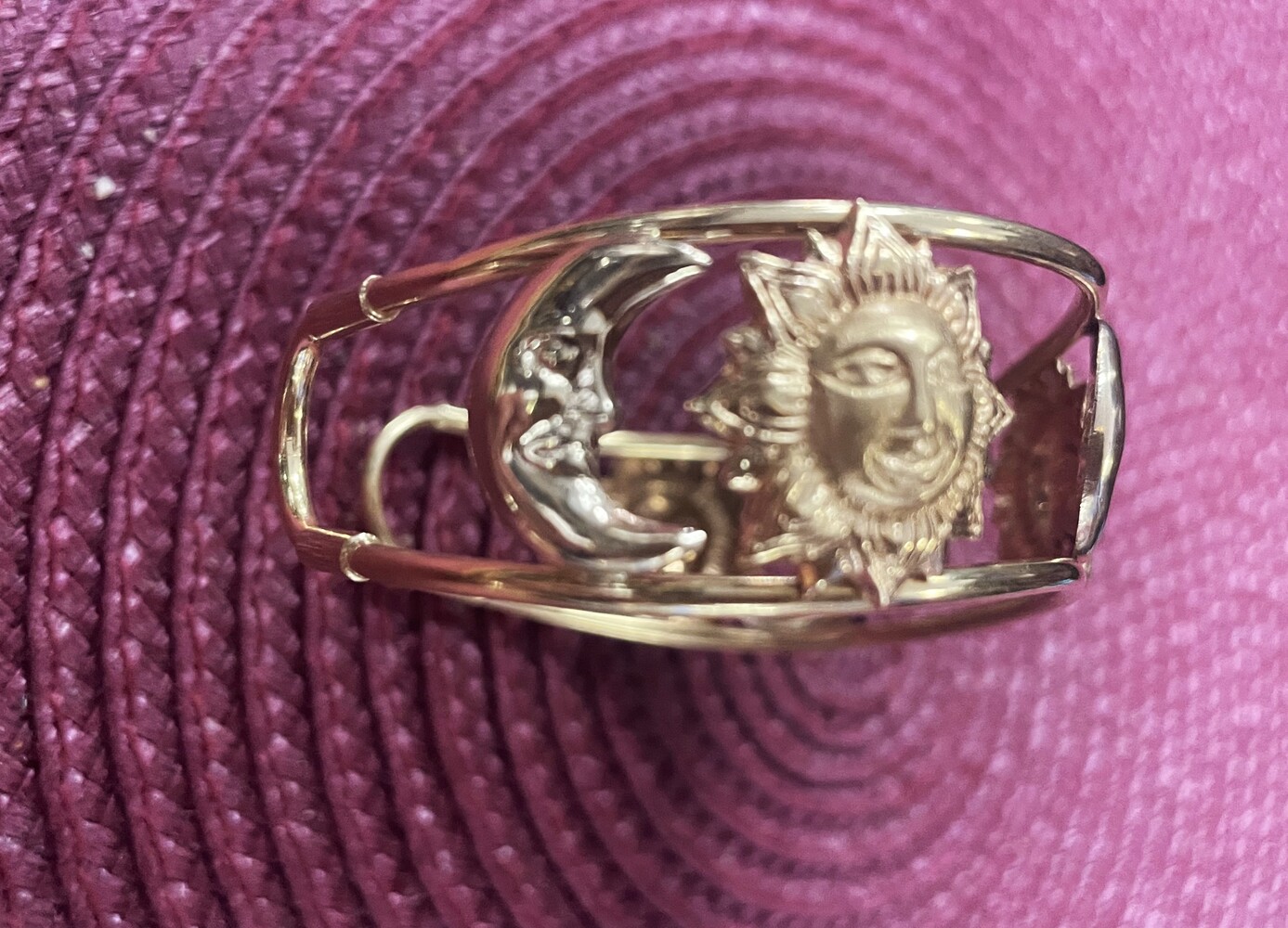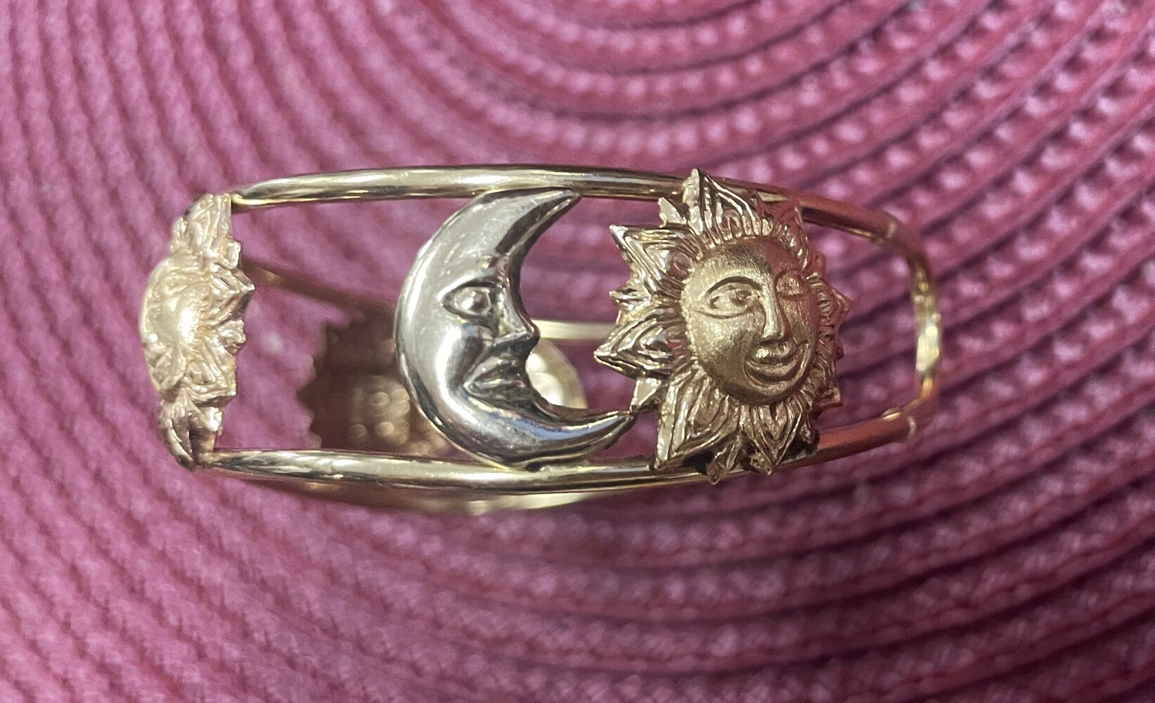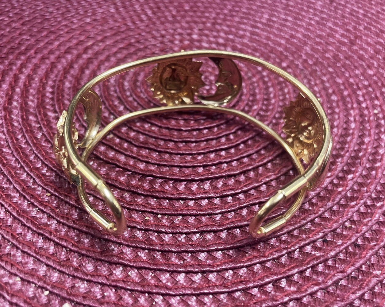 This is a preowned Sun and Moon Cuff Bracelet that will fit most Bracelet does show usage as it bends to fit your wrist . In Yellow Gold 14K 11.1G.