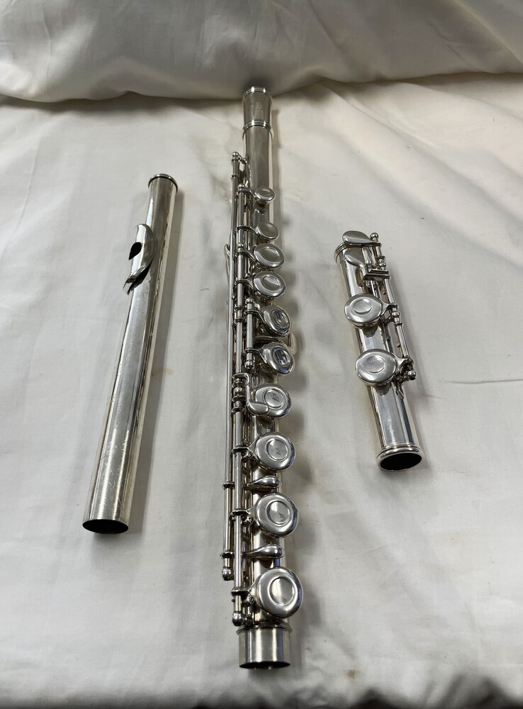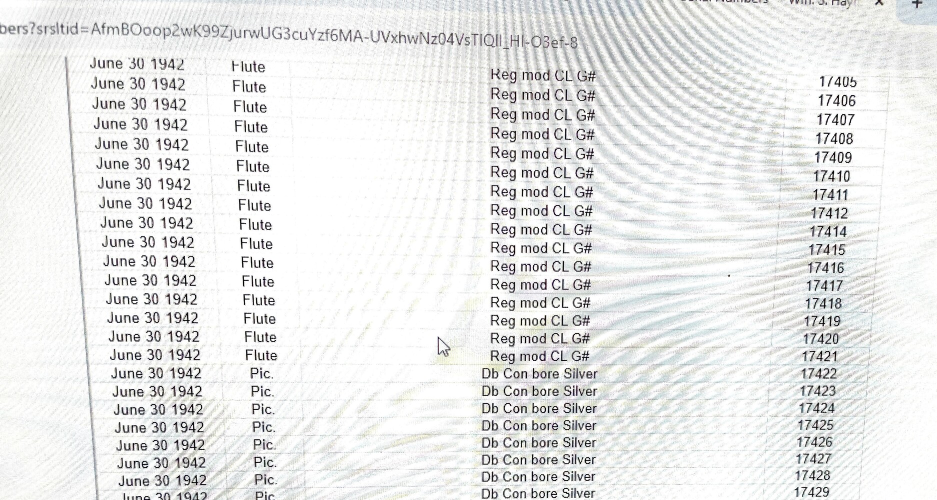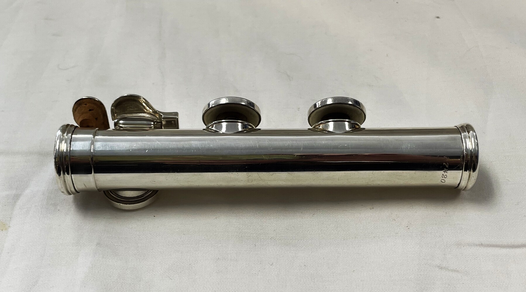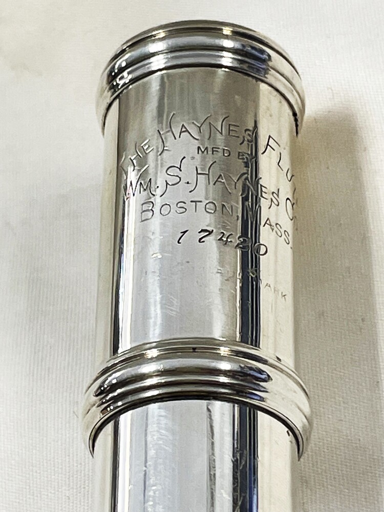 This is a Preowned Flute. The Haynes Flute by Wm. S. Haynes Co. Sterling Silver Mod CL G# - Sterling Silver Made June 30, 1942 Tested 925 Sterling . Comes with am aftermarket case . Shows Normal Wear . According to the Haynes website this flute was made in 1942. Serial # is 17420 . Mouth Piece is slightly under 925 at alittle over 900 other pieces are at 94.38 alittle over sterling.
