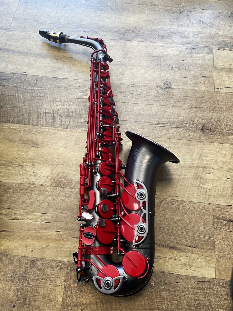 This is ia Preowned Victory Musical Instruments Red Lava Special Edition Professional Alto Saxophone in very good condition. This Sax comes with a hard backpack carrying case and storage bag . Sax also comes with accessories shown in the pictures. NOTE: There is some gold paint on the mouth piece I am not sure it it was made like this or it came this way. Does so light signs of usage - may have some minor scratches on it... Some General Information listed Below not all may Apply: