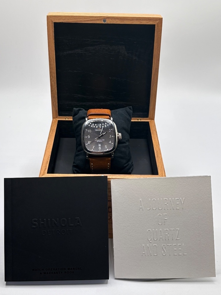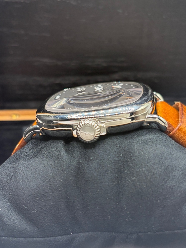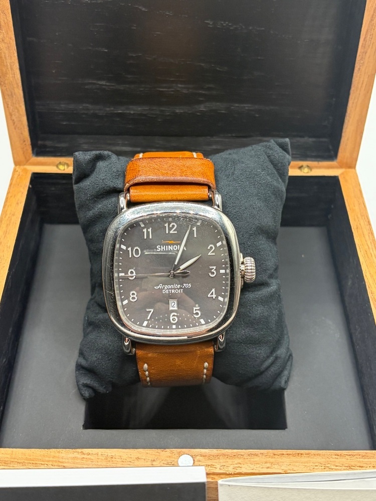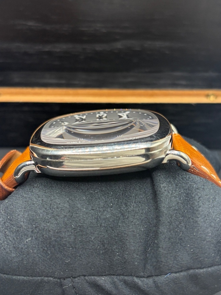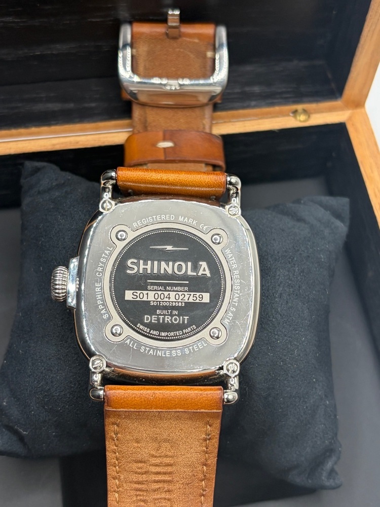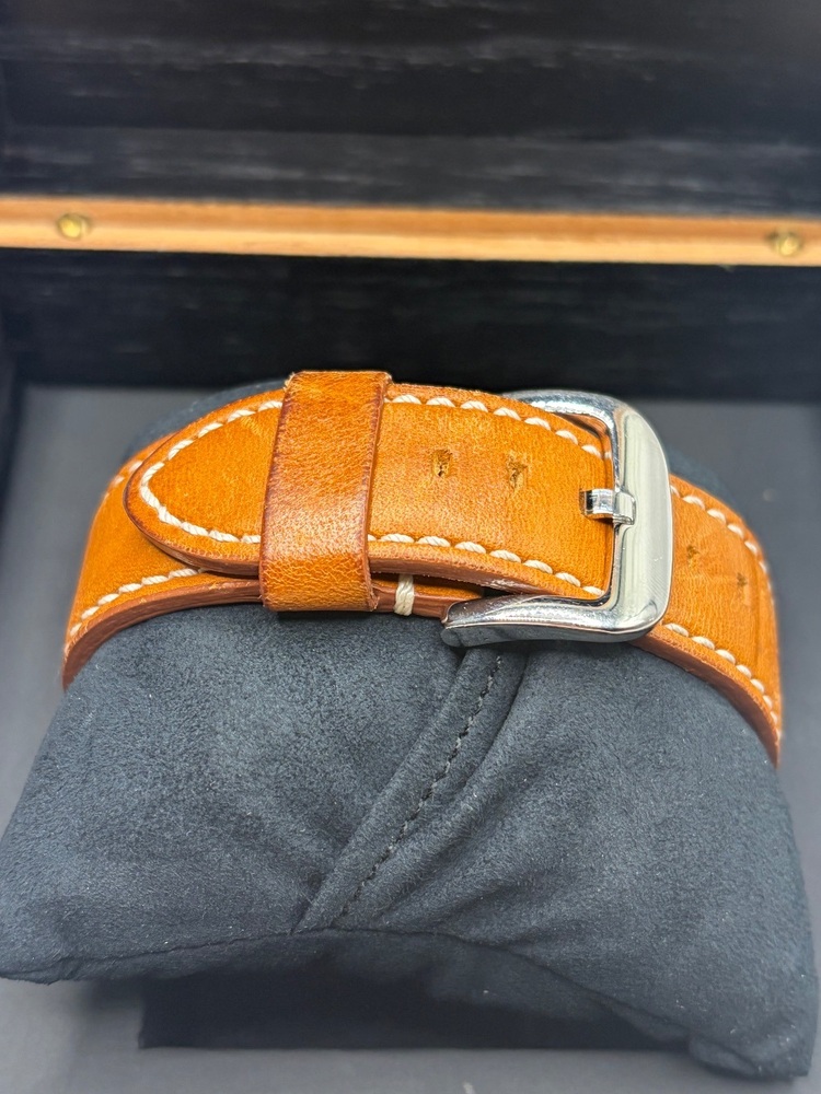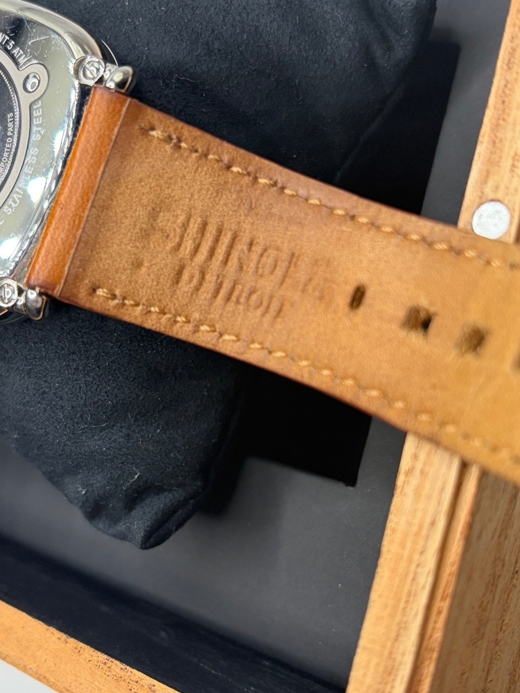 A popular watch known for its distinctive rounded square stainless steel case, sapphire crystal, and reliable Argonite 705 Swiss quartz movement, featuring a date display and Super-LumiNova hands on dials like white, blue, or green, paired with American leather straps for a blend of industrial style and classic functionality, offering 50m water resistance. Comes with box, info and warranty booklet. SPB JA-358832