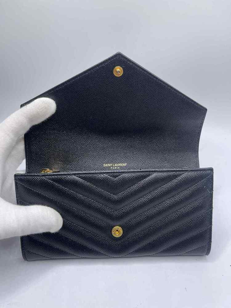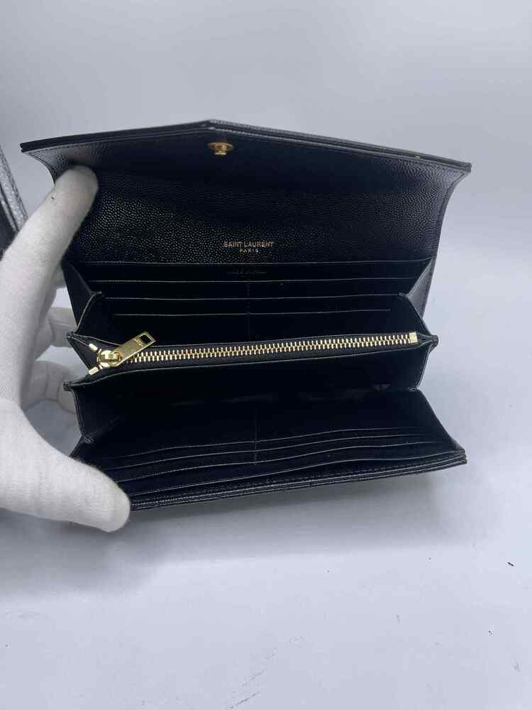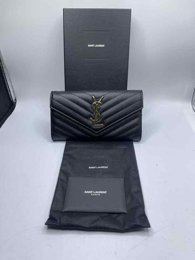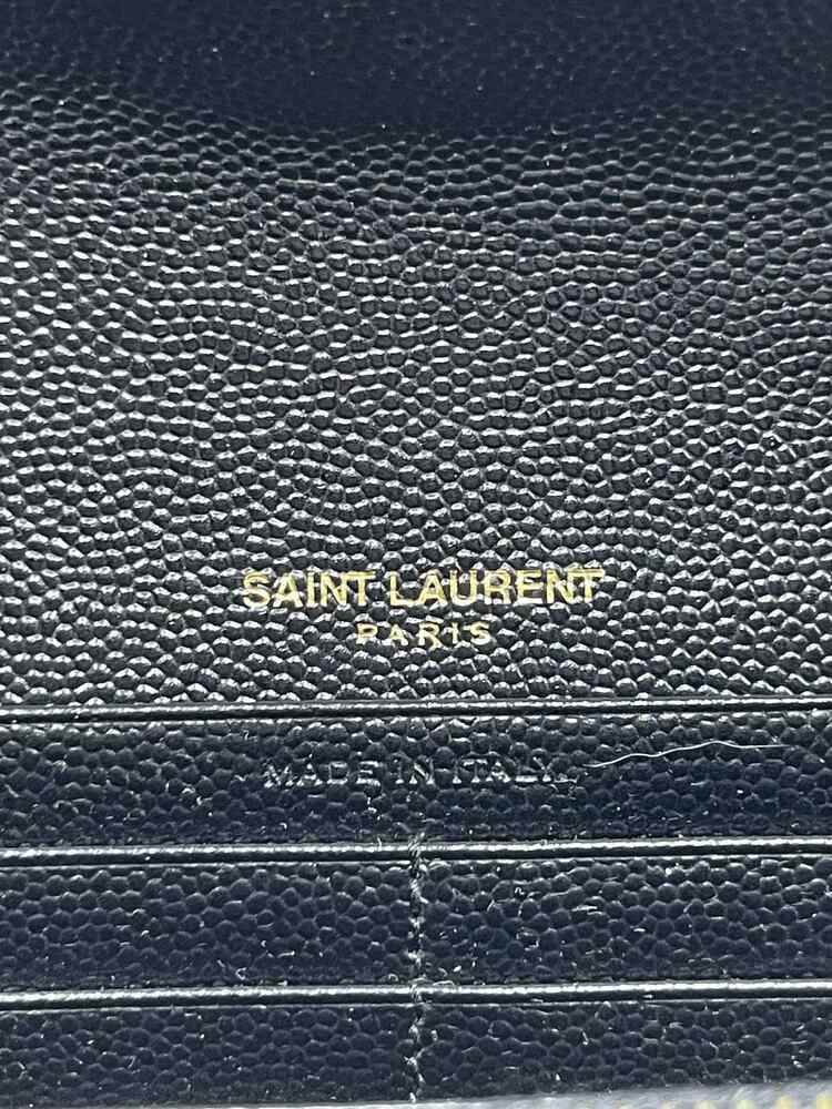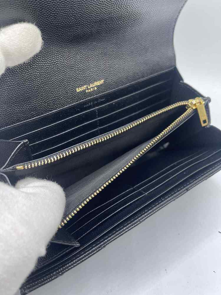 The Yves Saint Laurent YSL Monogram Large Flap Wallet in Grained Leather is in good condition. The YSL logo hardware has scratcheson it. The rest of the exterior of the wallet is in good condition. The flap has marks from the zipper pushing against the leather. The bag comes with box, dustbag, and a COA from Entrupy. The overall condition of the wallet is a (A).